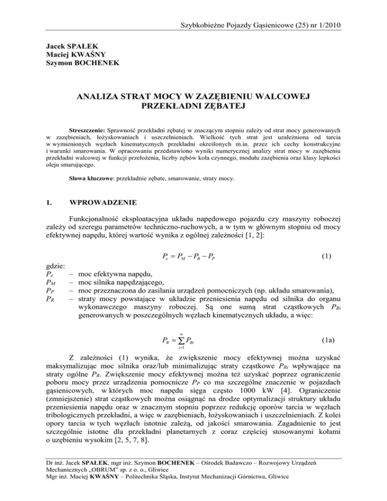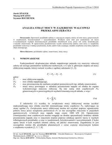 Szybkobieżne Pojazdy Gąsienicowe (25) nr 1/2010 Jacek SPAŁEK Maciej KWAŚNY Szymon BOCHENEK ANALIZA STRAT MOCY W ZAZĘBIENIU WALCOWEJ PRZEKŁADNI ZĘBATEJ Streszczenie: Sprawność przekładni zębatej w znaczącym stopniu zależy od strat mocy generowanych w zazębieniach, łożyskowaniach i uszczelnieniach. Wielkość tych strat jest uzależniona od tarcia w wymienionych węzłach kinematycznych przekładni określonych m.in. przez ich cechy konstrukcyjne i warunki smarowania. W opracowaniu przedstawiono wyniki numerycznej analizy strat mocy w zazębieniu przekładni walcowej w funkcji przełożenia, liczby zębów koła czynnego, modułu zazębienia oraz klasy lepkości oleju smarującego. Słowa kluczowe: przekładnie zębate, smarowanie, straty mocy. 1. WPROWADZENIE Funkcjonalność eksploatacyjna układu napędowego pojazdu czy maszyny roboczej zależy od szeregu parametrów techniczno-ruchowych, a w tym w głównym stopniu od mocy efektywnej napędu, której wartość wynika z ogólnej zależności [1, 2]: Pe PM PR PP gdzie: Pe PM PP PR – – – – (1) moc efektywna napędu, moc silnika napędzającego, moc przeznaczona do zasilania urządzeń pomocniczych (np. układu smarowania), straty mocy powstające w układzie przeniesienia napędu od silnika do organu wykonawczego maszyny roboczej. Są one sumą strat cząstkowych PRi generowanych w poszczególnych węzłach kinematycznych układu, a więc: n PR PRi (1a) i 1 Z zależności (1) wynika, że zwiększenie mocy efektywnej można uzyskać maksymalizując moc silnika oraz/lub minimalizując straty cząstkowe PRi wpływające na straty ogólne PR. Zwiększenie mocy efektywnej można też uzyskać poprzez ograniczenie poboru mocy przez urządzenia pomocnicze PP co ma szczególne znaczenie w pojazdach gąsienicowych, w których moc napędu sięga często 1000 kW [4]. Ograniczenie (zmniejszenie) strat cząstkowych można osiągnąć na drodze optymalizacji struktury układu przeniesienia napędu oraz w znacznym stopniu poprzez redukcję oporów tarcia w węzłach tribologicznych przekładni, a więc w zazębieniach, łożyskowaniach i uszczelnieniach. Z kolei opory tarcia w tych węzłach istotnie zależą, od jakości smarowania. Zagadnienie to jest szczególnie istotne dla przekładni planetarnych z coraz częściej stosowanymi kołami o uzębieniu wysokim [2, 5, 7, 8]. Dr inż. Jacek SPAŁEK, mgr inż. Szymon BOCHENEK – Ośrodek Badawczo – Rozwojowy Urządzeń Mechanicznych „OBRUM” sp. z o. o., Gliwice Mgr inż. Maciej KWAŚNY – Politechnika Śląska, Instytut Mechanizacji Górnictwa, Gliwice Jacek Spałek, Szymon Bochenek, Maciej Kwaśny Straty mocy w przekładni zębatej PV (zarówno klasycznej, jak i planetarnej) są sumą strat w zazębieniu PVZ, łożyskowaniu PVL, uszczelnieniach PVD oraz układach pomocniczych (np. pompa oleju, wentylator) PVX, co można zapisać w postaci: PV PVZ PVL PVD PVX (2) Straty w zazębieniach i łożyskowaniach można uważać jako wynikające z biegu jałowego PVO oraz z przenoszenia obciążenia roboczego PVP, czyli: PVZ PVZO PVZP , PVL PVLO PVLP (3) Współczynnik strat ogólnych V definiowany jest zazwyczaj jako: V PV PM (4) Na rysunku 1 dla przykładowej przekładni zębatej przedstawiono przebiegi współczynnika strat mocy w zazębieniach (VZ0 i VZP) i łożyskowaniach (VL0 i VLP) dla „biegu” jałowego i pod obciążeniem roboczym. Rys. 1. Ilustracja współczynnika strat w zazębieniach i łożyskowaniach (PVZ i PVL) dla przykładowej przekładni zębatej Na rysunku 1 widoczne jest, że w sumarycznych stratach mocy w zazębieniu znaczące są straty spowodowane obciążeniem roboczym, a straty bez obciążenia są kilkakrotnie mniejsze, podczas gdy dla tocznych łożyskowań wałów głównymi są straty generowane w fazie ich pracy bez obciążenia roboczego. Analiza strat mocy w zazębieniu walcowej przekładni zębatej 2. STRATY MOCY W ZAZĘBIENIU OBCIĄŻONYM Straty w zazębieniu przekładni zębatej przy przenoszonej mocy nominalnej PN można określić jako [2]: PZ PN mz HV (5) gdzie: PZ – moc strat w zazębieniu, μmz – średni współczynnik tarcia w zazębieniu, HV – współczynnik strat w zazębieniu zależny od postaci zazębienia [3] oraz cech materiałowych współpracujących kół [6]. Średnią wartość współczynnika tarcia na odcinku zazębienia pary kół można określić z zależności [2]: mz F K A bz b 0,045 vm m 0, 2 (6) M 0,05 X R X L gdzie: μmz – średnia wartość współczynnika tarcia zależna od rodzaju oleju; z badań wynika, że dla oleju mineralnego w klasach lepkości VG 100÷220 wartość μmz=0,04, a dla olejów syntetycznych w klasach lepkości VG 68÷220 wartość μmz=0,028÷0,037, Fbz/b – jednostkowa siła normalna w zazębieniu odniesiona do szerokości koła zębatego b, KA – współczynnik zastosowania (przeciążenia) przekładni, vΣm – sumaryczna prędkość obwodowa koła zębatego v∑m = 2 vw ∙ sinαt, przy czym: vw, αt – odpowiednio: prędkość i kąt przyporu na średnicy tocznej dw1, ρm – zastępczy promień krzywizny zarysów zębów: m 1 dW 1 sin t u 1 , przy 2 ηM γ XR u 1 cos b czym: u – przełożenie danego stopnia, βb – kąt pochylenia linii zębów, – współczynnik lepkości dynamicznej strugi oleju w temperaturze roboczej, m vb , przy czym: vb – lepkość kinematyczna oleju w temperaturze roboczej, – gęstość oleju w temperaturze roboczej (zazwyczaj γ = 870÷940 kg/m3), – współczynnik chropowatości powierzchni zębów zębnika (Ra1) i koła (Ra2): 0 , 25 XL R 1 X R 3,8 a , przy czym Ra Ra1 Ra 2 , 2 dW 1 – współczynnik rodzaju oleju; dla oleju mineralnego można przyjąć XL=1,0; dla oleju polialfaoleinowego lub estrowego XL=0,8 a dla oleju poliglikolowego (bezwodnego) XL=0,6. Z analizy zależności (6) i wielkości ją określających wynika, że: współczynnik tarcia istotnie zależy od rodzaju oleju smarującego. Zastosowanie oleju syntetycznego może spowo