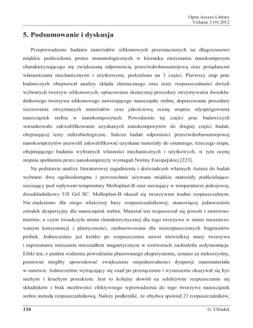 Open Access Library Volume 3 (9) 2012 5. Podsumowanie i dyskusja Przeprowadzone badania materiaŽów silikonowych przeznaczonych na dŽugoczasowe miCkkie podWcielenia protez stomatologicznych w kierunku otrzymania nanokompozytu charakteryzuj>cego siC zwiCkszon> odpornoWci> przeciwdrobnoustrojow> oraz poc>danymi wŽasnoWciami mechanicznymi i ucytkowymi, podzielono na 3 czCWci. Pierwszy etap prac badawczych obejmowaŽ analizy skŽadu chemicznego oraz testy rozpuszczalnoWci dwóch wybranych tworzyw silikonowych, opracowanie skutecznej procedury otrzymywania dwuskŽadnikowego tworzywa silikonowego zawieraj>cego nanocz>stki srebra, dopracowanie procedury sieciowania otrzymanych materiaŽów oraz jakoWciow> ocenC stopnia zdyspergowania nanocz>stek srebra w nanokompozytach. Powodzenie tej czCWci prac badawczych warunkowaŽo zakwalifikowanie uzyskanych nanokompozytów do drugiej czCWci badaM, obejmuj>cej testy mikrobiologiczne. Sukces badaM odpornoWci przeciwdrobnoustrojowej nanokompozytów pozwoliŽ zakwalifikowa5 uzyskane materiaŽy do ostatniego, trzeciego etapu, obejmuj>cego badania wybranych wŽasnoWci mechanicznych i ucytkowych, w tym ocenC stopnia speŽnienia przez nanokompozyty wymagaM Normy Europejskiej [223]. Na podstawie analizy literaturowej zagadnienia i doWwiadczeM wŽasnych Autora do badaM wybrano dwa ogólnodostCpne i powszechnie ucywane miCkkie materiaŽy podWcielaj>ce: sieciuj>cy pod wpŽywem temperatury Molloplast-B oraz sieciuj>cy w temperaturze pokojowej, dwuskŽadnikowy Ufi Gel SC. Molloplast-B okazaŽ siC tworzywem trudno rozpuszczalnym. Nie znaleziono dla niego wŽaWciwej bazy rozpuszczalnikowej, stanowi>cej jednoczeWnie oWrodek dyspersyjny dla nanocz>stek srebra. MateriaŽ ten rozpuszczaŽ siC powoli i nierównomiernie, o czym WwiadczyŽa utrata charakterystycznej dla tego tworzywa w stanie nieusieciowanym konsystencji i plastycznoWci, zaobserwowana dla nierozpuszczonych fragmentów próbek. JednoczeWnie juc krótko po rozpuszczeniu nawet niewielkiej masy tworzywa i zaprzestaniu mieszania mieszadŽem magnetycznym w roztworach zachodziŽa sedymentacja. Efekt ten, z punktu widzenia powodzenia planowanego eksperymentu, uznano za niekorzystny, poniewac mógŽby spowodowa5 zwiCkszenie niejednorodnoWci dyspersji nanomateriaŽu w osnowie. JednoczeWnie wytr>caj>cy siC osad po przes>czeniu i wysuszeniu okazywaŽ siC by5 suchym i kruchym proszkiem. Jest to kolejny dowód na selektywne rozpuszczanie siC skŽadników i brak mocliwoWci efektywnego wprowadzenia do tego tworzywa nanocz>stek srebra metod> rozpuszczalnikow>. Nalecy podkreWli5, ce obydwa spoWród 21 rozpuszczalników, 116 G. Chladek MateriaŽy nanokompozytowe ulepszane nanosrebrem na dŽugoczasowe miCkkie podWcielenia protez stomatologicznych które wzglCdnie dobrze rozpuWciŽy poddany testom materiaŽ, s> substancjami toksycznymi. Tetrahydrofuran cechuje siC duc> zdolnoWci> do penetracji i uszkadzania tkanek miCkkich, a jego opary uszkadzaj> bŽonC Wluzow> nosa, wywoŽuj>c krwawienie. WpŽywa takce niekorzystnie na oczy i ukŽad oddechowy. Tetrahydrofuran wykazuje ponadto potencjalnie niebezpieczn> w trakcie prac laboratoryjnych tendencjC do przemiany w nadtlenki, które wybuchaj> w trakcie podgrzewania. Chloroform wywoŽuje podracnienia oczu i skóry, jest toksyczny po poŽkniCciu i przy wchŽanianiu drogami oddechowymi, dziaŽa depresyjnie, powoduj>c nawet trwaŽe zmiany w obrCbie ukŽadu nerwowego, uszkadza w>trobC, nerki, prawdopodobnie wykazuje wŽasnoWci rakotwórcze. W zwi>zku z powycszym Molloplast-B zdyskwalifikowano z dalszych prac badawczych. Natomiast bardzo dobr> rozpuszczalnoW5 uzyskano dla obydwóch skŽadników Ufi Gel SC w oWmiu rozpuszczalnikach (czterech polarnych i czterech niepolarnych), przy czym skŽadnik „baza” rozpuszczaŽ siC nieco szybciej. SpoWród rozpuszczalników polarnych, w których Žatwiej jest wytworzy5 stabilne zawiesiny nanocz>stek srebra, do dalszych testów wytypowano heksan, poniewac niska temperatura wrzenia heksanu, wynosz>c> 68°C, uŽatwiŽa odparowanie rozpuszczalnika z otrzymywanych skŽadników nanokompozytów. PozostaŽe skuteczne niepolarne rozpuszczalniki miaŽy znacznie wycsze temperatury wrzenia, wynosz>ce kolejno: heptan – 98 °C, toluen – 111°C i ksylen – od 137 do 143°C [217-220]. Heksan jest jednoczeWnie najmniej toksyczny spoWród wycej wymienionych czterech substancji (rozdziaŽ 4, tablica 4.5). Jest to istotne ze wzglCdu na planowane przeznaczenie materiaŽu, dla osób prowadz>cych badania laboratoryjne oraz z przyczyn ekologicznych. JednoczeWnie na podstawie analizy widm 1H NMR skŽadników tworzywa przeprowadzonej po próbnym odparowaniu heksanu, nie stwierdzono zmian skŽadu chemicznego, w porównaniu do materiaŽu w stanie wyjWciowym, co wskazaŽo na duce prawdopodobieMstwo sukcesu dalszych badaM. Na podstawie przeprowadzonych eksperymentów, w ramach których przetestowano piC5 rócnych metod odparowywania rozpuszczalnika z roztworu kompozycji, opracowano finaln> procedurC, która pozwalaŽa na wykonywanie przeznaczonych do wszystkich kolejnych badaM skŽadników nanokompozytu z zawartoWci jednego kartusza skŽadnika materiaŽu podWcielaj>cego. UdziaŽy masowe nanocz>stek srebra w skŽadnikach tworzywa wynosiŽy 10, 20, 40, 80, 120 i 200 ppm. Procedura ta byŽa dwuetapowa. ObejmowaŽa wstCpne zagCszczanie otrzymywanych skŽadników na wyparce rotacyjnej pod ciWnieniem 0,01 MPa i kontynuowanie odparowywania na szalce Petriego w temperaturze 50°C. Dla wycszych udziaŽów masowych nanocz>stek 5. Podsumowanie i dyskusja 117 Open Access Library Volume 3 (9) 2012 srebra stosowano dŽucsze czasy zagCszczania na wyparce, ze wzglCdu na wiCksz> masC heksanu wprowadzanego z nanocz>stkami srebra. OczywiWcie, mocliwym byŽo np. odparowanie caŽoWci rozpuszczalnika na wyparce rotacyjnej, jednak podstawow> przyczyn> przemawiaj>c> za kontynuowaniem usuwania heksanu na szalkach, byŽo zmniejszenie strat materiaŽu. Ewentualne wyjCcie nanokompozytu z kolby okr>g
