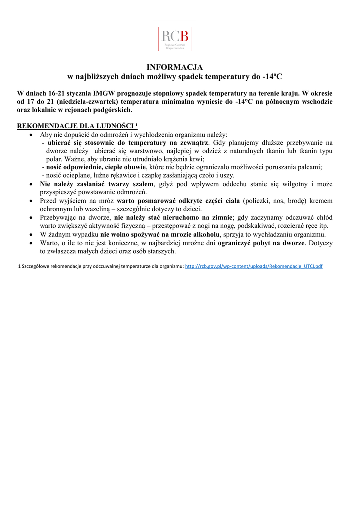 INFORMACJA w najbliższych dniach możliwy spadek temperatury do -14ºC W dniach 16-21 stycznia IMGW prognozuje stopniowy spadek temperatury na terenie kraju. W okresie od 17 do 21 (niedziela-czwartek) temperatura minimalna wyniesie do -14°C na północnym wschodzie oraz lokalnie w rejonach podgórskich. REKOMENDACJE DLA LUDNOŚCI ¹ Aby nie dopuścić do odmrożeń i wychłodzenia organizmu należy: - ubierać się stosownie do temperatury na zewnątrz. Gdy planujemy dłuższe przebywanie na dworze należy ubierać się warstwowo, najlepiej w odzież z naturalnych tkanin lub tkanin typu polar. Ważne, aby ubranie nie utrudniało krążenia krwi; - nosić odpowiednie, ciepłe obuwie, które nie będzie ograniczało możliwości poruszania palcami; - nosić ocieplane, luźne rękawice i czapkę zasłaniającą czoło i uszy. Nie należy zasłaniać twarzy szalem, gdyż pod wpływem oddechu stanie się wilgotny i może przyspieszyć powstawanie odmrożeń. Przed wyjściem na mróz warto posmarować odkryte części ciała (policzki, nos, brodę) kremem ochronnym lub wazeliną – szczególnie dotyczy to dzieci. Przebywając na dworze, nie należy stać nieruchomo na zimnie; gdy zaczynamy odczuwać chłód warto zwiększyć aktywność fizyczną – przestępować z nogi na nogę, podskakiwać, rozcierać ręce itp. W żadnym wypadku nie wolno spożywać na mrozie alkoholu, sprzyja to wychładzaniu organizmu. Warto, o ile to nie jest konieczne, w najbardziej mroźne dni ograniczyć pobyt na dworze. Dotyczy to zwłaszcza małych dzieci oraz osób starszych. 1 Szczegółowe rekomendacje przy odczuwalnej temperaturze dla organizmu: http://rcb.gov.pl/wp-content/uploads/Rekomendacje_UTCI.pdf