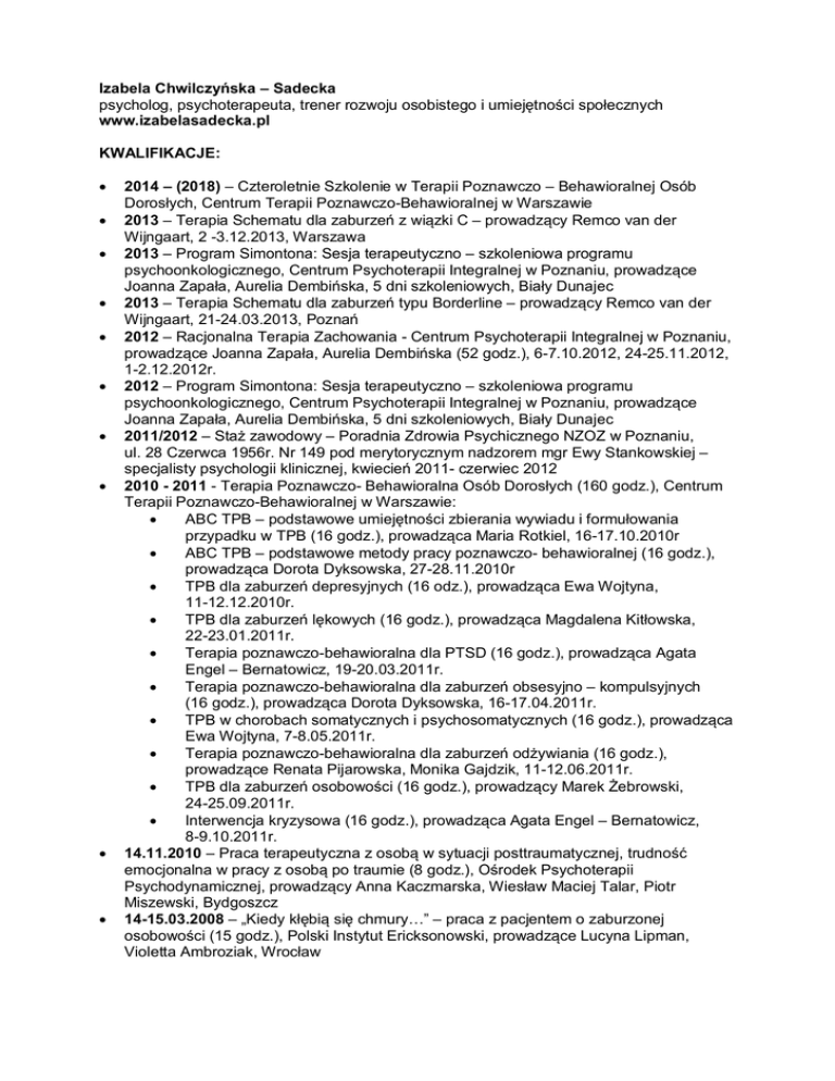 Izabela Chwilczy ska – Sadecka psycholog, psychoterapeuta, trener rozwoju osobistego i umiej tno ci spo ecznych www.izabelasadecka.pl KWALIFIKACJE: 2014 – (2018) – Czteroletnie Szkolenie w Terapii Poznawczo – Behawioralnej Osób Doros ych, Centrum Terapii Poznawczo-Behawioralnej w Warszawie 2013 – Terapia Schematu dla zaburze z wi zki C – prowadz cy Remco van der Wijngaart, 2 -3.12.2013, Warszawa 2013 – Program Simontona: Sesja terapeutyczno – szkoleniowa programu psychoonkologicznego, Centrum Psychoterapii Integralnej w Poznaniu, prowadz ce Joanna Zapa a, Aurelia Dembi ska, 5 dni szkoleniowych, Bia y Dunajec 2013 – Terapia Schematu dla zaburze typu Borderline – prowadz cy Remco van der Wijngaart, 21-24.03.2013, Pozna 2012 – Racjonalna Terapia Zachowania - Centrum Psychoterapii Integralnej w Poznaniu, prowadz ce Joanna Zapa a, Aurelia Dembi ska (52 godz.), 6-7.10.2012, 24-25.11.2012, 1-2.12.2012r. 2012 – Program Simontona: Sesja terapeutyczno – szkoleniowa programu psychoonkologicznego, Centrum Psychoterapii Integralnej w Poznaniu, prowadz ce Joanna Zapa a, Aurelia Dembi ska, 5 dni szkoleniowych, Bia y Dunajec 2011/2012 – Sta zawodowy – Poradnia Zdrowia Psychicznego NZOZ w Poznaniu, ul. 28 Czerwca 1956r. Nr 149 pod merytorycznym nadzorem mgr Ewy Stankowskiej – specjalisty psychologii klinicznej, kwiecie 2011- czerwiec 2012 2010 - 2011 - Terapia Poznawczo- Behawioralna Osób Doros ych (160 godz.), Centrum Terapii Poznawczo-Behawioralnej w Warszawie: ABC TPB – podstawowe umiej tno ci zbierania wywiadu i formu owania przypadku w TPB (16 godz.), prowadz ca Maria Rotkiel, 16-17.10.2010r ABC TPB – podstawowe metody pracy poznawczo- behawioralnej (16 godz.), prowadz ca Dorota Dyksowska, 27-28.11.2010r TPB dla zaburze depresyjnych (16 odz.), prowadz ca Ewa Wojtyna, 11-12.12.2010r. TPB dla zaburze l kowych (16 godz.), prowadz ca Magdalena Kit owska, 22-23.01.2011r. Terapia poznawczo-behawioralna dla PTSD (16 godz.), prowadz ca Agata Engel – Bernatowicz, 19-20.03.2011r. Terapia poznawczo-behawioralna dla zaburze obsesyjno – kompulsyjnych (16 godz.), prowadz ca Dorota Dyksowska, 16-17.04.2011r. TPB w chorobach somatycznych i psychosomatycznych (16 godz.), prowadz ca Ewa Wojtyna, 7-8.05.2011r. Terapia poznawczo-behawioralna dla zaburze od ywiania (16 godz.), prowadz ce Renata Pijarowska, Monika Gajdzik, 11-12.06.2011r. TPB dla zaburze osobowo ci (16 godz.), prowadz cy Marek ebrowski, 24-25.09.2011r. Interwencja kryzysowa (16 godz.), prowadz ca Agata Engel – Bernatowicz, 8-9.10.2011r. 14.11.2010 – Praca terapeutyczna z osob w sytuacji posttraumatycznej, trudno emocjonalna w pracy z osob po traumie (8 godz.), O rodek Psychoterapii Psychodynamicznej, prowadz cy Anna Kaczmarska, Wies aw Maciej Talar, Piotr Miszewski, Bydgoszcz 14-15.03.2008 – „Kiedy k bi si chmury…” – praca z pacjentem o zaburzonej osobowo ci (15 godz.), Polski Instytut Ericksonowski, prowadz ce Lucyna Lipman, Violetta Ambroziak, Wroc aw 2007 – 2009 – Szko a Trenerów Psychologicznego Treningu Grupowego pod nadzorem merytorycznym Polskiego Towarzystwa Psychologicznego (220 godz.), Stowarzyszenie „Doro li – Dzieciom” NPDN, prowadz ce ucja Sokorska – Maj, Ma gorzata Wojnowska, Danuta Daszkiewicz 1998 – 2004 – Akademia Bydgoska im. Kazimierza Wielkiego w Bydgoszczy - Studia magisterskie: psychologia – obrona pracy magisterskiej w 2004 r. z wynikiem bardzo dobrym Dotychczasowe do wiadczenia zawodowe: Od 2011 - Centrum Psychoterapii Integralnej – psycholog, psychoterapeuta, trener Od 2011 – Stowarzyszenie Psyche Soma Polis, Akademia Walki z Rakiem – psycholog, psychoterapeuta, prowadzenie terapii indywidualnej i grupowej osób onkologicznie chorych i osób wspieraj cych, trener warsztatów z zakresu komunikacji, umiej tno ci spo ecznych, rozwoju osobistego dla osób chorych onkologicznie, wolontariuszy i osób wspieraj cych Od 2011 – Dzienne Domy Pomocy Spo ecznej – psycholog, trener umiej tno ci spo ecznych, prowadzenie diagnozy i treningu funkcji poznawczych 2011-2012 – Poradnia Zdrowia Psychicznego NZOZ – sta zawodowy: prowadzenie diagnozy, poradnictwa psychologicznego i psychoterapii 2011 – koordynator, psycholog, trener w projekcie Polskiego Komitetu Pomocy Spo ecznej i UM Poznania - Wysoka jako ycia Seniora Od 2008 – Festiwal Progressteron – psycholog, trener, prowadzenie warsztatów rozwoju osobistego 2004-2011 – rodowiskowy Dom Samopomocy dla Osób z Zaburzeniami Psychicznymi – psycholog, trener, prowadzenie psychoterapii indywidualnej i grupowej, treningów umiej tno ci spo ecznych, diagnoza, wspó praca z instytucjami pomocy spo ecznej 2006 – psycholog, trener w projektach aktywizacji zawodowej osób zagro onych wykluczeniem spo ecznym (projekty ze rodków EFS).