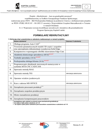 Projekt „Mech@tronic – kurs na grudziądzki przemysł” współfinansowany jest ze środków Unii Europejskiej w ramach Europejskiego Funduszu Społecznego. Projekt: „Mech@tronic – kurs na grudziądzki przemysł” współfinansowany ze środków Europejskiego Funduszu Społecznego, realizowany przez INFO – BIZ Profesjonalna Edukacja na podstawie Umowy o dofinansowanie projektu nr WDN–POKL 08.01.01 – 04-305/11 zawartej z Wojewódzkim Urzędem Marszałkowski w Toruniu w ramach Działania 8.1.1 Wspieranie rozwoju kwalifikacji zawodowych i doradztwo dla przedsiębiorstw Program Operacyjny Kapitał Ludzki FORMULARZ REKRUTACYJNY 1. Deklaruję chęć uczestnictwa w szkoleniu realizowanym w ramach projektu: * Nazwa szkolenia Zaznacz X szkolenie 3. Obsługa programu Auto CAD** Tworzenie parametrycznych modeli 3D części i zespołów oraz sporządzanie dokumentacji rysunkowej Solid Edge Komputerowe wspomaganie obróbki skrawaniem Edge Cam 4. Akademia skutecznego sprzedawcy (68 h)nowość! 5. Techniki sprzedaży (16 h) nowość! 6. Profesjonalna obsługa klienta (16 h) nowość! 7. Programowanie obrabiarek sterowanych numerycznie w systemie MTS-CNC CAD/CAM 8. Spawanie metodą MAG 9. Spawanie metodą TIG 1. 2. rekrutacja zakończona 10. Operator wózków jezdniowych 11. Kurs z zakresu MS OFFICE rekrutacja zakończona 12. Zarządzenie procesami produkcji*** 13. Zarządzanie zespołem produkcyjnym 14. Mistrz menadżerem produkcji 15. Zarządzenie kompetencjami pracowników * szczegółowy opis szkoleń na stronie www.mechatronik-grudziadz.pl ** do wyboru tylko jedno szkolenie od 1-9 *** do wyboru tylko jedno szkolenie pod warunkiem uczestnictwa w szkoleniu od 1-9 INFO – BIZ Profesjonalna Edukacja ul. Chełmińska 106A/36 86-300 Grudziądz tel./fax.: 56 461-37-09 e-mail: [email protected] INFO – BIZ Profesjonalna Edukacja Biuro Projektu ul. Chełmińska 106A/36 86-300 Grudziądz tel./fax.: 56 643 00 05 e-mail: [email protected] Strona 1 z 2 Projekt „Mech@tronic – kurs na grudziądzki przemysł” współfinansowany jest ze środków Unii Europejskiej w ramach Europejskiego Funduszu Społecznego. 2. Dane osobowe Nazwisko PESEL Imię (imiona) Data urodzenia Zamieszkanie miasto/ wieś Wykształcenie Ulica Nr domu Miejscowość Kod pocztowy Województwo Tel. domowy Adres e-mail Tel. komórkowy Nr lokalu Opieka nad dziećmi do lat 7 lub opieka nad osobą zależną: Tak Nie Status osoby na rynku pracy w chwili przystąpienia do projektu: Poziom wykształcenia, (co najwyżej średnie): Brak Podstawowe Gimnazjalne Ponadgimnazjalne /ukończenie szkoły średniej z maturą lub bez/ Pomaturalne Wyższe Zatrudniony: W tym: Rolnik Samozatrudniony Zatr. w mikroprzedsiębiorstwie Zatr. w małym przedsiębiorstwie Zatr. w średnim przedsiębiorstwie Zatr. w dużym przedsiębiorstwie Zatr. w administracji publicznej Zat. w organizacji pozarządowej Tak Nie Tak Nie Tak Nie Tak Nie Tak Nie Tak Nie Tak Nie Tak Nie Tak Nie Miejsce zatrudnienia (nazwa, adres) Oświadczam że: zamieszkuję w województwie kujawsko – pomorskim, jestem pracującą osobą dorosłą, nie uczestniczyłam/em dotychczas w szkoleniach organizowanych w ramach tego projektu, posiadam wykształcenie nie więcej niż średnie samodzielnie zgłaszam chęć i inicjatywę nabycia nowych, uzupełniania lub podwyższenia swoich kwalifikacji i umiejętności zawodowych (w formach pozaszkolnych i poza godzinami pracy) 1. Z własnej inicjatywy wyrażam zgodę na uczestnictwo w nim, 2. Nie prowadzę działalności gospodarczej, 3. Wyrażam zgodę na udział w postępowaniu rekrutacyjnym mającym określić moje predyspozycje do udziału w projekcie, 4. Mam świadomość, że szkolenie może odbywać się w miejscowości innej od mojego miejsca zamieszkania oraz poza moimi godzinami pracy. 5. Wyrażam zgodę na przetwarzanie przez INFO-BIZ Profesjonalna Edukacja moich danych osobowych dla potrzeb związanych z realizacją projektu „Mech@tronic – kurs na grudziądzki przemysł”, zgodnie z ustawą o ochronie danych osobowych (Dz. U. 1997 nr 133 poz.883). 6. Dane przedstawione w formularzu rekrutacyjnym są zgodne z prawdą. ………………………………………………… data i czytelny podpis Osoba została zakwalifikowana do udziału w realizacji projektu „Mech@tronic – kurs na grudziądzki przemysł” Osoba nie została zakwalifikowana do udziału w projekcie „Mech@tronic – kurs na grudziądzki przemysł”. Uzasadnienie: Data: Podpis osoby zatwierdzającej: Data: Podpis osoby zatwierdzającej: INFO – BIZ Profesjonalna Edukacja ul. Chełmińska 106A/36 86-300 Grudziądz tel./fax.: 56 461-37-09 e-mail: [email protected] INFO – BIZ Profesjonalna Edukacja Biuro Projektu ul. Chełmińska 106A/36 86-300 Grudziądz tel./fax.: 56 643 00 05 e-mail: [email protected] Strona 2 z 2