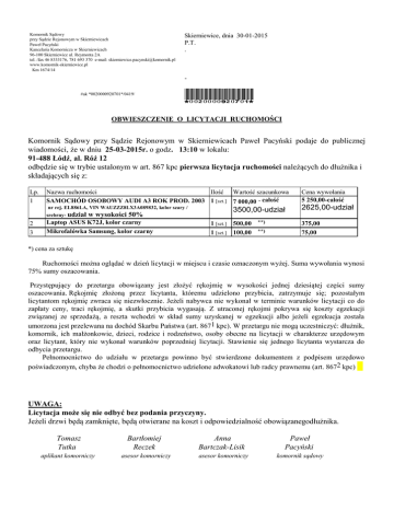 Komornik Sądowy przy Sądzie Rejonowym w Skierniewicach Paweł Pacyński Kancelaria Komornicza w Skierniewicach 96-100 Skierniewice ul. Reymonta 2A tel. /fax 46 8333176, 781 693 370 e-mail: [email protected] www.komornik-skierniewice.pl Km 1674/14 Skierniewice, dnia 30-01-2015 P.T. . #ak *0020000920701*/0419/ *0020000920701* OBWIESZCZENIE O LICYTACJI RUCHOMOŚCI Komornik Sądowy przy Sądzie Rejonowym w Skierniewicach Paweł Pacyński podaje do publicznej wiadomości, że w dniu 25-03-2015r. o godz. 13:10 w lokalu: 91-488 Łódź, al. Róż 12 odbędzie się w trybie ustalonym w art. 867 kpc pierwsza licytacja ruchomości należących do dłużnika i składających się z: Lp. 1 Nazwa ruchomości Ilość Wartość szacunkowa SAMOCHÓD OSOBOWY AUDI A3 ROK PROD. 2003 1 [szt.] 7 000,00 - całość .nr rej. EL886LA, VIN WAUZZZ8LX3A089832, kolor szary / srebrny- udział 2 3 w wysokości 50% Laptop ASUS K72J, kolor czarny Mikrofalówka Samsung, kolor czarny 3500,00-udział 1 [szt.] 500,00 1 [szt.] 100,00 **) **) Cena wywołania 5 250,00-całość 2625,00-udział 375,00 75,00 *) cena za sztukę Ruchomości można oglądać w dzień licytacji w miejscu i czasie oznaczonym wyżej. Suma wywołania wynosi 75% sumy oszacowania. Przystępujący do przetargu obowiązany jest złożyć rękojmię w wysokości jednej dziesiątej części sumy oszacowania. Rękojmię złożoną przez licytanta, któremu udzielono przybicia, zatrzymuje się; pozostałym licytantom rękojmię zwraca się niezwłocznie. Jeżeli nabywca nie wykonał w terminie warunków licytacji co do zapłaty ceny, traci rękojmię, a skutki przybicia wygasają. Z utraconej rękojmi pokrywa się koszty egzekucji związanej ze sprzedażą, a reszta wchodzi w skład sumy uzyskanej w egzekucji albo jeżeli egzekucja została umorzona jest przelewana na dochód Skarbu Państwa (art. 8671 kpc). W przetargu nie mogą uczestniczyć: dłużnik, komornik, ich małżonkowie, dzieci, rodzice i rodzeństwo, osoby obecne na licytacji w charakterze urzędowym oraz licytant, który nie wykonał warunków poprzedniej licytacji. Stawienie się jednego licytanta wystarcza do odbycia przetargu. Pełnomocnictwo do udziału w przetargu powinno być stwierdzone dokumentem z podpisem urzędowo poświadczonym, chyba że chodzi o pełnomocnictwo udzielone adwokatowi lub radcy prawnemu (art. 8672 kpc) UWAGA: Licytacja może się nie odbyć bez podania przyczyny. Jeżeli drzwi będą zamknięte, będą otwierane na koszt i odpowiedzialność obowiązanegodłużnika. Tomasz Tutka Bartłomiej Reczek Anna Bartczak-Lisik Paweł Pacyński aplikant komorniczy asesor komorniczy asesor komorniczy komornik sądowy