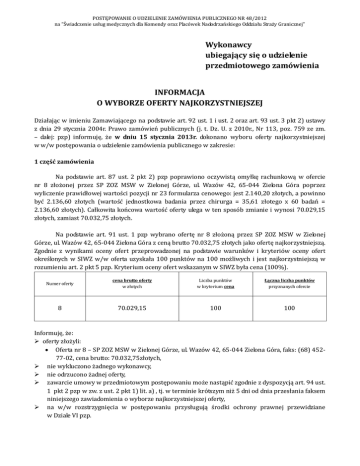 POSTĘPOWANIE O UDZIELENIE ZAMÓWIENIA PUBLICZNEGO NR 48/2012 na ”Świadczenie usług medycznych dla Komendy oraz Placówek Nadodrzańskiego Oddziału Straży Granicznej” Wykonawcy ubiegający się o udzielenie przedmiotowego zamówienia INFORMACJA O WYBORZE OFERTY NAJKORZYSTNIEJSZEJ Działając w imieniu Zamawiającego na podstawie art. 92 ust. 1 i ust. 2 oraz art. 93 ust. 3 pkt 2) ustawy z dnia 29 stycznia 2004r. Prawo zamówień publicznych (j. t. Dz. U. z 2010r., Nr 113, poz. 759 ze zm. – dalej: pzp) informuję, że w dniu 15 stycznia 2013r. dokonano wyboru oferty najkorzystniejszej w w/w postępowania o udzielenie zamówienia publicznego w zakresie: 1 część zamówienia Na podstawie art. 87 ust. 2 pkt 2) pzp poprawiono oczywistą omyłkę rachunkową w ofercie nr 8 złożonej przez SP ZOZ MSW w Zielonej Górze, ul. Wazów 42, 65-044 Zielona Góra poprzez wyliczenie prawidłowej wartości pozycji nr 23 formularza cenowego: jest 2.140,20 złotych, a powinno być 2.136,60 złotych (wartość jednostkowa badania przez chirurga = 35,61 złotego x 60 badań = 2.136,60 złotych). Całkowita końcowa wartość oferty ulega w ten sposób zmianie i wynosi 70.029,15 złotych, zamiast 70.032,75 złotych. Na podstawie art. 91 ust. 1 pzp wybrano ofertę nr 8 złożoną przez SP ZOZ MSW w Zielonej Górze, ul. Wazów 42, 65-044 Zielona Góra z ceną brutto 70.032,75 złotych jako ofertę najkorzystniejszą. Zgodnie z wynikami oceny ofert przeprowadzonej na podstawie warunków i kryteriów oceny ofert określonych w SIWZ w/w oferta uzyskała 100 punktów na 100 możliwych i jest najkorzystniejszą w rozumieniu art. 2 pkt 5 pzp. Kryterium oceny ofert wskazanym w SIWZ była cena (100%). Numer oferty cena brutto oferty w złotych Liczba punktów w kryterium cena Łączna liczba punktów przyznanych ofercie 8 70.029,15 100 100 Informuję, że: oferty złożyli: Oferta nr 8 – SP ZOZ MSW w Zielonej Górze, ul. Wazów 42, 65-044 Zielona Góra, faks: (68) 45277-02, cena brutto: 70.032,75złotych, nie wykluczono żadnego wykonawcy, nie odrzucono żadnej oferty, zawarcie umowy w przedmiotowym postępowaniu może nastąpić zgodnie z dyspozycją art. 94 ust. 1 pkt 2 pzp w zw. z ust. 2 pkt 1) lit. a) , tj. w terminie krótszym niż 5 dni od dnia przesłania faksem niniejszego zawiadomienia o wyborze najkorzystniejszej oferty, na w/w rozstrzygnięcia w postępowaniu przysługują środki ochrony prawnej przewidziane w Dziale VI pzp. POSTĘPOWANIE O UDZIELENIE ZAMÓWIENIA PUBLICZNEGO NR 48/2012 na ”Świadczenie usług medycznych dla Komendy oraz Placówek Nadodrzańskiego Oddziału Straży Granicznej” 2 część zamówienia Na podstawie art. 87 ust. 2 pkt 2) pzp poprawiono oczywistą omyłkę rachunkowa w ofercie nr 2 złożonej przez MEDICA Sp. z o.o., ul. Kupiecka 22, 65-426 Zielona Góra poprzez wyliczenie prawidłowej wartości pozycji nr 2 formularza cenowego: jest 641,50 złotych, a powinno być 704,00 złote (wartość jednostkowa badania OB = 1,10 złotego x 640 badań = 704 złotego). Całkowita końcowa wartość oferty ulega w ten sposób zmianie i wynosi 6.209,75 złotych, zamiast 6.147,25 złotych. Na podstawie art. 91 ust. 1 pzp wybrano ofertę nr 2 złożoną przez MEDICA Sp. z o.o., ul. Kupiecka 22, 65-426 Zielona Góra z ceną brutto 6.209,75 złotych jako ofertę najkorzystniejszą. Zgodnie z wynikami oceny ofert przeprowadzonej na podstawie warunków i kryteriów oceny ofert określonych w SIWZ w/w oferta uzyskała 100 punktów na 100 możliwych i jest najkorzystniejszą w rozumieniu art. 2 pkt 5 pzp. Kryterium oceny ofert wskazanym w SIWZ była cena (100%). Numer oferty cena brutto oferty w złotych Liczba punktów w kryterium cena Łączna liczba punktów przyznanych ofercie 2 6.209,75 100 100 6 15.594,00 39,82 39,82 9 6.500,70 95,52 95,52 Informuję, że: oferty złożyli: Oferta nr 2 – MEDICA Sp. z o.o., ul. Kupiecka 22, 65-426 Zielona Góra, faks: (68) 457-89-82, cena brutto: 6.147,25 złotych, Oferta nr 6 – Nowy Szpital Powiatu Krośnieńskiego Sp. z o.o., ul. Piastów 3, 66-600 Krosno Odrzańskie, faks: (68) 383-53-28, cena brutto: 15.594,00 złote, Oferta nr 9 – SYNEVO Polska Sp. z o.o., ul. Dzika 4, 00-194 Warszwa, faks: (22) 612-40-74, cena brutto: 6.500,70, nie wykluczono żadnego wykonawcy, nie odrzucono żadnej oferty, zawarcie umowy w przedmiotowym postępowaniu może nastąpić zgodnie z dyspozycją art. 94 ust. 1 pkt 2 pzp w zw. z ust. 2 pkt 3) lit. a) , tj. w terminie krótszym niż 5 dni od dnia przesłania faksem niniejszego zawiadomienia o wyborze najkorzystniejszej oferty, na w/w rozstrzygnięcia w postępowaniu przysługują środki ochrony prawnej przewidziane w Dziale VI pzp. 3 część zamówienia Na podstawie art. 91 ust. 1 pzp wybrano ofertę nr 5 złożoną przez Edytę Orłowską prowadzącą działalność gospodarczą pod firmą Gabinet Stomatologiczny Edyta Orłowska, ul. Jana Matejki 2a/2, 66-600 Krosno Odrzańskie z ceną brutto 12.860,00 złotych jako ofertę najkorzystniejszą. Zgodnie z wynikami oceny ofert przeprowadzonej na podstawie warunków i kryteriów oceny ofert określonych w SIWZ w/w oferta uzyskała 100 punktów na 100 możliwych i jest najkorzystniejszą w rozumieniu art. 2 pkt 5 pzp. Kryterium oceny ofert wskazanym w SIWZ była cena (100%). POSTĘPOWANIE O UDZIELENIE ZAMÓWIENIA PUBLICZNEGO NR 48/2012 na ”Świadczenie usług medycznych dla Komendy oraz Placówek Nadodrzańskiego Oddziału Straży Granicznej” Numer oferty cena brutto oferty w złotych Liczba punktów w kryterium cena Łączna liczba punktów przyznanych ofercie 5 12.860,00 100 100 Informuję, że: oferty złożyli: Oferta nr 5 – Edytę Orłowską prowadzącą działalność gospodarczą pod firmą Gabinet Stomatologiczny Edyta Orłowska, ul. Jana Matejki 2a/2, 66-600 Krosno Odrzańskie, faks: (68) 383-40-80, cena brutto: 12.860,00 złotych, nie wykluczono żadnego wykonawcy, nie odrzucono żadnej oferty, zawarcie umowy w przedmiotowym postępowaniu może