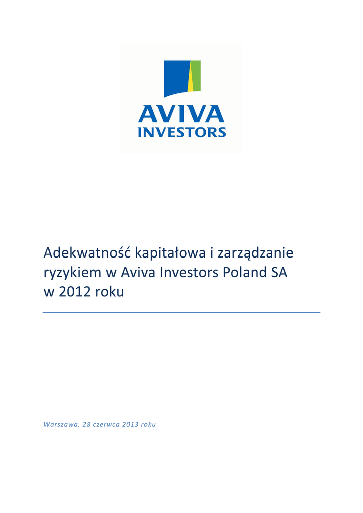 Warszawa, 28 czerwca 2013 roku Spis treści WPROWADZENIE ____________________________________________________________________________ 3 PODSTAWOWE INFORMACJE O DOMU MAKLERSKIM ____________________________________________________ 3 POLITYKA ORAZ STRATEGIA ZARZĄDZANIA RYZYKIEM W AIP SA _____________________________________________ 4 ODPOWIEDZIALNOŚĆ _________________________________________________________________________ 5 ZARZĄDZANIE POSZCZEGÓLNYMI RODZAJAMI RYZYKA ____________________________________________________ 7 Ryzyko kredytowe _______________________________________________________________________ 8 Ryzyko koncentracji zaangażowań __________________________________________________________ 9 Ryzyko operacyjne _____________________________________________________________________ 10 Ryzyko płynności _______________________________________________________________________ 13 Ryzyko kredytowe kontrahenta ___________________________________________________________ 13 POZYCJE I SKŁADNIKI KAPITAŁÓW NADZOROWANYCH ___________________________________________________ 15 ADEKWATNOŚĆ KAPITAŁOWA AIP SA _____________________________________________________________ 16 Filar I ________________________________________________________________________________ 16 Filar II ________________________________________________________________________________ 19 ADEKWATNOŚĆ KAPITAŁOWA I ZARZĄDZANIE RYZYKIEM - PODSUMOWANIE ____________________________________ 19 INFORMACJE W ZAKRESIE POLITYKI ZMIENNYCH SKŁADNIKÓW WYNAGRODZEŃ OSÓB ZAJMUJĄCYCH STANOWISKA KIEROWNICZE W AVIVA INVESTORS POLAND SA __________________________________________________________________ 21 Sposób opracowywania, zatwierdzania, wdrażania i aktualizacji Polityki __________________________ 21 Kryteria i sposób kształtowania zmiennych składników wynagrodzeń _____________________________ 22 Osiągnięte wyniki, które stanowią podstawę otrzymania przez każdą osobę instrumentów finansowych, których wartość jest powiązana z sytuacją finansową Spółki ____________________________________ 24 Informacje ilościowe ogółem wysokości wynagrodzeń, w podziale na linie biznesowe oraz informacje ilościowe ogółem o wynagrodzeniach osób zajmujących stanowiska kierownicze, w podziale na grupy __ 25 Adekwatność kapitałowa i zarządzanie ryzykiem w AIP SA w 2012 2 Wprowadzenie Publikacja niniejszego raportu związana jest ze spełnieniem przez Aviva Investors Poland SA (dalej „AIP SA” lub „Dom Maklerski”) obowiązków wynikających z Rozporządzenia Ministra Finansów z dnia 26 listopada 2009 r. w sprawie upowszechniania informacji związanych z adekwatnością kapitałową (Dz. U. Nr 210, poz. 1615, z późn.zm.) (dalej „Rozporządzenie w sprawie upowszechniania informacji). Informacje w zakresie adekwatności kapitałowej Aviva Investors Poland SA upowszechniane są przynajmniej raz na rok. Prezentowane w niniejszym raporcie informacje dotyczące adekwatności kapitałowej przygotowane zostały na podstawie danych według stanu na dzień 31 grudnia 2012 roku. Zakres oraz zasady upowszechniania informacji umieszczone zostały w „Polityce Informacyjnej Aviva Investors Poland SA” opublikowanej na stronie internetowej AIP SA http://www.avivainvestors.pl/aviva-investors-poland-sa.htm. Informacje wskazane w wyżej wymienionej polityce Dom Maklerski publikuje na stronie internetowej najpóźniej w terminie 30 dni od zatwierdzenia rocznego sprawozdania finansowego przez Walne Zgromadzenie Domu Maklerskiego. Walne Zgromadzenie zatwierdzające sprawozdanie finansowe za rok 2012 odbyło się w dniu 29 maja 2013 roku. Podstawowe informacje o Domu Maklerskim Aviva Investors Poland S.A. z siedzibą w Warszawie, przy ul. Domaniewskiej 44, (poprzednia firma spółki „Commercial Union Investment Management (Polska) S.A.”) została utworzona Aktem Notarialnym z dnia 15 października 1998 roku i zarejestrowana w Sądzie Rejestrowym dla m.st. Warszawy w dniu 18 listopada 1998 roku, a w dniu 29 czerwca 2001 roku wpisana do rejestru przedsiębiorców Krajowego Rejestru Sądowego prowadzonego przez Sąd Rejonowy dla m. st. Warszawy XIX (obecnie XIII) Wydział Gospodarczy Krajowego Rejestru Sądowego pod numerem KRS 0000021359. Nadzwyczajne Walne Zgromadzenie w dniu 4 sierpnia 2008 roku uchwałą numer 1 zmieniło statut Commercial Union Investment Management (Polska) S.A. w ten sposób, że Spółka ma działać pod firmą Aviva Investors Poland S.A. (akt notarialny: Rep. A nr 17152/2008). Wyżej wymieniona zmiana została zarejestrowana postanowieniem Sądu Rejonowego dla m. st. Warszawy XII Wydział Gospodarczy dnia 29 września 2008 roku (Sygn. sprawy WA.XIINS-Rej KRS/024412/08849). Czas trwania Spółki jest nieoznaczony. Adekwatność kapitałowa i zarządzanie ryzykiem w AIP SA w 2012 3 Aviva Investors Poland S.A. jest podmiotem prowadzącym działalność maklerską zgodnie z art. 69 ustawy z dnia 29 lipca 2005 roku o obrocie instrumentami finansowymi (j.t. Dz. U. z 2010 r., Nr 211, poz. 1384, z późn.zm.). Zakres działalności maklerskiej prowadzonej przez Aviva Investors Poland S.A., według stanu na dzień 31 grudnia 2012 roku, ograniczony jest do: 1. wykonywania czynności polegających na zarządzaniu portfelami, w skład których wchodzi jeden lub większa liczba instrumentów finansowych, przy czym ww. usługi maklerskie, świadczone są jedynie podmiotom należącym do Grupy Aviva 2. nabywania i zbywania na własny rachunek instrumentów finansowych. Aviva Investors Poland S.A. nie posiada podmiotów zależnych, wobec powyższego nie dokonuje konsolidacji pełnej, konsolidacji proporcjonalnej, jak również pomniejszenia poziomu kapitałów nadzorowanych w związku z ekspozycją wobec podmiotów, które pomniejszałyby ww. kapitały, zgodnie z postanowieniami Rozporządzenia Ministra Finansów z dnia 18 listopada 2009 r. w sprawie zakresu i szczegółowych zasad wyznaczania całkowitego wymogu