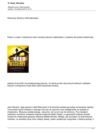 R. Reed, Wściekły Wpisany przez Administrator sobota, 10 sierpnia 2013 10:14 Recenzja Adrianny Michalewskiej Kiedy w małym miasteczku ktoś morduje starsze małżeństwo i zostawia dla policji wiadomość, władze Evansville nie podejrzewają jeszcze, że staną przed całą serią brutalnych zabójstw, których rozwiązanie może kilka osób kosztować karierę. Jack Murphy i jego partner Lidell Blanchard w Evansville podejmują próbę schwytania zabójcy. Tymczasem ginie chłopiec o którego nikt się nie upomina oraz pielęgniarka ze szpitala w miasteczku. Wszyscy podejrzewają, i słusznie, że na tym się nie skończy. Przy każdych zwłokach morderca zostawia fragment bajeczki Babci Gąski, a zapowiedź kolejnej zbrodni wysyła do miejscowej gwiazdy telewizji Maddy Brooks. Maddy, jak przystało na dziennikarkę newsów, za wszelką cenę chce zdobyć sławę, zatem podejmuje rozgrywkę z lokalną policją i z 1/3 R. Reed, Wściekły Wpisany przez Administrator sobota, 10 sierpnia 2013 10:14 bandytą. Kiedy morderca szykuje kolejne zabójstwa pojawiają się podejrzenia, że nie działa on sam. Są to w istocie bracia - Bobby i Eddie. Jasno dają do zrozumienia, że chodzi im o głowę Jacka, który w przeszłości już raz skrzyżował swoje drogi z ich szlakami. Problem jednak w tym, że wówczas Jack zastrzelił Bobby'ego. Czyżby morderca zmartwychwstał? Zaproszony do współpracy z Jackiem psychiatra i cały zespół operacyjny stają tymczasem w obliczu kolejnych kłopotów. Na szczytach władzy, zarówno w policji jak i w ratuszu, trwają przepychanki, których celem jest zdobycie kolejnych stołków a sprawa masowych morderstw ma stanowić do tego mocną trampolinę. Dlatego Jack musi walczyć z mordercami, z przełożonymi, i z dziennikarką, która za wszelką cenę chce awansować do nowojorskiej telewizji, choćby miała współpracować z samym diabłem. Dodatkowo masa procedur policyjnych i brak wsparcia praktycznie z każdej strony powodują, że Jack zostaje na polu walki prawie sam. Wspiera go Lidell, który jest nie tylko oddanym partnerem, ale także przyjacielem, gotowym wiele poświęcić, aby Jack nie poległ w tej rozgrywce. Nie ma w sobie nic z giermka, jest przewidującym i zaradnym człowiekiem, równie mocno zaangażowanym w sprawę jak Murphy. I tak naprawdę to jedyny prawdziwy sprzymierzeniec policjanta, któremu nie wiedzie się w życiu osobistym, a jego kariera staje pod znakiem zapytania. Na szczęście jest jeszcze współwłaścicielem restauracji "U Dwóch Jake'ów", której połowę odziedziczył po ojcu, także 2/3 R. Reed, Wściekły Wpisany przez Administrator sobota, 10 sierpnia 2013 10:14 policjancie. Uderza dokładność, z jaką Reed opisuje tę akcję polowania na seryjnego zabójcę. Nic w tym dziwnego, gdyż autor, Rick Reed, sam przez trzydzieści lat zajmował się takimi sprawami zawodowo. Jego pierwsza powieść "Blood trial" to historia poszukiwań przestępcy, w których Reed osobiście brał udział. Ścigał człowieka mającego na sumieniu 14 osób. Ujęto go w 2000 roku i w 2001 usłyszał wyrok skazujący na dożywocie. Rick Reed jest dodatkowo specjalistą od negocjacji z porywaczami i fachowcem od deszyfracji pisma odręcznego. "Wściekły" to pierwsza z serii powieści o Jacku Murphym, policjancie z Evansville w stanie Indiana. Kolejna - "The Coldest Fear" nie została jeszcze w Polsce przetłumaczona. Jack Murphy to bohater w stylu Brudnego Harry'ego, czy Johna Mc'Clane z Nothing last forever (powieść sfilmowana pod tytułem "Szklana pułapka"). Pomiędzy nim, a zabójcą wytwarza się napięcie emocjonalne, które decyduje o dynamice akcji w utworze. Wszystko co dzieje się przed naszymi oczami na swój wymiar w rozgrywce z ich udziałem. Rozgrywce, którą warto prześledzić. Powieść przeczytałam dzięki wydawnictwu Prószyński i S-ka "Wściekły", Prószyński i S-ka, Warszawa 2013, tłum. Łukasz Barciński 3/3