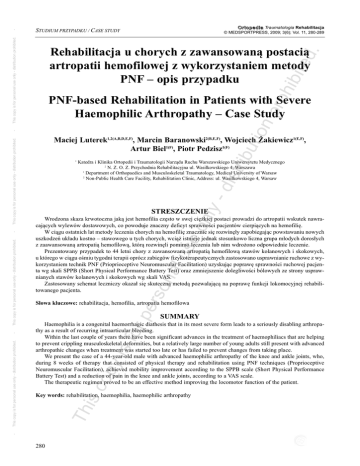 This copy is for personal use only - distribution prohibited. - O r t o p e d i a Traumatologia Rehabilitacja © MEDSPORTPRESS, 2009; 3(6); Vol. 11, 280-289 STUDIUM PRZYPADKU / CASE STUDY tio np roh ibit ed . Rehabilitacja u chorych z zawansowaną postacią artropatii hemofilowej z wykorzystaniem metody PnF – opis przypadku Katedra i Klinika Ortopedii i Traumatologii Narządu Ruchu Warszawskiego Uniwersytetu Medycznego 2 N. Z. O. Z. Przychodnia Rehabilitacyjna ul. Wasilkowskiego 4, Warszawa 1 Department of Orthopaedics and Musculoskeletal Traumatology, Medical University of Warsaw 2 Non-Public Health Care Facility, Rehabilitation Clinic, Address: ul. Wasilkowskiego 4, Warsaw ly - dis tr 1 ibu Maciej Luterek1,2(A,B,D,E,F), Marcin Baranowski2(B,E,F), Wojciech Żakiewicz1(E,F), Artur Biel1(F), Piotr Pedzisz1(F) on STRESZCZEnIE rso na lu se Wrodzona skaza krwotoczna jaką jest hemofilia często w swej ciężkiej postaci prowadzi do artropatii wskutek nawracających wylewów dostawowych, co powoduje znaczny deficyt sprawności pacjentów cierpiących na hemofilię. W ciągu ostatnich lat metody leczenia chorych na hemofilię znacznie się rozwinęły zapobiegając powstawaniu nowych uszkodzeń układu kostno – stawowego u tych chorych, wciąż istnieje jednak stosunkowo liczna grupa młodych dorosłych z zaawansowaną artropatią hemofilową, którą rozwinęli pomimo leczenia lub nim wdrożono odpowiednie leczenie. Prezentowany przypadek to 44 letni chory z zawansowaną artropatią hemofilową stawów kolanowych i skokowych, u którego w ciągu ośmiu tygodni terapii oprócz zabiegów fizykoterapeutycznych zastosowano usprawnianie ruchowe z wykorzystaniem technik PNF (Prioprioceptive Neuromuscular Facilitation) uzyskując poprawę sprawności ruchowej pacjenta wg skali SPPB (Short Physical Performance Battery Test) oraz zmniejszenie dolegliwości bólowych ze strony usprawnianych stawów kolanowych i skokowych wg skali VAS. Zastosowany schemat leczniczy okazał się skuteczną metodą pozwalającą na poprawę funkcji lokomocyjnej rehabilitowanego pacjenta. pe Słowa kluczowe: rehabilitacja, hemofilia, artropatia hemofilowa SUMMARY is c op y is for Haemophilia is a congenital haemorrhagic diathesis that in its most severe form leads to a seriously disabling arthropathy as a result of recurring intraarticular bleeding. Within the last couple of years there have been significant advances in the treatment of haemophiliacs that are helping to prevent crippling musculoskeletal deformities, but a relatively large number of young adults still present with advanced arthropathic changes when treatment was started too late or has failed to prevent changes from taking place. We present the case of a 44-year-old male with advanced haemophilic arthropathy of the knee and ankle joints, who, during 8 weeks of therapy that consisted of physical therapy and rehabilitation using PNF techniques (Proprioceptive Neuromuscular Facilitation), achieved mobility improvement according to the SPPB scale (Short Physical Performance Battery Test) and a reduction of pain in the knee and ankle joints, according to a VAS scale. The therapeutic regimen proved to be an effective method improving the locomotor function of the patient. Th Key words: rehabilitation, haemophilia, haemophilic arthropathy - This copy is for personal use only - distribution prohibited. - This copy is for personal use only - distribution prohibited. - This copy is for personal use only - distribution prohibited. - PnF-based Rehabilitation in Patients with Severe Haemophilic Arthropathy – Case Study 280 - op y is for pe rso na lu se on ly - dis tr ibu tio np roh ibit ed . BACKGROUnD Haemophilia, a condition in which there is a factor 8 or 9 deficiency, has a prevalence of around 1:16000 inhabitants in Poland [1]. Despite treatment, patients with severe forms suffer recurring destructive haemorrhages to the joints, massive haemorrhages into muscles and internal organs. These often occur without any particular cause. The joints most at risk from intraarticular bleeding (amongst patients with severe haemophilia) are: the knee (50.9%), ankle (42.8%), elbow (38.5%), shoulder (13.3%) and hip (2.3%). This leads to a serious arthropathy over a short period of time and significant reduction in function. Furthermore, patients reduce their mobility to a minimum fearing that movement may provoke bleeding, which only leads to more reduction in muscle strength. The only form of operative treatment which effectively improves mobility in patients with advanced haemophilic arthropathy is joint replacement therapy [6,7]. In the past, haemophiliacs treated with plasma concentrates risked blood-borne viral infections such as HIV. For HIV-positive patients, postoperative infections are much more common, and in the presence of orthopaedic implants the risk increases almost tenfold reaching 40% (as compared to the noninfected population). In cases where operative treatment has a high risk of complications, it is usually not undertaken. In such circumstances rehabilitation remains the only way of improving patients' mobility. In this article we propose a rehabilitation protocol using the PNF method for patients with advanced haemophilic arthropathy of the ankle and knee joints, using the example of our patient. is c OPIS PRZYPADKU 44-letni chory z ciężką postacią hemofilii A zgłosił się do Kliniki w maju 2008 z powodu nasilenia się dolegliwości bólowych w zakresie stawu kolanowego i skokowego prawego. U chorego ponadto od 1981 r. stwierdzano zakażenie wirusem HCV oraz od Th This copy is for personal use only - distribution prohibited. This copy is for personal use only - distribution prohibited. This copy is for personal use only - distribution prohibited. - WSTĘP Hemofilia czyli niedobór VIII bądź IX czynnika krzepnięcia krwi występuje w Polsce z częstością 1:16000 mieszkańców [1]. U chorych z ciężką postacią tej choroby często mimo stosowa