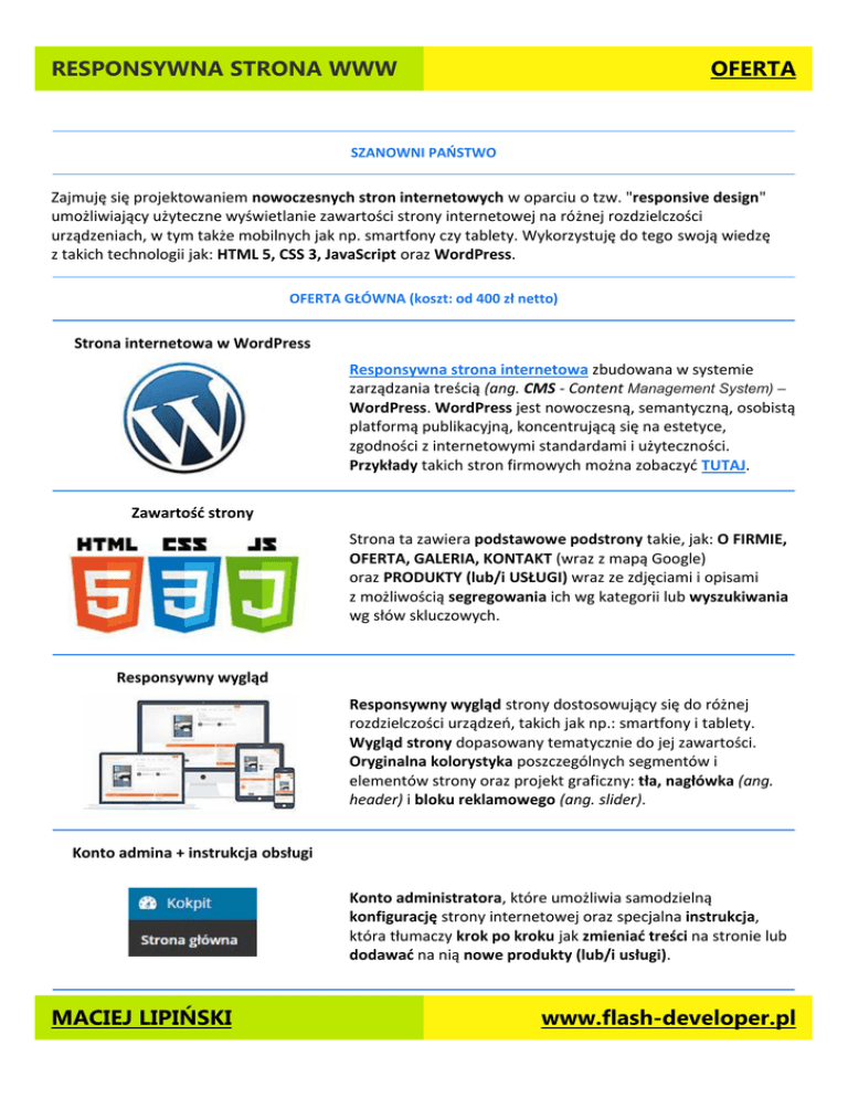 RESPONSYWNA STRONA WWW OFERTA v SZANOWNI PAŃSTWO v Zajmuję się projektowaniem nowoczesnych stron internetowych w oparciu o tzw. "responsive design" umożliwiający użyteczne wyświetlanie zawartości strony internetowej na różnej rozdzielczości urządzeniach, w tym także mobilnych jak np. smartfony czy tablety. Wykorzystuję do tego swoją wiedzę z takich technologii jak: HTML 5, CSS 3, JavaScript oraz WordPress. v OFERTA GŁÓWNA (koszt: od 400 zł netto) v Strona internetowa w WordPress Responsywna strona internetowa zbudowana w systemie zarządzania treścią (ang. CMS - Content Management System) – WordPress. WordPress jest nowoczesną, semantyczną, osobistą platformą publikacyjną, koncentrującą się na estetyce, zgodności z internetowymi standardami i użyteczności. Przykłady takich stron firmowych można zobaczyć TUTAJ. v Zawartość strony Strona ta zawiera podstawowe podstrony takie, jak: O FIRMIE, OFERTA, GALERIA, KONTAKT (wraz z mapą Google) oraz PRODUKTY (lub/i USŁUGI) wraz ze zdjęciami i opisami z możliwością segregowania ich wg kategorii lub wyszukiwania wg słów skluczowych. v Responsywny wygląd Responsywny wygląd strony dostosowujący się do różnej rozdzielczości urządzeń, takich jak np.: smartfony i tablety. Wygląd strony dopasowany tematycznie do jej zawartości. Oryginalna kolorystyka poszczególnych segmentów i elementów strony oraz projekt graficzny: tła, nagłówka (ang. header) i bloku reklamowego (ang. slider). v Konto admina + instrukcja obsługi Konto administratora, które umożliwia samodzielną konfigurację strony internetowej oraz specjalna instrukcja, która tłumaczy krok po kroku jak zmieniać treści na stronie lub dodawać na nią nowe produkty (lub/i usługi). MACIEJ LIPIŃSKI www.flash-developer.pl RESPONSYWNA STRONA WWW OFERTA Wiele użytecznych wtyczek Wtyczki do WordPressa, które dodają wiele dodatkowych funkcjonalności, takich jak np.: ochrona antywirusowa i przeciwwłamaniowa, automatyczne tworzenie kopii zapasowych (backup’ów) oraz mapy strony, informacja o Cookies na stronie, obsługa Google Analytics, alarm na maila o niedziałających linkach, bardzo szczegółowe statystyki odwiedzin strony i inne. OFERTA DODATKOWA (OPCJONALNA) v Konto Google/Gmail Specjalne konto Google na potrzeby obsługi technicznej strony internetowej, wraz z pocztą Gmail o nieupublicznionym adresie, wolnym od spamu, na który będą przychodzić wszystkie ważne informacje dotyczące konta hostingowego oraz samej strony internetowej. Skojarzone z nim konto WebmasterTools ze skonfigurowaną stroną oraz konto Google Analytics ze statystykami Google. v Konto hostingowe Konto hostingowe, na którym zostanie umieszczona strona internetowa. Propozycja: Konto W1GB na linuxpl.com Koszt: 49,20 zł / rok v Domena Domena, pod którą będzie działać strona internetowa. Propozycja: Domena.pl - przed wybraniem należy sprawdzić jej dostępność np. TUTAJ Koszt: 14,76 zł / 1-szy rok + 77,64 zł / każdy kolejny rok v MACIEJ LIPIŃSKI www.flash-developer.pl