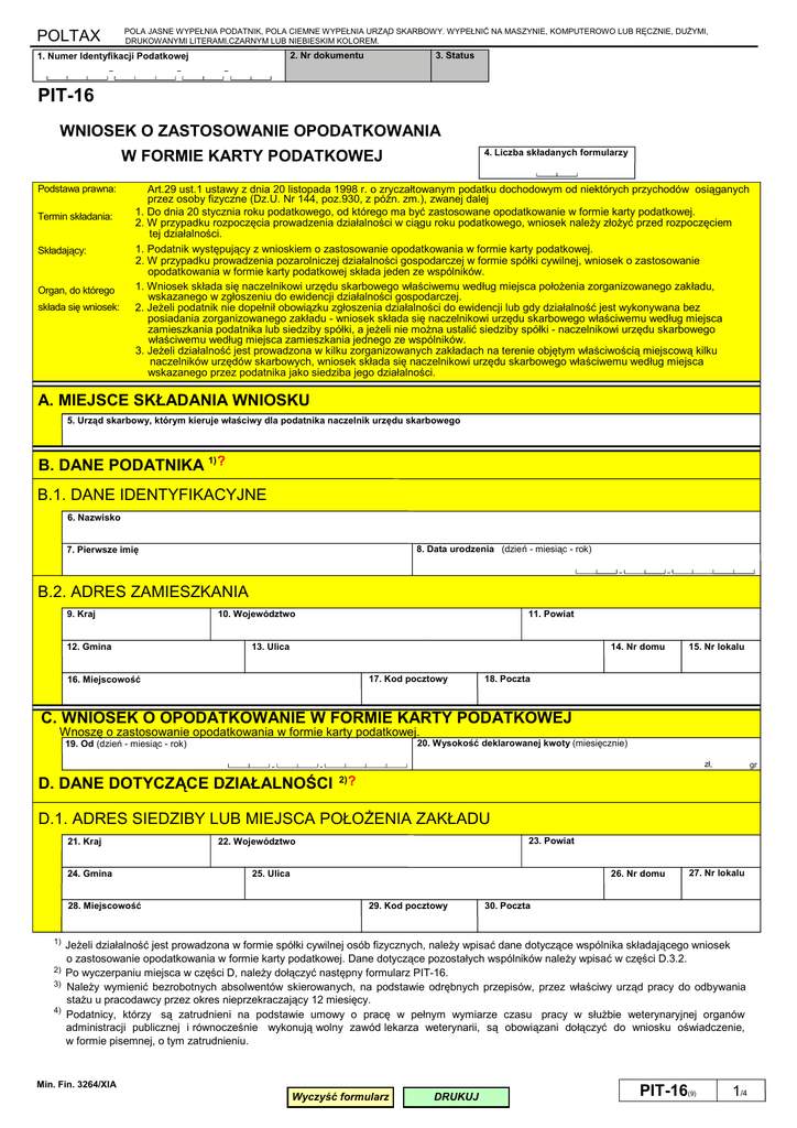 POLTAX POLA JASNE WYPEŁNIA PODATNIK, POLA CIEMNE WYPEŁNIA URZĄD SKARBOWY. WYPEŁNIĆ NA MASZYNIE, KOMPUTEROWO LUB RĘCZNIE, DUŻYMI, DRUKOWANYMI LITERAMI,CZARNYM LUB NIEBIESKIM KOLOREM. 2. Nr dokumentu 1. Numer Identyfikacji Podatkowej 3. Status PIT-16 WNIOSEK O ZASTOSOWANIE OPODATKOWANIA 4. Liczba składanych formularzy W FORMIE KARTY PODATKOWEJ Podstawa prawna: Termin składania: Składający: Organ, do którego składa się wniosek: Art.29 ust.1 ustawy z dnia 20 listopada 1998 r. o zryczałtowanym podatku dochodowym od niektórych przychodów osiąganych przez osoby fizyczne (Dz.U. Nr 144, poz.930, z póżn. zm.), zwanej dalej 1. Do dnia 20 stycznia roku podatkowego, od którego ma być zastosowane opodatkowanie w formie karty podatkowej. 2. W przypadku rozpoczęcia prowadzenia działalności w ciągu roku podatkowego, wniosek należy złożyć przed rozpoczęciem tej działalności. 1. Podatnik występujący z wnioskiem o zastosowanie opodatkowania w formie karty podatkowej. 2. W przypadku prowadzenia pozarolniczej działalności gospodarczej w formie spółki cywilnej, wniosek o zastosowanie opodatkowania w formie karty podatkowej składa jeden ze wspólników. 1. Wniosek składa się naczelnikowi urzędu skarbowego właściwemu według miejsca położenia zorganizowanego zakładu, wskazanego w zgłoszeniu do ewidencji działalności gospodarczej. 2. Jeżeli podatnik nie dopełnił obowiązku zgłoszenia działalności do ewidencji lub gdy działalność jest wykonywana bez posiadania zorganizowanego zakładu - wniosek składa się naczelnikowi urzędu skarbowego właściwemu według miejsca zamieszkania podatnika lub siedziby spółki, a jeżeli nie można ustalić siedziby spółki - naczelnikowi urzędu skarbowego właściwemu według miejsca zamieszkania jednego ze wspólników. 3. Jeżeli działalność jest prowadzona w kilku zorganizowanych zakładach na terenie objętym właściwością miejscową kilku naczelników urzędów skarbowych, wniosek składa się naczelnikowi urzędu skarbowego właściwemu według miejsca wskazanego przez podatnika jako siedziba jego działalności. A. MIEJSCE SKŁADANIA WNIOSKU 5. Urząd skarbowy, którym kieruje właściwy dla podatnika naczelnik urzędu skarbowego B. DANE PODATNIKA 1) ? B.1. DANE IDENTYFIKACYJNE 6. Nazwisko 8. Data urodzenia (dzień - miesiąc - rok) 7. Pierwsze imię B.2. ADRES ZAMIESZKANIA 9. Kraj 12. Gmina 11. Powiat 10. Województwo 14. Nr domu 13. Ulica 17. Kod pocztowy 16. Miejscowość 15. Nr lokalu 18. Poczta C. WNIOSEK O OPODATKOWANIE W FORMIE KARTY PODATKOWEJ Wnoszę o zastosowanie opodatkowania w formie karty podatkowej. 20. Wysokość deklarowanej kwoty (miesięcznie) 19. Od (dzień - miesiąc - rok) zł, D. DANE DOTYCZĄCE DZIAŁALNOŚCI gr 2) ? D.1. ADRES SIEDZIBY LUB MIEJSCA POŁOŻENIA ZAKŁADU 21. Kraj 24. Gmina 28. Miejscowość 1) 2) 3) 4) 23. Powiat 22. Województwo 26. Nr domu 25. Ulica 29. Kod pocztowy 27. Nr lokalu 30. Poczta Jeżeli działalność jest prowadzona w formie spółki cywilnej osób fizycznych, należy wpisać dane dotyczące wspólnika składającego wniosek o zastosowanie opodatkowania w formie karty podatkowej. Dane dotyczące pozostałych wspólników należy wpisać w części D.3.2. Po wyczerpaniu miejsca w części D, należy dołączyć następny formularz PIT-16. Należy wymienić bezrobotnych absolwentów skierowanych, na podstawie odrębnych przepisów, przez właściwy urząd pracy do odbywania stażu u pracodawcy przez okres nieprzekraczający 12 miesięcy. Podatnicy, którzy są zatrudnieni na podstawie umowy o pracę w pełnym wymiarze czasu pracy w służbie weterynaryjnej organów administracji publicznej i równocześnie wykonują wolny zawód lekarza weterynarii, są obowiązani dołączyć do wniosku oświadczenie, w formie pisemnej, o tym zatrudnieniu. Min. Fin. 3264/XIA Wyczyść formularz DRUKUJ PIT-16(9) 1/4 POLTAX POLA JASNE WYPEŁNIA PODATNIK, POLA CIEMNE WYPEŁNIA URZĄD SKARBOWY. WYPEŁNIĆ NA MASZYNIE, KOMPUTEROWO LUB RĘCZNIE, DUŻYMI, DRUKOWANYMI LITERAMI,CZARNYM LUB NIEBIESKIM KOLOREM. D.2. RODZAJ l ZAKRES DZIAŁALNOŚCI 31. Identyfikator REGON 32. Rodzaj działalności (zgodnie z art.23 ustawy) 33. Określić dokładnie zakres działalności 34. Miejsce prowadzenia działalności 35. Określić dokładnie zakres działalności 36. Miejsce prowadzenia działalności D.3. DANE DOTYCZĄCE STANU ZATRUDNIENIA D.3.1. DANE DOTYCZĄCE ZATRUDNIONYCH CZŁONKÓW RODZINY Należy wymienić członków rodziny mających to samo co podatnik miejsce pobytu stałego lub czasowego. 37. Nazwisko 38. Pierwsze imię 39. Stopień pokrewieństwa 40. Data urodzenia (dzień - miesiąc - rok) 41. Nazwisko 42. Pierwsze imię 43. Stopień pokrewieństwa 44. Data urodzenia (dzień - miesiąc - rok) 45. Nazwisko 46. Pierwsze imię 47. Stopień pokrewieństwa 48. Data urodzenia (dzień - miesiąc - rok) D.3.2. DANE DOTYCZĄCE WSPÓLNIKA(ÓW) ORAZ PRACOWNIKA(ÓW) Należy wymienić wspólnika(ów)/pracownika(ów). W przypadku pracowników, należy wymienić osoby zatrudnione na podstawie umowy o pracę nakładcza oraz członków rodziny mających inne niż podatnik miejsce pobytu stałego lub czasowego 49. Nazwisko (wspólnika/ pracownika) * ) ? 50. Pierwsze imię 51. Adres zamieszkania 52. Nazwisko (wspólnika/ pracownika) * ) ? 53. Pierwsze imię 54. Adres zamieszkania 55. Nazwisko (wspólnika/ pracownika) * ) ? 56. Pierwsze imię 57. Adres zamieszkania 58. Nazwisko (wspólnika/ pracownika) * ) ? 59. Pierwsze imię 60. Adres zamieszkania 61. Nazwisko (wspólnika/ pracownika) * ) ? 62. Pierwsze imię 63. Adres zamieszkania D.3 3. DANE DOTYCZĄCE OSÓB ZATRUDNIONYCH W CELU NAUKI ZAWODU LUB PRZYUCZENIA DO WYKONYWANIA OKREŚLONEJ PRACY W przypadku zatrudnienia stażysty podaje się datę złożenia egzaminu czeladniczego. 64. Nazwisko 65. Pierwsze imię 66. Data umowy (dzień - miesiąc - rok) 67. Data egzaminu czeladniczego (dzień - miesiąc - rok) 68. Nazwisko 69. Pierwsze imię 70. Dat