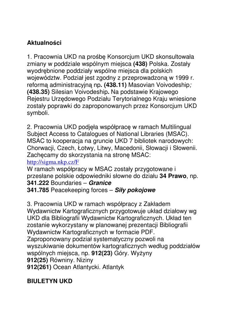 Aktualności 1. Pracownia UKD na prośbę Konsorcjum UKD skonsultowała zmiany w poddziale wspólnym miejsca (438) Polska. Zostały wyodrębnione poddziały wspólne miejsca dla polskich województw. Podział jest zgodny z przeprowadzoną w 1999 r. reformą administracyjną np. (438.11) Masovian Voivodeship; (438.35) Silesian Voivodeship. Na podstawie Krajowego Rejestru Urzędowego Podziału Terytorialnego Kraju wniesione zostały poprawki do zaproponowanych przez Konsorcjum UKD symboli. 2. Pracownia UKD podjęła współpracę w ramach Multilingual Subject Access to Catalogues of National Libraries (MSAC). MSAC to kooperacja na gruncie UKD 7 bibliotek narodowych: Chorwacji, Czech, Łotwy, Litwy, Macedonii, Słowacji i Słowenii. Zachęcamy do skorzystania na stronę MSAC: http://sigma.nkp.cz/F W ramach współpracy w MSAC zostały przygotowane i przesłane polskie odpowiedniki słowne do działu 34 Prawo, np. 341.222 Boundaries – Granice 341.785 Peacekeeping forces – Siły pokojowe 3. Pracownia UKD w ramach współpracy z Zakładem Wydawnictw Kartograficznych przygotowuje układ działowy wg UKD dla Bibliografii Wydawnictw Kartograficznych. Układ ten zostanie wykorzystany w planowanej prezentacji Bibliografii Wydawnictw Kartograficznych w formacie PDF. Zaproponowany podział systematyczny pozwoli na wyszukiwanie dokumentów kartograficznych według poddziałów wspólnych miejsca, np. 912(23) Góry. Wyżyny 912(25) Równiny. Niziny 912(261) Ocean Atlantycki. Atlantyk BIULETYN UKD Biuletyn Uniwersalnej Klasyfikacji Dziesiętnej (Biuletyn UKD) jest dwumiesięcznikiem, wydawanym w wersji elektronicznej, ukazującym się na stronie www.bn.org.pl w zakładce Dla Bibliotekarzy. Biuletyn UKD jest redagowany przez pracowników Pracowni Uniwersalnej Klasyfikacji Dziesiętnej. Metoda tworzenia symboli UKD jest prezentowana w MRF, "Extensions and Corrections to the UDC" i w wydanym w 2007 r. podręczniku "The Universal Decimal Classification: a guide to its use" autorstwa I.C. McIlwaine. Na tej podstawie budowana jest metodyka tworzenia symboli UKD, prezentowana w Biuletynie UKD. Do umieszczonych w Biuletynie UKD symboli dopisywane są odpowiedniki słowne zaczerpnięte z MRF i odpowiedniki słowne, równoważne z JHP BN. Istnieje możliwość przeszukiwania Biuletynu UKD przez odpowiedniki słowne i symbole UKD (Ctrl+F) BIULETYN UKD NR 7 DZIAŁ 34 NAUKI PRAWNE. PRAWO. DZIAŁ 351/354 ADMINISTRACJA PUBLICZNA. DZIAŁ 336.22/.23 PODATKI. OPŁATY I. W punkcie A prezentowana jest metoda sformułowana przez Konsorcjum UKD. W punkcie B umieszczono przyjęte (obligatoryjne) dla "Przewodnika Bibliograficznego", sugerowane (postulowane) dla bibliotek rozwiązania. A. Rozbudowa symboli zaproponowana w pliku wzorcowym MRF, stworzonym przez Konsorcjum w Hadze Rozbudowa działu 34 Prawo opiera się na dążeniu do uwolnienia się od wpływu systemów określonych w ustawodawstwach poszczególnych krajów i wywodzących się z różnych doktryn. W konsekwencji przyjęty porządek opiera się na abstrakcyjnych pojęciach prawnych. Każdy dział obejmuje zagadnienia teoretyczne i prawo pozytywne. Każdy przedmiot, każda czynność może stać się zagadnieniem prawniczym. Jeżeli więc dział 34 nie zawiera symboli głównych ujmujących pewne zagadnienia, należy je określać stosując zestawienie za pomocą dwukropka, z odpowiednimi symbolami UKD, np. 349.412.3 Rodzaje własności ziemskiej Dalszy podział przez zestawienie za pomocą dwukropka :332.24..., np. 349.412.3:332.24.012.34 Własność spółdzielni B. Reguły pragmatyczne UKD (opracowane w Pracowni UKD) Poddziały wspólne formy (083.1) Przepisy. Instrukcje. Poradniki praktyczne - nie są dodawane do symboli z działów 34, 351/354 (094.4.072) i (094.5.072) dla komentarzy tekstów prawnych i poszczególnych ustaw, jeśli słowo komentarz wystąpi w tytule, podtytule, nazwie serii, albo książka będzie miała następujący układ: tekst paragrafu i poniżej jego omówienie itd. 340 Ogólne zagadnienia prawa. Metody i nauki pomocnicze prawa 340.14 Precedens 341 Prawo międzynarodowe 341.12:327.7](4-67) Parlament Europejski 341.215.4 Obywatelstwo świata 341.232 Pomoc humanitarna międzynarodowa - prawo międzynarodowe 341.6:351.74](4-67) Polityka Sprawiedliwości i Spraw Wewnętrznych UE 341.7 Siły pokojowe - prawo 341.9:349.2](4-67) Swobodny przepływ osób - kraje Unii Europejskiej 342 Prawo państwowe. Prawo publiczne. Prawo konstytucyjne. Prawo administracyjne 342.2 Tworzenie i rozpad państw - prawo krajowe 342.395 Polskie Państwo Podziemne (tylko aspekt prawny) 94(438).082:342.395 Polskie Państwo Podziemne (zagadnienia historyczne) 342.52/.53 Impeachment 342.72/.73 Dobra osobiste. Równouprawnienie płci – prawo 342.72/.73:005.922.1 Ochrona informacji niejawnych. Informacje niejawne - ochrona – prawo. Tajemnica państwowa 342.727 Prawo do informacji. Wolność informacji 343 Prawo karne Przestępstwa karne. Penologia. Kryminologia 343::346 Prawo karne gospodarcze 343.13 Prawo do obrony sądowej 343.14 Przesłuchanie świadka. Przesłuchanie podejrzanego. Alibi. Świadek koronny 343.14:343.85 Ochrona świadków. Świadkowie – ochrona – prawo 343.15 Sądownictwo – błędy. Apelacja - prawo karne 343.22 Stan wyższej konieczności 343.25 Pręgierz 343.25:343.14 Tortury 343.26 Probacja (prawo) 343.26:654.9 Dozór elektroniczny sprawców przestępstw 343.26-052 Więźniowie 343.26-052:321.64 Więźniowie polityczni. Internowani 272-48:343.26-052 Duszpasterstwo więzienne 343.27 Przepadek rzeczy 343.34 Nieposłuszeństwo obywatelskie 343.533:004.056 Przestępstwo komputerowe – prawo 343.54 Kazirodztwo – prawo 343.6 Aborcja - prawo. Poronienie sztuczne - prawo 343.81/.84 Zakłady karne. Więziennictwo 376-058.53:343.81/.84 Szkoły przywięzienne 343.9 Przemoc (aspekty prawne) 343.91 Przestępcy 346 Prawo gospodarcze. Prawo kierowania gospodarką przez państwo 346:338.242 Swoboda działalności gospodarczej. Wolność ekonomiczn
