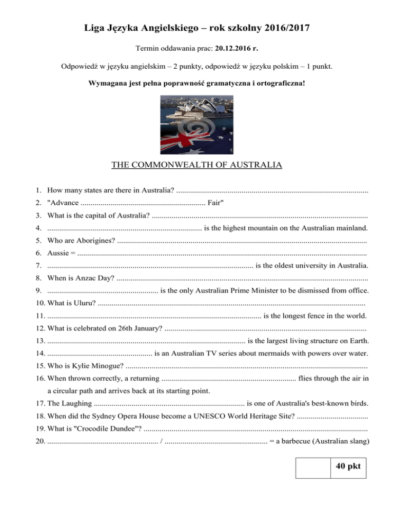 Liga Języka Angielskiego – rok szkolny 2016/2017 Termin oddawania prac: 20.12.2016 r. Odpowiedź w języku angielskim – 2 punkty, odpowiedź w języku polskim – 1 punkt. Wymagana jest pełna poprawność gramatyczna i ortograficzna! THE COMMONWEALTH OF AUSTRALIA 1. How many states are there in Australia? ................................................................................................. 2. "Advance ............................................................... Fair" 3. What is the capital of Australia? ............................................................................................................. 4. .............................................................................. is the highest mountain on the Australian mainland. 5. Who are Aborigines? .............................................................................................................................. 6. Aussie = .................................................................................................................................................. 7. ........................................................................................................ is the oldest university in Australia. 8. When is Anzac Day? ............................................................................................................................... 9. ........................................................ is the only Australian Prime Minister to be dismissed from office. 10. What is Uluru? ....................................................................................................................................... 11. ............................................................................................................ is the longest fence in the world. 12. What is celebrated on 26th January? ...................................................................................................... 13. .................................................................................................... is the largest living structure on Earth. 14. ..................................................... is an Australian TV series about mermaids with powers over water. 15. Who is Kylie Minogue? .......................................................................................................................... 16. When thrown correctly, a returning .................................................................... flies through the air in a circular path and arrives back at its starting point. 17. The Laughing ............................................................................ is one of Australia's best-known birds. 18. When did the Sydney Opera House become a UNESCO World Heritage Site? .................................... 19. What is "Crocodile Dundee"? ................................................................................................................. 20. ........................................................ / .................................................... = a barbecue (Australian slang) 40 pkt