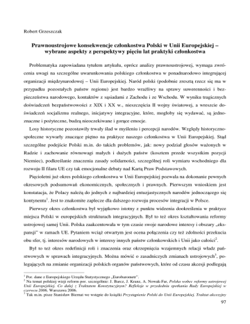 Robert Grzeszczak Prawnoustrojowe konsekwencje członkostwa Polski w Unii Europejskiej – wybrane aspekty z perspektywy pięciu lat praktyki członkostwa Problematyka zapowiadana tytułem artykułu, oprócz analizy prawnoustrojowej, wymaga zwrócenia uwagi na szczególne uwarunkowania polskiego członkostwa w ponadnarodowo integrującej organizacji międzynarodowej – Unii Europejskiej. Naród polski (podobnie zresztą rzecz się ma w przypadku pozostałych państw regionu) jest bardzo wraŜliwy na sprawy suwerenności i bezpieczeństwa narodowego, kontaktów z sąsiadami z Zachodu i ze Wschodu. W wyniku tragicznych doświadczeń bezpaństwowości z XIX i XX w., nieszczęścia II wojny światowej, a wreszcie doświadczeń socjalizmu realnego, inicjatywy integracyjne, które, mogłoby się wydawać, są jednoznaczne i poŜyteczne, budzą nieoczekiwane i gorące emocje. Losy historyczne pozostawiły trwały ślad w myśleniu i percepcji narodów. Względy historycznospołeczne wywarły znaczące piętno na praktyce naszego członkostwa w Unii Europejskiej. Stąd szczególne podejście Polski m.in. do takich problemów, jak: nowy podział głosów waŜonych w Radzie i zachowanie równowagi małych i duŜych państw (kosztem przede wszystkim pozycji Niemiec), podkreślanie znaczenia zasady solidarności, szczególnej roli wymiaru wschodniego dla rozwoju II filaru UE czy tak emocjonalne debaty nad Kartą Praw Podstawowych. Pięcioletni juŜ okres polskiego członkostwa w Unii Europejskiej pozwala na dokonanie pewnych okresowych podsumowań ekonomicznych, społecznych i prawnych. Pierwszym wnioskiem jest konstatacja, Ŝe Polacy naleŜą do jednych z najbardziej entuzjastycznych narodów jednoczącego się kontynentu1. Jest to znakomite zaplecze dla dalszego rozwoju procesów integracji w Polsce. Pierwszy okres członkostwa był wyjątkowo istotny z punktu widzenia dookreślenia w praktyce miejsca Polski w europejskich strukturach integracyjnych. Był to teŜ okres kształtowania reformy ustrojowej samej Unii. Polska zaakcentowała w tym czasie swoje narodowe interesy i obszary „ekspansji” w ramach UE. Pytaniem wciąŜ otwartym jest ocena połączenia czy teŜ zdolności przekucia obu sfer, tj. interesów narodowych w interesy innych państw członkowskich i Unii jako całości2. Był to teŜ okres redefinicji roli i znaczenia oraz okrzepnięcia wzajemnych relacji władz państwowych w sprawach integracyjnych. MoŜna mówić o zasadniczych zmianach ustrojowych3, polegających na zmianie organizacji polskich organów państwowych, które od czasu akcesji podlegają 1 Por. dane z Europejskiego Urzędu Statystycznego „Eurobarometr”. Na temat polskiej wizji reform por. szczególnie: J. Barcz, J. Kranz, A. Nowak-Far, Polska wobec reformy ustrojowej Unii Europejskiej. Co dalej z Traktatem Konstytucyjnym? Refleksje w przededniu spotkania Rady Europejskiej w czerwcu 2006, Warszawa 2006. 3 Tak m.in. pisze Stanisław Biernat we wstępie do ksiąŜki Przystąpienie Polski do Unii Europejskiej. Traktat akcesyjny 2 97 takŜe prawu UE (z wszystkimi wynikającymi z tego konsekwencjami, szczególnie zaś tymi podyktowanymi zasadami stosowania prawa UE w porządkach wewnętrznych państw członkowskich). W niniejszym artykule właśnie ta ostatnia kwestia stanie się przedmiotem szerszej analizy. Przekazanie „kompetencji w niektórych sprawach” na rzecz UE spowodowało bowiem, z jednej strony, uszczuplenie kompetencji Sejmu i Senatu, z drugiej zaś podniosło znaczenie władzy wykonawczej (Rady Ministrów), stanowiącej na poziomie unijnym podstawowy organ prawodawczy! Osobny temat stanowi zakres zmian w polskim sądownictwie. Temat ten jest szczególnie interesujący w kontekście zbudowania europejskiej przestrzeni prawnej z silnymi fundamentami europejskiej przestrzeni sądowej i powstającej na jej gruncie „Europy sędziów”4. Ze względu na ramy opracowania zostanie on jedynie zasygnalizowany. Skutki dla władzy prawodawczej Przystąpienie do Unii Europejskiej jest powaŜnym aktem ustrojowym, który w szerokim zakresie wpływa na działalność instytucji państwa, w tym zwłaszcza na parlament. Polski porządek prawny od 1 maja 2004 r. stał się co do zasady dualistyczny. Składa się bowiem – biorąc pod uwagę aspekt podmiotowy, tj. prawodawcę – z systemu prawa Unii Europejskiej i systemu prawa polskiego. W pierwszym przypadku mamy do czynienia z bardzo specyficznym prawodawcą europejskim. Jest to grupa róŜnorodnych aktorów: instytucji UE (Rada, Parlament Europejski, Komisja Europejska, Europejski Bank Centralny) oraz państw, a w zasadzie przedstawicieli rządów skupionych na forum Rady. Uwagi te mają kapitalne znaczenie dla pozycji ustrojowej Sejmu i Senatu, które tracąc monopol prawodawczy, w pewnym zakresie stały się wykonawcami postanowień podjętych przez rządy w Brukseli. Wstąpienie Polski do struktur UE spowodowało zatem, Ŝe dotychczasowa klasyczna konstrukcja, oparta na współistnieniu – w róŜnych konfiguracjach – norm prawa międzynarodowego i krajowego została uzupełniona o nowy, choć budowany na fundamentach prawnomiędzynarodowych, system prawny5. Niesie to ze sobą powaŜne reperkusje dla parlamentu (Sejmu i Senatu), tracącego w 2004 r. monopol władzy prawodawczej. Miejsce parlamentów narodowych w procesach integracji europejskiej wyznaczają bowiem przede wszystkim przepisy prawa samej Unii. Obok tego są i jego skutki, red. S. Biernat, S. Dudzik, M. Niedźwiedź, Kraków 2003, s. 9. 4 WyŜej wymienione pojęcia nie są pojęciami traktatowymi. Mówiąc o europejskiej przestrzeni prawnej, mam na myśli normy wspólnotowego prawa traktatowego (pierwotnego) i pochodnego, zasady ogólne o charakterze niepisanym i normy krajowe, wydane w celu wykonania zobowiązań prawno-integracyjnych. Europejska Przestrzeń Sądowa to, najogólniej, współpraca sądów państw członkowskich w sprawach cywilnych i karnych, oparta o sieć róŜnych – po