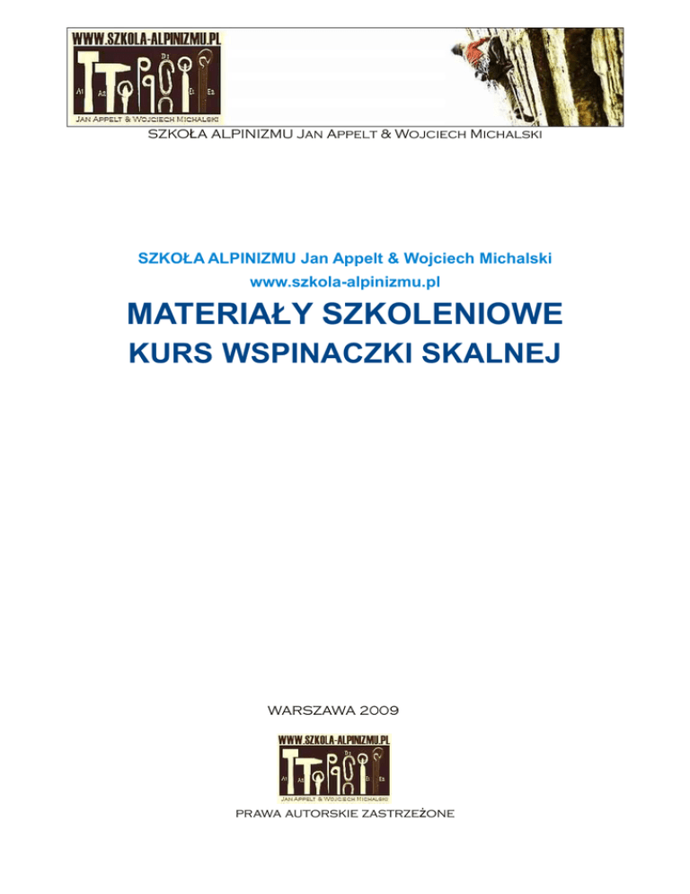SZKOŁA ALPINIZMU Jan Appelt & Wojciech Michalski SZKOŁA ALPINIZMU Jan Appelt & Wojciech Michalski www.szkola-alpinizmu.pl MATERIAŁY SZKOLENIOWE KURS WSPINACZKI SKALNEJ WARSZAWA 2009 prawa autorskie zastrzeżone SPIS TREŚCI I. WSTĘP...............................................................................................................................2 II. DYSCYPLINY WSPINACZKOWE....................................................................................4 III. SPRZĘT WSPINACZKOWY (normy CE, hEN, UIAA).....................................................................5 IV. UKŁAD ASEKURACYJNY..............................................................................................5 V. KARABINKI (rodzaje, oznaczenia, normy, przeznaczenie)......................................................6 VI. LINY WSPINACZKOWE (rodzaje, oznaczenia, normy, przeznaczenie).................................9 VII. PRZYRZĄDY ASEKURACYJNE.................................................................................16 (od Widelca do Tucana - typy, normy, przeznaczenie) VIII. PUNKTY ASEKURACYJNE.......................................................................................20 • STAŁE PUNKTY ASEKURACYJNE (spity, kotwy wklejane i rozporowe oraz haki) • KOŚCI – PUNKTY ZAKŁADANE SAMODZIELNIE IX. BUDOWANIE STANOWISK ASEKURACYJNYCH......................................................29 (rodzaje stanowisk, zastosowanie) X. ZAKŁADANIE STANOWISKA DO WĘDKI....................................................................33 XI. PRZEWIĄZYWANIE SIĘ PRZEZ RING........................................................................35 XII. ZJAZDY........................................................................................................................37 XIII. WĘZŁY........................................................................................................................39 XIV. SKALE TRUDNOŚCI I STYLE WE WSPINACZCE SPORTOWEJ...........................41 XV. ETYKA WE WSPINANIU.............................................................................................45 XVI. OCHRONA ŚRODOWISKA........................................................................................46 (zasady i normy zachowania, gdzie szukać informacji, działalność Fundacji NASZE SKAŁY) SUPLEMENT • POROZUMIENIE TATRZAŃSKIE – CZYM JEST I CZEGO DOTYCZY? • ZESTAW OSOBISTY (o sentymencie do własnej uprzęży oraz innego sprzętu) WSTĘP Niewielu wspinaczy ma świadomość, że kurs wspinaczkowy nie jest zwieńczeniem procesu “edukacji wspinaczkowej”, a tego procesu ledwie początkiem. Często po kończeniu kursu nie wspinamy się jakiś czas i świeżo zdobyte wiadomości się ulatniają. Niniejsze materiały szkoleniowe zawierają najważniejsze informacje z zakresu teorii asekuracji oraz opis kilku podstawowych czynności, które wykonujemy podczas wspinania, takich jak zjazdy, przewiązywanie się przez ring zjazdowy i wieszanie „wędki” w stałym stanowisku oraz w stanowisku, które zakładamy samodzielnie. Dołożyliśmy także fotografie kilku najważnieszych węzłów, abyście mogli skonfrontować to, co pamiętamy z kursu ze “wzorem”. Najlepsze materiały szkoleniowe nie zastąpią jednak praktyki wspinaczkowej i ciągłego ćwiczenia, do czego Was zachęcamy. Aktywność, jaką jest wspinanie jest niebezpieczna. Różny jest stopień ryzyka jaki podejmują wspinacze i alpiniści, wspinający się w różnych górach Świata, niezależnie, czy są to Tatry, Alpy, Himalaje czy skałki. Warto jednak pamiętać, że również na sztucznej ściance wspinaczkowej może dojść do niebezpiecznego wypadku, jeśli nie przestrzegamy podstawowych zasad bezpieczeństwa: NIE SPRZĘT POPEŁNIA BŁĘDY, BŁĘDY POPEŁNIAJĄ LUDZIE Informacje zawarte w niniejszych materiałach szkoleniowych są poglądowe i kompletne stają się dopiero wraz z kursem wspinaczkowym. Dlatego próby stosowania wiedzy zawartej w tym opracowaniu, bez stosownego szkolenia praktycznego mogą się skończyć tragicznie. Jako autorzy opracowania nie ponosimy odpowiedzialności za ewentualne szkody wynikające z samodzielnego, niewłaściwego stosowania metod asekuracji tu opisanych. Pamiętajcie, jeśli macie wątpliwości – dzwońcie... POZDRAWIAMY! Jan Appelt +48 502 344 720 +34 633 654 328 Wojciech Michalski +48 505 614 460 DYSCYPLINY WSPINACZKOWE Wspinanie tym różni się od chodzenia, że do ruchu w górę, w bok lub w dół trzeba użyć rąk - do utrzymania równowagi lub podciągnięcia się. Wspinanie uprawia się dziś na bardzo wiele sposobów, których wspólnym mianownikiem jest pokonanie trudności terenowych i wiekszość technik asekuracji. Zaś od strony rodzaju wysiłku i techniki ruchu różnice mogą być znaczne. Wspinaczka halowa - czyli wspinanie na sztucznych ścianach wspinaczkowych. Buldering (bouldering) - wspinaczka uprawiana na małych formach skalnych. Buldering uprawia się bez sprzętu do asekuracji - poza crashpadami - materacami, które ułatwiają zeskok w razie nie udanej próby wejścia na/przejścia bulderu. Bulder/problem/przystawka, czyli kilku-kilkudziesięciu przechwytowa droga wspinaczkowa. Buldering jest najbardziej naturalną formą treningu wspinaczkowego oraz świetną zabawą. Wspinaczka skałkowa - wspinanie uprawiane w skałach, jedno- lub wielo-wyciągowe. Sportowa - po drogach ze stałą asekuracją, na kórych ryzyko długiego lotu jest ograniczone z założenia do minimum. Tradycyjna - wspinanie z użyciem tradycyjnego sprzętu do (tzw. własnej) asekuracji, co na drogach powyżej VI stopnia trudności jest dużym wyzwaniem. Alpinizm - inaczej wspinaczka wysokogóska. Uprawiana jest na dużych ścianach górskich (Tatry, Dolomity, Alpy) oraz w górach wysokich (Kaukaz, Hindukusz, Himalaje). Cechuje ją najwyższy stopień ryzyka, ze względu na wiele zagrożeń obiektywnych: lawiny lodowe, kamienne, załamania pogody, odleg