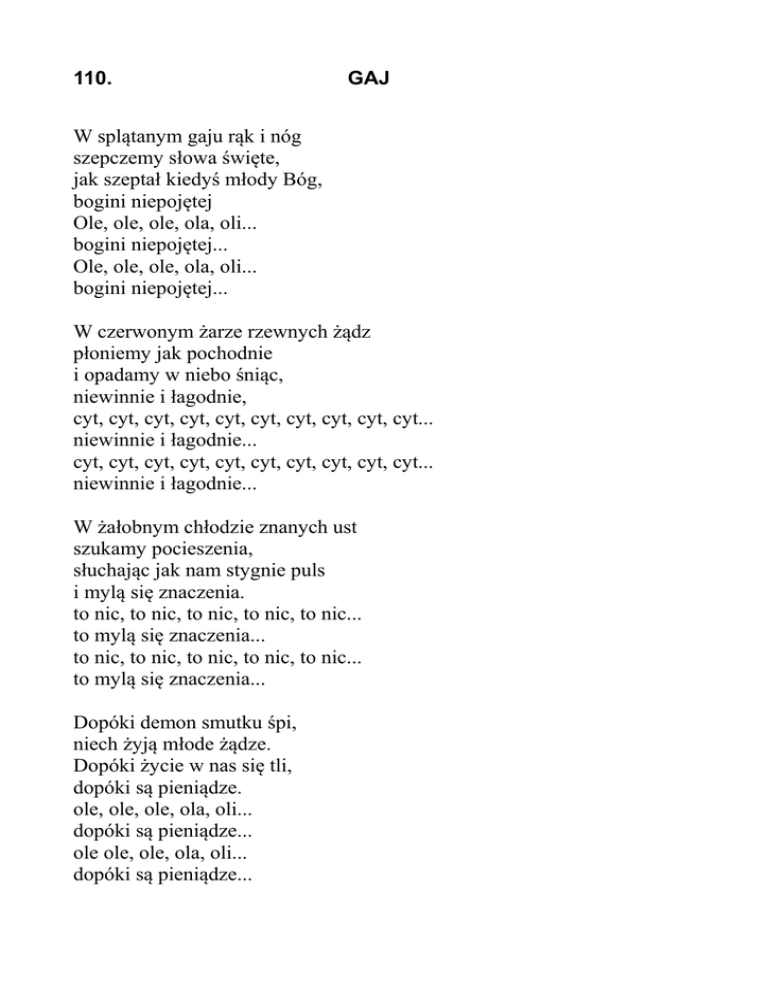 110. GAJ W splątanym gaju rąk i nóg szepczemy słowa święte, jak szeptał kiedyś młody Bóg, bogini niepojętej Ole, ole, ole, ola, oli... bogini niepojętej... Ole, ole, ole, ola, oli... bogini niepojętej... W czerwonym żarze rzewnych żądz płoniemy jak pochodnie i opadamy w niebo śniąc, niewinnie i łagodnie, cyt, cyt, cyt, cyt, cyt, cyt, cyt, cyt, cyt, cyt... niewinnie i łagodnie... cyt, cyt, cyt, cyt, cyt, cyt, cyt, cyt, cyt, cyt... niewinnie i łagodnie... W żałobnym chłodzie znanych ust szukamy pocieszenia, słuchając jak nam stygnie puls i mylą się znaczenia. to nic, to nic, to nic, to nic, to nic... to mylą się znaczenia... to nic, to nic, to nic, to nic, to nic... to mylą się znaczenia... Dopóki demon smutku śpi, niech żyją młode żądze. Dopóki życie w nas się tli, dopóki są pieniądze. ole, ole, ole, ola, oli... dopóki są pieniądze... ole ole, ole, ola, oli... dopóki są pieniądze... ole, ole, ole, ola, oli... dopóki są pieniądze... ole ole, ole, ola, oli... niech żyją młode żądze... cyt, cyt, cyt, cyt, cyt, cyt, cyt, cyt, cyt, cyt... dopóki są pieniądze... ole ole, ole, ola, oli... niech żyją młode żądze...