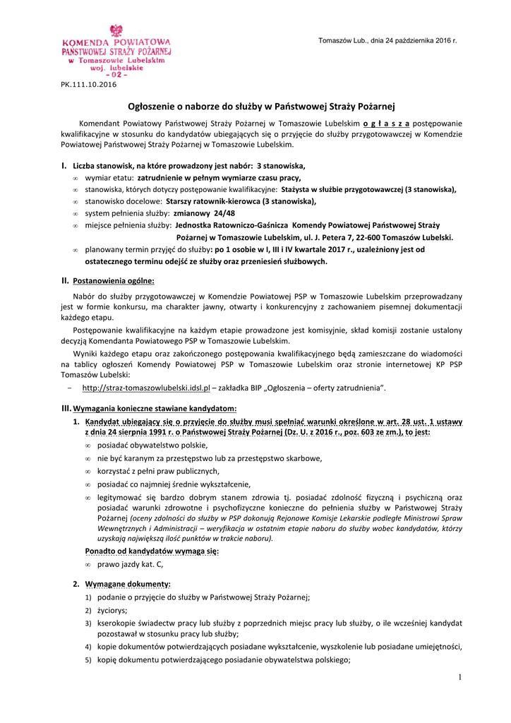 Tomaszów Lub., dnia 24 października 2016 r. PK.111.10.2016 Ogłoszenie o naborze do służby w Państwowej Straży Pożarnej Komendant Powiatowy Państwowej Straży Pożarnej w Tomaszowie Lubelskim o g ł a s z a postępowanie kwalifikacyjne w stosunku do kandydatów ubiegających się o przyjęcie do służby przygotowawczej w Komendzie Powiatowej Państwowej Straży Pożarnej w Tomaszowie Lubelskim. I. Liczba stanowisk, na które prowadzony jest nabór: 3 stanowiska, • • • • • • wymiar etatu: zatrudnienie w pełnym wymiarze czasu pracy, stanowiska, których dotyczy postępowanie kwalifikacyjne: Stażysta w służbie przygotowawczej (3 stanowiska), stanowisko docelowe: Starszy ratownik-kierowca (3 stanowiska), system pełnienia służby: zmianowy 24/48 miejsce pełnienia służby: Jednostka Ratowniczo-Gaśnicza Komendy Powiatowej Państwowej Straży Pożarnej w Tomaszowie Lubelskim, ul. J. Petera 7, 22-600 Tomaszów Lubelski. planowany termin przyjęć do służby: po 1 osobie w I, III i IV kwartale 2017 r., uzależniony jest od ostatecznego terminu odejść ze służby oraz przeniesień służbowych. II. Postanowienia ogólne: Nabór do służby przygotowawczej w Komendzie Powiatowej PSP w Tomaszowie Lubelskim przeprowadzany jest w formie konkursu, ma charakter jawny, otwarty i konkurencyjny z zachowaniem pisemnej dokumentacji każdego etapu. Postępowanie kwalifikacyjne na każdym etapie prowadzone jest komisyjnie, skład komisji zostanie ustalony decyzją Komendanta Powiatowego PSP w Tomaszowie Lubelskim. Wyniki każdego etapu oraz zakończonego postępowania kwalifikacyjnego będą zamieszczane do wiadomości na tablicy ogłoszeń Komendy Powiatowej PSP w Tomaszowie Lubelskim oraz stronie internetowej KP PSP Tomaszów Lubelski: - http://straz-tomaszowlubelski.idsl.pl – zakładka BIP „Ogłoszenia – oferty zatrudnienia”. III. Wymagania konieczne stawiane kandydatom: 1. Kandydat ubiegający się o przyjęcie do służby musi spełniać warunki określone w art. 28 ust. 1 ustawy z dnia 24 sierpnia 1991 r. o Państwowej Straży Pożarnej (Dz. U. z 2016 r., poz. 603 ze zm.), to jest: • posiadać obywatelstwo polskie, • nie być karanym za przestępstwo lub za przestępstwo skarbowe, • korzystać z pełni praw publicznych, • posiadać co najmniej średnie wykształcenie, • legitymować się bardzo dobrym stanem zdrowia tj. posiadać zdolność fizyczną i psychiczną oraz posiadać warunki zdrowotne i psychofizyczne konieczne do pełnienia służby w Państwowej Straży Pożarnej (oceny zdolności do służby w PSP dokonują Rejonowe Komisje Lekarskie podległe Ministrowi Spraw Wewnętrznych i Administracji – weryfikacja w ostatnim etapie naboru do służby wobec kandydatów, którzy uzyskają największą ilość punktów w trakcie naboru). Ponadto od kandydatów wymaga się: • prawo jazdy kat. C, 2. Wymagane dokumenty: 1) podanie o przyjęcie do służby w Państwowej Straży Pożarnej; 2) życiorys; 3) kserokopie świadectw pracy lub służby z poprzednich miejsc pracy lub służby, o ile wcześniej kandydat pozostawał w stosunku pracy lub służby; 4) kopie dokumentów potwierdzających posiadane wykształcenie, wyszkolenie lub posiadane umiejętności, 5) kopię dokumentu potwierdzającego posiadanie obywatelstwa polskiego; 1 6) podpisane oświadczenie o wyrażeniu zgody na przetwarzanie danych osobowych niezbędnych do realizacji procesu postępowania kwalifikacyjnego, zgodnie z przepisami o ochronie danych osobowych, wg wzoru – załącznik nr 3; 7) podpisane oświadczenie o korzystaniu z pełni praw publicznych, wg wzoru – załącznik nr 4; 8) podpisane oświadczenie o niekaralności za przestępstwo lub przestępstwo skarbowe, wg wzoru– załącznik nr 5; 9) zaświadczenie lekarskie o braku przeciwwskazań zdrowotnych do wykonywania ćwiczeń fizycznych wystawione nie wcześniej niż 30 dni przed przystąpieniem do ostatniego etapu testu sprawności fizyczne, wg wzoru– załącznik nr 6; Zaświadczenie lekarskie kandydat dostarcza najpóźniej w dniu przeprowadzania próby wydolnościowej (przed jej rozpoczęciem) metodą HARVARD STEP-UP (test Harwardzki). Na wszystkich składanych kopiach dokumentów należy umieścić – datę i własnoręczny, czytelny podpis kandydata na każdej ze stron. Wszystkie wymagane oświadczenia oraz zaświadczenie lekarskie muszą być sporządzone wyłącznie na drukach, które są do pobrania na stronie internetowej lub w sekretariacie Komendy (pokój nr 151). Brak jakiegokolwiek wymaganego dokumentu lub oświadczenia (wymienionego w pkt III.2) eliminuje kandydata z dalszego postępowania kwalifikacyjnego. IV. Sposób postępowania z dokumentami kandydatów, którzy nie zakwalifikowali się do kolejnych etapów postępowania kwalifikacyjnego. Dokumenty kandydatów, którzy nie zakwalifikowali się do kolejnych etapów postępowania kwalifikacyjnego można będzie odebrać w sekretariacie Komendy w terminie 1 miesiąca od dnia zakończenia naboru. Po tym czasie zostaną protokolarnie zniszczone. V. Termin i miejsce składania dokumentów. Dokumenty należy składać w zamkniętej kopercie podpisanej imieniem i nazwiskiem kandydata oraz imieniem ojca, z dopiskiem „ N AB ÓR D O SŁ U Ż BY w K P PSP w TO MA SZ OW IE L U BE L SK IM” . Dokumenty należy składać w terminie od 28 października 2016 r. do 10 listopada 2016 r. • osobiście w sekretariacie Komendy Powiatowej PSP w Tomaszowie Lubelskim przy ul. Petera 7, w dni robocze od poniedziałku do piątku w godz. 7:30 – 15 :30 (pokój nr 151), • listownie na adres: Komenda Powiatowa PSP w Tomaszowie Lub., 22-600 Tomaszów Lub., ul. Petera 7. Dokumenty złożone po terminie, tj. po godz. 15:30 dnia 10.11.2016 r. (liczy się data wpływu do sekretariatu Komendy Powiatowej PSP w Tomaszowie Lub.) nie będą rozpatrywane. ETAPY POSTĘPOWANIA KWALIFIKACYJNEGO VI. Ocena złożonych dokumentów – od 14 do 15 listopada 2016 r. Komisja kwalifikacyjna powo