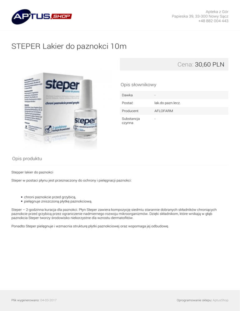 Apteka z Gór Papieska 39, 33-300 Nowy Sącz +48 882 004 443 STEPER Lakier do paznokci 10m Cena: 30,60 PLN Opis słownikowy Dawka - Postać lak.do pazn.lecz. Producent AFLOFARM Substancja czynna - Opis produktu Stepper lakier do paznokci Steper w postaci płynu jest przeznaczony do ochrony i pielęgnacji paznokci: chroni paznokcie przed grzybicą, pielęgnuje zniszczoną płytkę paznokciową. Steper – 2-godzinna kuracja dla paznokci. Płyn Steper zawiera kompozycję siedmiu starannie dobranych składników chroniących paznokcie przed grzybicą przez ograniczenie nadmiernego rozwoju mikroorganizmów. Dzięki składnikom, które wnikają w głąb paznokcia Steper tworzy środowisko niekorzystne dla wzrostu dermatofitów. Ponadto Steper pielęgnuje i wzmacnia strukturę płytki paznokciowej oraz wspomaga jej odbudowę. Plik wygenerowano: 04-03-2017 Powered by TCPDF (www.tcpdf.org) Oprogramowanie sklepu: AptusShop