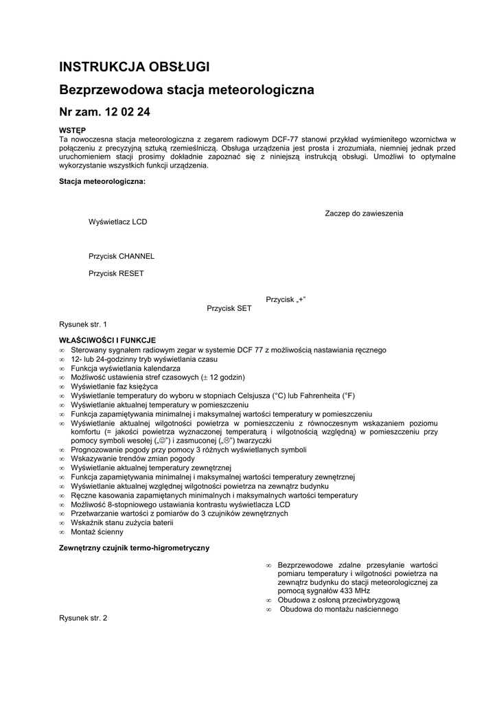 INSTRUKCJA OBSŁUGI Bezprzewodowa stacja meteorologiczna Nr zam. 12 02 24 WSTĘP Ta nowoczesna stacja meteorologiczna z zegarem radiowym DCF-77 stanowi przykład wyśmienitego wzornictwa w połączeniu z precyzyjną sztuką rzemieślniczą. Obsługa urządzenia jest prosta i zrozumiała, niemniej jednak przed uruchomieniem stacji prosimy dokładnie zapoznać się z niniejszą instrukcją obsługi. Umożliwi to optymalne wykorzystanie wszystkich funkcji urządzenia. Stacja meteorologiczna: Zaczep do zawieszenia Wyświetlacz LCD Przycisk CHANNEL Przycisk RESET Przycisk „+” Przycisk SET Rysunek str. 1 WŁAŚCIWOŚCI I FUNKCJE • Sterowany sygnałem radiowym zegar w systemie DCF 77 z możliwością nastawiania ręcznego • 12- lub 24-godzinny tryb wyświetlania czasu • Funkcja wyświetlania kalendarza • Możliwość ustawienia stref czasowych (± 12 godzin) • Wyświetlanie faz księżyca • Wyświetlanie temperatury do wyboru w stopniach Celsjusza (°C) lub Fahrenheita (°F) • Wyświetlanie aktualnej temperatury w pomieszczeniu • Funkcja zapamiętywania minimalnej i maksymalnej wartości temperatury w pomieszczeniu • Wyświetlanie aktualnej wilgotności powietrza w pomieszczeniu z równoczesnym wskazaniem poziomu komfortu (= jakości powietrza wyznaczonej temperaturą i wilgotnością względną) w pomieszczeniu przy pomocy symboli wesołej („!”) i zasmuconej („"”) twarzyczki • Prognozowanie pogody przy pomocy 3 różnych wyświetlanych symboli • Wskazywanie trendów zmian pogody • Wyświetlanie aktualnej temperatury zewnętrznej • Funkcja zapamiętywania minimalnej i maksymalnej wartości temperatury zewnętrznej • Wyświetlanie aktualnej względnej wilgotności powietrza na zewnątrz budynku • Ręczne kasowania zapamiętanych minimalnych i maksymalnych wartości temperatury • Możliwość 8-stopniowego ustawiania kontrastu wyświetlacza LCD • Przetwarzanie wartości z pomiarów do 3 czujników zewnętrznych • Wskaźnik stanu zużycia baterii • Montaż ścienny Zewnętrzny czujnik termo-higrometryczny • Rysunek str. 2 • • Bezprzewodowe zdalne przesyłanie wartości pomiaru temperatury i wilgotności powietrza na zewnątrz budynku do stacji meteorologicznej za pomocą sygnałów 433 MHz Obudowa z osłoną przeciwbryzgową Obudowa do montażu naściennego REGULACJA PODSTAWOWA 1. W pierwszej kolejności wstawić baterie do stacji meteorologicznej (patrz „Instalowanie i wymiana baterii stacji meteorologicznej”). W momencie zainstalowania baterii wszystkie segmentu wyświetlacza krótko zaświecą. Następnie wyświetlona zostanie temperatura wewnętrzna i wilgotność powietrza w pomieszczeniu oraz czas na zegarze w postaci „_:_ _”, data w postaci „_:_ _” faza księżyca oraz symbol wskazania pogody w postaci słoneczka otoczonego chmurkami. O ile wyświetlenie temperatury i wilgotności powietrza w pomieszczeniu nie nastąpi w ciągu kilku sekund, należy wyjąć baterie na co najmniej 10 sekund, a następnie ponownie je zainstalować. W chwili wyświetlenia wartości pomierzonych wewnątrz pomieszczenia można przejść do wykonywania czynności 2. 2. W ciągu 3 minut od aktywacji stacji meteorologicznej należy wstawić baterie do zewnętrznego czujnika termohigrometrycznego (w tym celu patrz „Instalowanie i wymiana baterii zewnętrznego czujnika termohigrometrycznego”). 3. Po zainstalowaniu baterii czujnika temperatury stacja meteorologiczna odbiera w ciągu kilku sekund dane z czujnika zewnętrznego. Na wyświetlaczu stacji meteorologicznej powinno teraz pojawić się wyświetlenie temperatury zewnętrznej oraz wilgotności powietrza na zewnątrz budynku. O ile w ciągu 10 minut nie nastąpi żadne wyświetlenie, należy wyjąć baterie z obydwu zespołów i powtórzyć całą procedurę od operacji 1. 4. Do stacji meteorologicznej można podłączyć do 3 przetworników temperatury zewnętrznej. Jeśli nabyli Państwo dodatkowe czujniki pomiarów zewnętrznych, dla każdego z nich należy wykonać czynności z pkt. 2 niniejszej instrukcji. Prosimy jednak uważać, aby pomiędzy odbiorem danych uruchomionego ostatnio czujnika temperatury zewnętrznej, a uruchomieniem następnego czujnika upłynęło co najmniej 10 sekund. Stacja meteorologiczna numeruje czujnik zewnętrzne w kolejności dokonania ich regulacji podstawowej, tzn. pierwszemu czujnikowi temperatury przyporządkowany zostaje wskaźnik temperatury o numerze 1 itd. 5. Po uruchomieniu wszystkich czujników zewnętrznych realizowany jest program testujący, podczas którego wyświetlane są w trybie przypadkowym wartości pomiaru różnych czujników temperatury. Odbywa się to zależnie od kolejności, w jakiej wartości mierzone nadawane są przez czujniki. Proces ten może zostać przerwany naciśnięciem dowolnego przycisku i na wyświetlaczu pojawi się temperatura i wilgotność powietrza z pierwszego czujnika. Test ten zostanie również wyłączony samoczynnie, o ile przez kilku minut nie zostanie wciśnięty żaden z przycisków. 6. W momencie odebrania i wyświetlenia przez stację meteorologiczną wartości pomiarów z przetwornika temperatury następuje automatyczne zapoczątkowanie odbioru radiowego sygnału czasu DCF-77. W korzystnych warunkach trwa to ok. 3 - 5 minut. W tym czasie należy jest zainstalować czujniki zewnętrzne w odpowiednich miejscach na wolnym powietrzu. W celu zapewnienia dostatecznego przekazu sygnału 433 MHz punkty zainstalowania czujników mogą być jednak nawet w korzystnych warunkach oddalone maksymalnie 20 - 25 m od przewidywanego miejsca zamontowania stacji meteorologicznej. Prosimy o przestrzeganie wskazówek umieszczonych w rozdziale „Zamontowanie, właściwe usytuowanie” oraz „Test odbioru na częstotliwości 433 MHz”. 7. O ile po upływie 10 minut nie nastąpi odbiór sygnału czasu DCF, należy ustawić czas ręcznie, posługując się przyciskiem SET. Zegar automatycznie realizować będzie z upływem każd