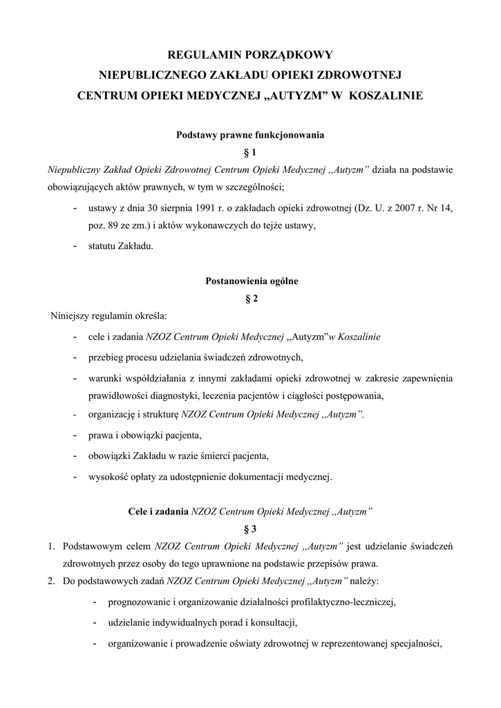 REGULAMIN PORZĄDKOWY NIEPUBLICZNEGO ZAKŁADU OPIEKI ZDROWOTNEJ CENTRUM OPIEKI MEDYCZNEJ ,,AUTYZM” W KOSZALINIE Podstawy prawne funkcjonowania §1 Niepubliczny Zakład Opieki Zdrowotnej Centrum Opieki Medycznej ,,Autyzm” działa na podstawie obowiązujących aktów prawnych, w tym w szczególności; - ustawy z dnia 30 sierpnia 1991 r. o zakładach opieki zdrowotnej (Dz. U. z 2007 r. Nr 14, poz. 89 ze zm.) i aktów wykonawczych do tejże ustawy, - statutu Zakładu. Postanowienia ogólne §2 Niniejszy regulamin określa: - cele i zadania NZOZ Centrum Opieki Medycznej ,,Autyzm”w Koszalinie - przebieg procesu udzielania świadczeń zdrowotnych, - warunki współdziałania z innymi zakładami opieki zdrowotnej w zakresie zapewnienia prawidłowości diagnostyki, leczenia pacjentów i ciągłości postępowania, - organizację i strukturę NZOZ Centrum Opieki Medycznej ,,Autyzm”, - prawa i obowiązki pacjenta, - obowiązki Zakładu w razie śmierci pacjenta, - wysokość opłaty za udostępnienie dokumentacji medycznej. Cele i zadania NZOZ Centrum Opieki Medycznej ,,Autyzm” §3 1. Podstawowym celem NZOZ Centrum Opieki Medycznej ,,Autyzm” jest udzielanie świadczeń zdrowotnych przez osoby do tego uprawnione na podstawie przepisów prawa. 2. Do podstawowych zadań NZOZ Centrum Opieki Medycznej ,,Autyzm” należy: - prognozowanie i organizowanie działalności profilaktyczno-leczniczej, - udzielanie indywidualnych porad i konsultacji, - organizowanie i prowadzenie oświaty zdrowotnej w reprezentowanej specjalności, - współdziałanie z innymi jednostkami organizacyjnymi służby zdrowia, szkołami, zakładami pracy, organizacjami i stowarzyszeniami, - orzekanie i opiniowanie o stanie zdrowia, Przebieg procesu udzielania świadczeń zdrowotnych w NZOZ Centrum Opieki Medycznej ,,Autyzm” §4 1. NZOZ Centrum Opieki Medycznej ,,Autyzm” organizuje świadczenia zdrowotne z zakresu opieki profilaktycznej, leczniczej, rehabilitacyjnej, terapeutycznej osób niepełnosprawnych ze szczególnym uwzględnieniem osób z autyzmem, w sposób zapewniający pacjentom najdogodniejszą formę korzystania ze świadczeń. 2. Rejestracja pacjentów odbywa się zarówno osobiście (bądź przez członków rodziny, czy też osoby trzecie), jak i telefonicznie, z wyznaczeniem dnia i godziny realizacji świadczenia zdrowotnego. 3. Świadczenia zdrowotne udzielane są w dniu zgłoszenia lub w terminie uzgodnionym z pacjentem. 4. NZOZ Centrum Opieki Medycznej ,,Autyzm” udziela bezpłatnych świadczeń zdrowotnych osobom ubezpieczonym w Narodowym Funduszu Zdrowia. §5 1. Lekarze udzielający świadczeń zdrowotnych w NZOZ Centrum Opieki Medycznej ,,Autyzm” kierują ubezpieczonych zapisanych na swoje listy, na konsultacje specjalistyczne, leczenie szpitalne bądź zabiegi fizjoterapeutyczne przez wystawienie skierowania. 2. Bez skierowania są udzielane świadczenia na zasadach określonych w ustawie o powszechnym ubezpieczeniu zdrowotnym. 3. Skierowanie na konsultację, poradę specjalistyczną lub planowaną hospitalizację, musi być poprzedzone badaniami diagnostycznymi, uzasadniającymi i uzupełniającymi skierowanie, należącymi do zakresu badań diagnostycznych lekarza podstawowej opieki zdrowotnej. Warunki współdziałania z innymi zakładami opieki zdrowotnej w zakresie zapewnienia prawidłowości diagnostyki, leczenia pacjentów i ciągłości postępowania, §6 1. NZOZ Centrum Opieki Medycznej ,,Autyzm” prowadzi, przechowuje i udostępnia dokumentację medyczną osób korzystających ze świadczeń zdrowotnych Zakładu zgodnie z zasadami określonymi w przepisach prawa. 2. NZOZ Centrum Opieki Medycznej ,,Autyzm” udostępnia dokumentację, o której mowa wyżej podmiotom i organom uprawnionym na podstawie przepisów prawa, a w razie śmierci pacjenta – osobie przez niego upoważnionej do uzyskania informacji w przypadku jego zgonu. 3. Udostępnianie dokumentacji następuje w trybie zapewniającym zachowanie poufności i ochrony danych osobowych. Organizacja i struktura NZOZ Centrum Opieki Medycznej ,,Autyzm” §7 1. W NZOZ Centrum Opieki Medycznej ,,Autyzm” z siedzibą w Koszalinie funkcjonują następujące jednostki i komórki organizacyjne – prowadzące działalność medyczną: nazwa jednostki: Poradnia Diagnostyczno-Konsultacyjna dla Osób z Autyzmem nazwa komórek: 1. Poradnia dla osób z autyzmem dziecięcym ul. Andersa 26 75-815 Koszalin 2. Poradnia psychologiczna ul. Andersa 26 75-815 Koszalin 3. Poradnia logopedyczna ul. Andersa 26 75-815 Koszalin 4. Pracownia kinezyterapii ul. Andersa 26 75-815 Koszalin 5. Poradnia rehabilitacji leczniczej ul. Andersa 26 75-815 Koszalin 6. Poradnia zdrowia psychicznego dla dzieci, młodzieży i ich rodzin ul. Andersa 26 75-815 Koszalin §8 1. NZOZ Centrum Opieki Medycznej ,,Autyzm” kieruje Kierownik i reprezentuje go na zewnątrz. 2. Podczas nieobecności Kierownika zastępuje go upoważniony przez niego pracownik. 3. Do obowiązków i uprawnień Kierownika NZOZ Centrum Opieki Medycznej ,,Autyzm” należy między innymi: - organizowanie i kierowanie pracą podległych pracowników, - zapewnienie racjonalnego wykorzystania czasu pracy oraz sprawowanie nadzoru nad przestrzeganiem dyscypliny podległych pracowników, - podejmowanie decyzji w sprawach zatrudnienia, wynagradzania, karania i zwalniania pracowników NZOZ Centrum Opieki Medycznej ,,Autyzm”. Prawa i obowiązki pacjenta §9 1. W czasie korzystania ze świadczeń medycznych w NZOZ Centrum Opieki Medycznej ,,Autyzm” pacjent oraz jego przedstawiciel ustawowy lub opiekun mają prawo do: - poszanowania godności oraz uprzejmego traktowania przez personel medyczny, - świadczenia usług zdrowotnych przez personel o odpowiednich kwalifikacjach, zgodnie z wymaganiami wiedzy medycznej, - rzetelnej informacji o stanie zdrowia, - wyrażania zgody na udzielenie określonych świadczeń zdrowotnych lub ich odmowy, po uzyskaniu informacji o proponowanych metodach diagnostycznych, 2. Do o
