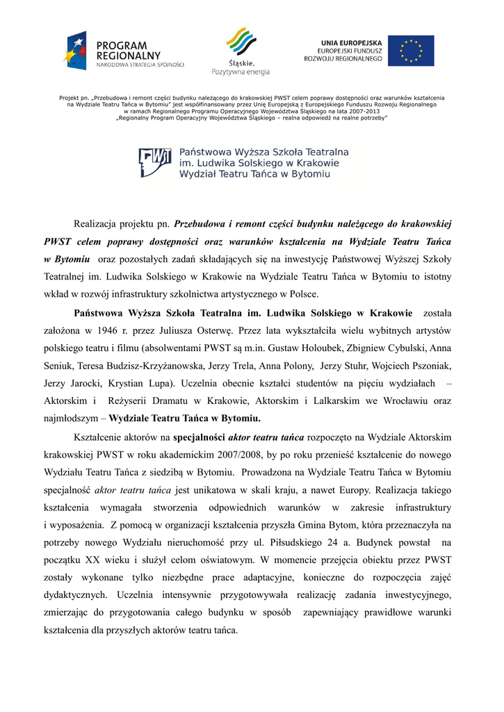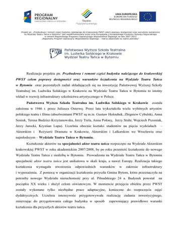 Projekt pn. „Przebudowa i remont części budynku należącego do krakowskiej PWST celem poprawy dostępności oraz warunków kształcenia na Wydziale Teatru Tańca w Bytomiu” jest współfinansowany przez Unię Europejską z Europejskiego Funduszu Rozwoju Regionalnego w ramach Regionalnego Programu Operacyjnego Województwa Śląskiego na lata 2007-2013 „Regionalny Program Operacyjny Województwa Śląskiego – realna odpowiedź na realne potrzeby” Realizacja projektu pn. Przebudowa i remont części budynku należącego do krakowskiej PWST celem poprawy dostępności oraz warunków kształcenia na Wydziale Teatru Tańca w Bytomiu oraz pozostałych zadań składających się na inwestycję Państwowej Wyższej Szkoły Teatralnej im. Ludwika Solskiego w Krakowie na Wydziale Teatru Tańca w Bytomiu to istotny wkład w rozwój infrastruktury szkolnictwa artystycznego w Polsce. Państwowa Wyższa Szkoła Teatralna im. Ludwika Solskiego w Krakowie została założona w 1946 r. przez Juliusza Osterwę. Przez lata wykształciła wielu wybitnych artystów polskiego teatru i filmu (absolwentami PWST są m.in. Gustaw Holoubek, Zbigniew Cybulski, Anna Seniuk, Teresa Budzisz-Krzyżanowska, Jerzy Trela, Anna Polony, Jerzy Stuhr, Wojciech Pszoniak, Jerzy Jarocki, Krystian Lupa). Uczelnia obecnie kształci studentów na pięciu wydziałach Aktorskim i – Reżyserii Dramatu w Krakowie, Aktorskim i Lalkarskim we Wrocławiu oraz najmłodszym – Wydziale Teatru Tańca w Bytomiu. Kształcenie aktorów na specjalności aktor teatru tańca rozpoczęto na Wydziale Aktorskim krakowskiej PWST w roku akademickim 2007/2008, by po roku przenieść kształcenie do nowego Wydziału Teatru Tańca z siedzibą w Bytomiu. Prowadzona na Wydziale Teatru Tańca w Bytomiu specjalność aktor teatru tańca jest unikatowa w skali kraju, a nawet Europy. Realizacja takiego kształcenia wymagała stworzenia odpowiednich warunków w zakresie infrastruktury i wyposażenia. Z pomocą w organizacji kształcenia przyszła Gmina Bytom, która przeznaczyła na potrzeby nowego Wydziału nieruchomość przy ul. Piłsudskiego 24 a. Budynek powstał na początku XX wieku i służył celom oświatowym. W momencie przejęcia obiektu przez PWST zostały wykonane tylko niezbędne prace adaptacyjne, konieczne do rozpoczęcia zajęć dydaktycznych. Uczelnia intensywnie przygotowywała realizację zadania inwestycyjnego, zmierzając do przygotowania całego budynku w sposób kształcenia dla przyszłych aktorów teatru tańca. zapewniający prawidłowe warunki W 2011 r. zakończono prace projektowe, wyłoniono w wyniku postępowań przetargowych inżyniera kontraktu i wykonawcę robót budowlanych. W czerwcu 2011 roku rozpoczęto prowadzenie robót budowlanych. Realizację rzeczową projektu zakończono w planowanym terminie, tj. w styczniu 2013 roku. Realizacja projektu pn. Przebudowa i remont części budynku należącego do krakowskiej PWST celem poprawy dostępności oraz warunków kształcenia na Wydziale Teatru Tańca w Bytomiu dzięki dofinansowaniu przez Unię Europejską z Europejskiego Funduszu Rozwoju Regionalnego w ramach Regionalnego Programu Operacyjnego Województwa Śląskiego na lata 2007-2013 pozwoliła na dostosowanie budynku do aktualnych przepisów techniczno-budowlanych i normatywów, poprawienie stanu technicznego i estetyki ogólnej wnętrza i elewacji. Projekt obejmował prace na II i III piętrze budynku. Dzięki środkom finansowym Ministra Kultury i Dziedzictwa Narodowego udało się również przeprowadzić prace na poziomie piwnic, parteru i pierwszego piętra budynku WTT. Prace termomodernizacyjne wykonano dzięki dofinansowaniu Wojewódzkiego Funduszu Ochrony Środowiska i Gospodarki Wodnej w Katowicach. Całkowita wartość inwestycji: 9.795.470 zł Inwestycja została zrealizowana dzięki dofinansowaniu: - Unii Europejskiej z Europejskiego Funduszu Rozwoju Regionalnego w ramach Regionalnego Programu Operacyjnego Województwa Śląskiego na lata 2007-2013, wartość dofinansowania: 2.955.067,36 zł, projekt pn. „Przebudowa i remont części budynku należącego do krakowskiej PWST celem poprawy dostępności oraz warunków kształcenia na Wydziale Teatru Tańca w Bytomiu”, - Ministra Kultury i Dziedzictwa Narodowego, wartość dofinansowania: 4.835.000 zł, dotacja budżetowa i środki w wysokości 600.000 zł z Programu Operacyjnego Rozwój infrastruktury kultury, priorytet Infrastruktura szkolnictwa artystycznego na zadanie pn. „Przebudowa i remont budynku PWST WTT w Bytomiu”, - Gminy Bytom, dotacja celowa w wysokości 730.000 zł, - Wojewódzkiego Funduszu Ochrony Środowiska i Gospodarki Wodnej w Katowicach, wartość dofinansowania: 84.946 zł, projekt pn. „Termomodernizacja budynku Wydziału Teatru Tańca w Bytomiu ul. Piłsudskiego 24a”, - oraz środków własnych PWST. W wyremontowanym budynku znajduje się 8 sal do ćwiczeń przystosowanych do zajęć z tańca oraz gry aktorskiej, 3 sale do zajęć teoretycznych, biblioteka, sala gimnastyczna, garderoby, pomieszczenia administracyjne, pokoje gościnne, zaplecze sanitarne i techniczne. W budynku przeprowadzono termomodernizację, został przystosowany dla osób niepełnosprawnych, wyposażony w wentylację mechaniczną, a sale ćwiczeń w klimatyzację. Dzięki wykonanej elewacji obiekt otrzymał nowy wyraz architektoniczny. PROJEKT REALIZOWALI Projekt architektoniczny: Pracownia architektoniczna MEZZANINO Magdalena Płocica, Zabrze Generalny Wykonawca - konsorcjum w składzie: Bałtycka Instytucja Gospodarki Budżetowej BALTICA, Gdańsk DIWAL Jerzy Cytacki, Leszek Królicki spółka jawna, Gliwice Podwykonawcy: REWITAL-SERWIS sp. z o.o., Katowice - wykonanie inst. c.o., wod.kan., kotłowni, przyłącza kanalizacji deszczowej i sanitarnej, instalacji elektrycznych i słaboprądowych GEOPROJEKT sp. z o.o., Wrocław - wykonanie wzmocnienia posadowienia budynku EEA INVEST sp. z o.o., Katowice - wykonanie instalacji wentylacji i klimatyz