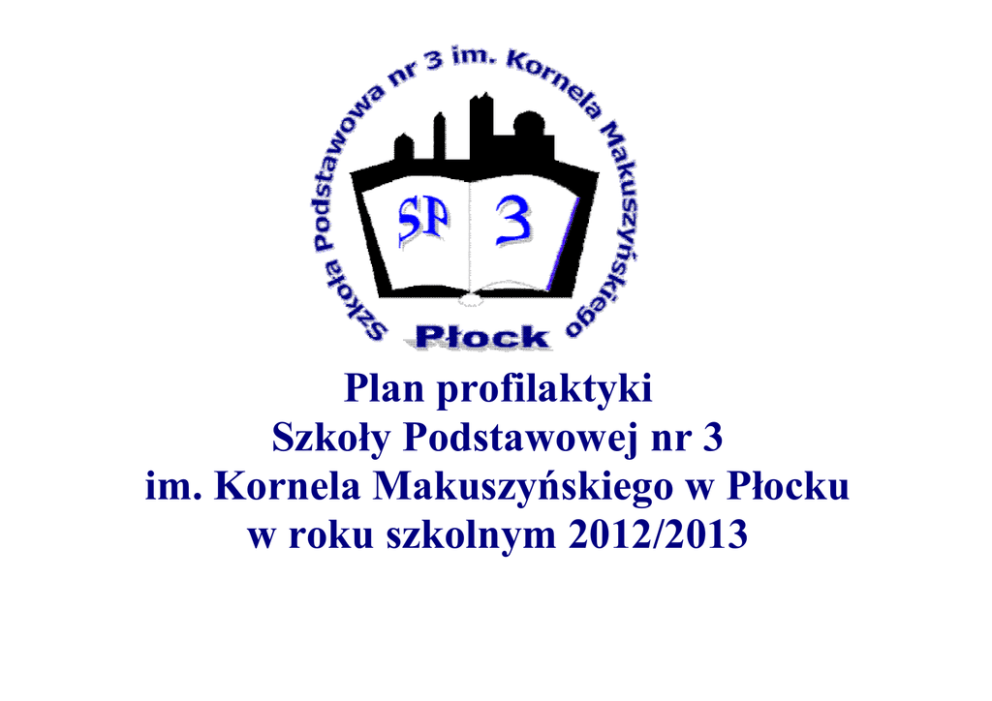 Plan profilaktyki Szkoły Podstawowej nr 3 im. Kornela Makuszyńskiego w Płocku w roku szkolnym 2012/2013 Obszar Zadania / rodzaj działania: działania: Sposoby realizacji: Terminy realizacji: Osoby realizujące: Pogadanki: Promocja zdrowego stylu życia - zdrowie i bezpieczeństwo Kształcenie higieny osobistej, higieny uczenia się i odżywiania się, zdrowego stylu życia: - zapoznanie uczniów z czynnikami, które szkodzą zdrowiu, wzmacnianie nawyków higienicznych podczas lekcji nauczania zintegrowanego, przyrody, godzin wychowawczych - Savoire – vivre przy stole: o kulturalnych nawykach oraz skutkach hałasu podczas jedzenia. Pogadanki w klasach oraz modelowanie zachowań uczniów podczas spożywania posiłków w klasie i stołówce szkolnej - wdrażanie nawyków prawidłowego odżywiania, zdrowego stylu życia, zapobieganie chorobom: - „SZKLANKA MLEKA” kl. I -VI wg programów: kszt. wychowawcy, zintegr. , przyrody i planów nauczyciele e.w i przyrody wychowawców wszyscy nauczyciele I/II okres nauczyciele klas I -VI - Program promocji zdrowia: „Racjonalne odżywianie –co jeść na drugie śniadanie?” kl. I-VI „Zapobieganie WZW” kl. I-VI wg terminarza pielęgniarki „Zapobieganie wadom wzroku.” kl. I-VI w I i II okresie „Prawidłowa postawa ciała” kl. I-VI „Choroba menigokokowa” kl. I-VI „Jak należy dbać o higienę?” – kl. I-III „Czy to, co mi najbardziej smakuje jest zawsze dobre dla mojego organizmu?” – kl. I-III „Znaczenie odpoczynku dla zdrowia człowieka.” kl. I-III „Od kogo (od czego) zależy to, czy będę czuł się dobrze?” – kl. I-III „Czy to, co mi najbardziej smakuje jest zawsze dobre dla mojego organizmu?” – kl. I-III „Higiena sportu” – kl. IV-VI „Jak dbać o czystość otoczenia?” – kl. IV-VI „Znaczenie norm higienicznych w życiu człowieka” kl. IV-VI „Co to jest cukrzyca?” kl. IV-VI „AIDS choroba, której nie należy się bać, lecz dużo o niej wiedzieć.” – kl. IV-VI 2 pielęgniarka szkolna Obszar Zadania / rodzaj działania: działania: Promocja zdrowego stylu życia - zdrowie i bezpieczeństwo Kształcenie higieny osobistej, higieny uczenia się i odżywiania się, zdrowego stylu życia: Sposoby realizacji: Terminy realizacji: Osoby realizujące: - Świadczenia stomatologiczne: badanie, leczenie, lakierowanie zębów. I/II okres - Program edukacyjny: „Higiena jamy ustnej” – indywidualny instruktaż w gabinecie. kl. I - VI I/II okres Wizyta adaptacyjna w gabinecie stomatologicznym – klasy I. stomatolog - Program profilaktyczny” Ostatni dzwonek. Nie dla meningokoków.” koordynator: K. Podolewska wych. kl. IV-VI II okres higienistka, - wdrażanie do racjonalnego korzystania z mediów komputera, gier itp. początek roku – podczas organizacji pracy na lekcjach informatyki szkolnego i na każdej lekcji n. informatyki nauczyciele e.w - zwracanie uwagi na utrzymywanie prawidłowej postawy fizycznej ucznia, Ogólnopolska akcja „Lekkie tornistry”, szczególne monitorowanie w klasach IV-VI. początek roku szkolnego i na każdej lekcji wszyscy nauczyciele rodzice początek roku szkolnego i na bieżąco opiekunowie sal lekcyjnych początek roku szkolnego i na bieżąco instruktorzy gimnastyki korekcyjnej początek roku szkolnego i na bieżąco logopeda wg kalendarza imprez sportowych nauczyciele wych. fiz. i. e.w wychowawcy - monitorowanie dostosowania krzeseł i ławek do aktualnego wzrostu dzieci, - zapewnienie uczniom z wadami postawy możliwości korzystania z zajęć gimnastyki korekcyjnej w szkole i na basenie - profilaktyka logopedyczna: indywidualne zajęcia z dziećmi, współpraca z rodzicami i nauczycielami - rozgrywki, zawody i konkursy sportowe w różnych dyscyplinach sportowych 3 Obszar Zadania / rodzaj działania: działania: Promocja zdrowego stylu życia - zdrowie i bezpieczeństwo Bezpieczeństwo uczniów w szkole i poza szkołą: Sposoby realizacji: Terminy realizacji: Osoby realizujące: Program profilaktyczny dla klas I-III „Bezpieczna szkoła – przyjazna i I/II okres wesoła ” koord. J.Osiecka nauczyciele e.w. - Projekt edukacyjny dla uczniów klas I-III „Bezpieczna szkoła z Koziołkiem Matołkiem” I/II okres koord. M. Jeznach nauczyciele e.w. - wzmacnianie nawyków bezpiecznego poruszania się po drogach i ulicach – pogadanki oraz praktyczne ćwiczenia, 3 razy w roku (rozpoczęcie roku, przed feriami i wakacjami) wszyscy nauczyciele Straż Miejska pedagog - rozmowy, pogadanki przed feriami, wycieczkami, wakacjami. na bieżąco wszyscy nauczyciele - pogadanki na temat bezpiecznego zachowania na przerwach na bieżąco wszyscy nauczyciele - działanie monitoringu wewnątrz i na zewnątrz szkoły na bieżąco dyrekcja szkoły - realizacja statutowych obowiązków w zakresie zapewnienia na bieżąco bezpieczeństwa uczniów, szczególnie sumienne wypełnianie dyżurów nauczycieli podczas przerw wszyscy nauczyciele - reagowanie na zagrożenie bezpieczeństwa według ustalonych procedur i Statutu Szkoły w. nauczyciele i pracownicy szkoły 4 na bieżąco Obszar Zadania / rodzaj działania: działania: Promocja zdrowego stylu życia - zdrowie i bezpieczeństwo Bezpieczeństwo uczniów w szkole i poza szkołą: Sposoby realizacji: Terminy realizacji: Osoby realizujące: - Ogólnopolska akcja edukacyjno-informacyjna „Bezpieczeństwo dziecka na drodze 2012” we współpracy ze STATOIL wrzesień 2012r k. dyr. I. AniołDziadkowiec wych. kl. I - „Konkurs o ruchu drogowym” dla klas I - III I/II okres M. Mikołajczyk M. Marciniak - przeprowadzenie próby ewakuacyjnych z budynku szkoły 2 razy w roku dyrekcja szkoły - przegląd budynku pod względem BHP na bieżąco powołany zespół -Program profilaktyczny „Uczeń SP 3 bezpieczny w sieci” Dzień Bezpiecznego Internetu. luty 2013 r. n. informatyki nauczyciele e.w. psycholog - Program zapobiegający stosowaniu agresji i przemocy„Agresji stop” – zajęcia warsztatowe w klasach młodszy