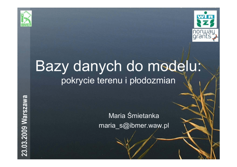 Bazy danych do modelu: pokrycie terenu i płodozmian Maria Śmietanka [email protected] Spis treści • zebrane dane • stworzenie mapy • płodozmian Dane • multispektralne zdjęcie satelitarne z satelity środowiskowego Landsat – 8 maja 2001 • dane statystyczne o gospodarstwach w poszczególnych gminach Obszar zlewni Zgłowiączki Podstawowe typy użytkowania ziemi • grunty orne • lasy • łąki • obszary zabudowane Typy upraw Mapa użytkowania • Prosta koncepcja na jednym zdjęciu z satelity Landsat • Klasyfikacja nienadzorowana • W przyszłości rozbudowanie do większej ilości danych (zobrazowania hiperspektralne, multitemporalne, dokładność subpikselowa) Klasyfikacja Tabela atrybutów • zliczone powierzchnie i procent powierzchni w obrębie zlewni • podstawa dopasowania odpowiednich upraw Podział gruntów ornych Płodozmian • informacje literaturowe • dane z RZGW • wizje lokalne • wprowadzone uprawy i zabiegi agrotechniczne Dziękuję za uwagę