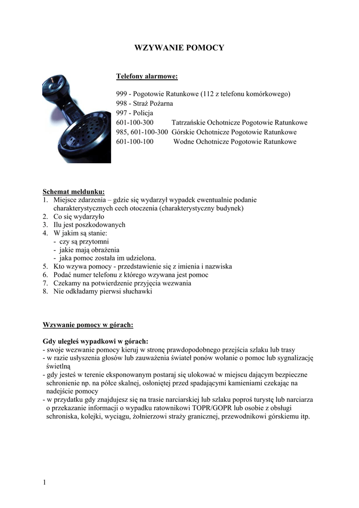 WZYWANIE POMOCY Telefony alarmowe: 999 - Pogotowie Ratunkowe (112 z telefonu komórkowego) 998 - Straż Pożarna 997 - Policja 601-100-300 Tatrzańskie Ochotnicze Pogotowie Ratunkowe 985, 601-100-300 Górskie Ochotnicze Pogotowie Ratunkowe 601-100-100 Wodne Ochotnicze Pogotowie Ratunkowe Schemat meldunku: 1. Miejsce zdarzenia – gdzie się wydarzył wypadek ewentualnie podanie charakterystycznych cech otoczenia (charakterystyczny budynek) 2. Co się wydarzyło 3. Ilu jest poszkodowanych 4. W jakim są stanie: - czy są przytomni - jakie mają obrażenia - jaka pomoc została im udzielona. 5. Kto wzywa pomocy - przedstawienie się z imienia i nazwiska 6. Podać numer telefonu z którego wzywana jest pomoc 7. Czekamy na potwierdzenie przyjęcia wezwania 8. Nie odkładamy pierwsi słuchawki Wzywanie pomocy w górach: Gdy uległeś wypadkowi w górach: - swoje wezwanie pomocy kieruj w stronę prawdopodobnego przejścia szlaku lub trasy - w razie usłyszenia głosów lub zauważenia świateł ponów wołanie o pomoc lub sygnalizację świetlną - gdy jesteś w terenie eksponowanym postaraj się ulokować w miejscu dającym bezpieczne schronienie np. na półce skalnej, osłoniętej przed spadającymi kamieniami czekając na nadejście pomocy - w przydatku gdy znajdujesz się na trasie narciarskiej lub szlaku poproś turystę lub narciarza o przekazanie informacji o wypadku ratownikowi TOPR/GOPR lub osobie z obsługi schroniska, kolejki, wyciągu, żołnierzowi straży granicznej, przewodnikowi górskiemu itp. 1 Powiadomienie o wypadku: - postaraj się określić miejsce skąd dochodzi sygnał - odnieś swoją pozycję do otoczenia, aby trafić lub wskazać to miejsce ponownie - postaraj się zapamiętać możliwie dużo szczegółów dotyczących miejsca wypadku i w miarę możliwości samego poszkodowanego - jeśli jest was kilkoro, zostaw kogoś na miejscu wypadku z poszkodowanym i możliwie szybko wezwij pomoc Międzynarodowy kod górski: - na pomoc: 6 sygnałów co 10 s - 1 min. przerwy - odpowiedź: 3 sygnały co 20 s - 1 min. przerwy Wysłanie posłańca - najlepiej dwóch razem i zapisać informację na kartkach Pozycje YES i NO sygnały dla śmigłowca: - YES - potrzebuję pomocy - NO - nie potrzebuję pomocy 2 Bibliography: 1. Medycyna Ratunkowa wyd. Urban & Partner pod redakcją prof. Juliusza Jakubaszki 2. Basic Trauma Life Support course book 3. Wytyczne Resuscytacji Krążeniowo – Oddechowej 2005 Polskiej Rady Resuscytacji 4. Kurs pierwszej pomocy HSR Konspekty zajęć copyright by [email protected] 3