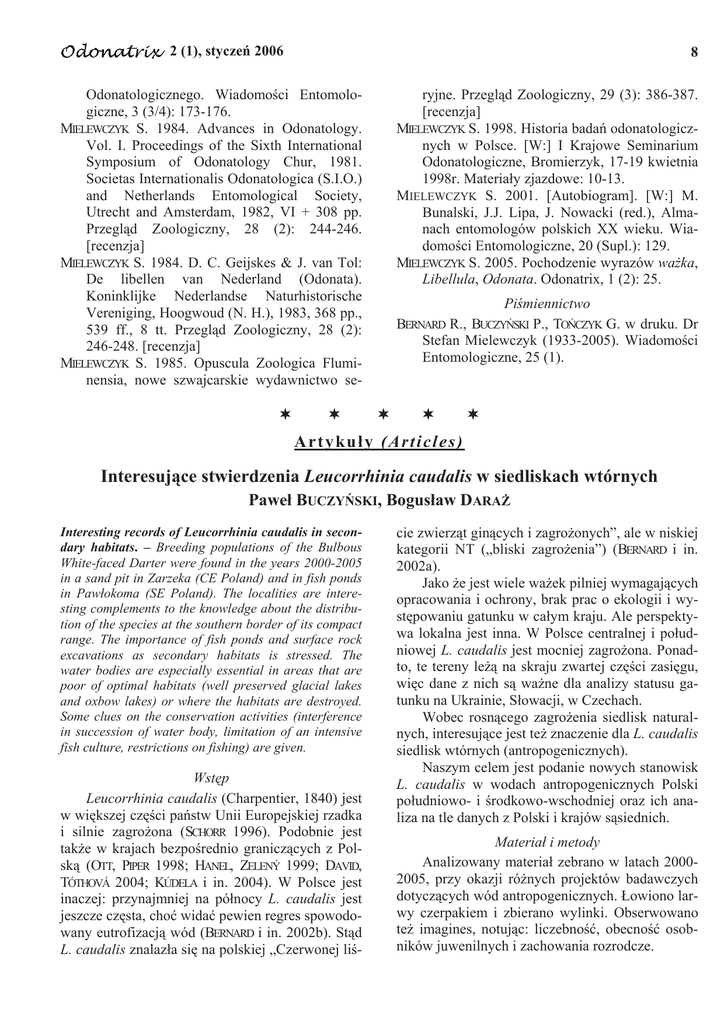 2 (1), styczeĔ 2006 8 Odonatologicznego. WiadomoĞci Entomologiczne, 3 (3/4): 173-176. MIELEWCZYK S. 1984. Advances in Odonatology. Vol. I. Proceedings of the Sixth International Symposium of Odonatology Chur, 1981. Societas Internationalis Odonatologica (S.I.O.) and Netherlands Entomological Society, Utrecht and Amsterdam, 1982, VI + 308 pp. Przegląd Zoologiczny, 28 (2): 244-246. [recenzja] MIELEWCZYK S. 1984. D. C. Geijskes & J. van Tol: De libellen van Nederland (Odonata). Koninklijke Nederlandse Naturhistorische Vereniging, Hoogwoud (N. H.), 1983, 368 pp., 539 ff., 8 tt. Przegląd Zoologiczny, 28 (2): 246-248. [recenzja] MIELEWCZYK S. 1985. Opuscula Zoologica Fluminensia, nowe szwajcarskie wydawnictwo se- ryjne. Przegląd Zoologiczny, 29 (3): 386-387. [recenzja] MIELEWCZYK S. 1998. Historia badaĔ odonatologicznych w Polsce. [W:] I Krajowe Seminarium Odonatologiczne, Bromierzyk, 17-19 kwietnia 1998r. Materiaáy zjazdowe: 10-13. MIELEWCZYK S. 2001. [Autobiogram]. [W:] M. Bunalski, J.J. Lipa, J. Nowacki (red.), Almanach entomologów polskich XX wieku. WiadomoĞci Entomologiczne, 20 (Supl.): 129. MIELEWCZYK S. 2005. Pochodzenie wyrazów waĪka, Libellula, Odonata. Odonatrix, 1 (2): 25. PiĞmiennictwo BERNARD R., BUCZYēSKI P., TOēCZYK G. w druku. Dr Stefan Mielewczyk (1933-2005). WiadomoĞci Entomologiczne, 25 (1). Artykuáy (Articles) Interesujące stwierdzenia Leucorrhinia caudalis w siedliskach wtórnych Paweá BUCZYēSKI, Bogusáaw DARAĩ Interesting records of Leucorrhinia caudalis in secondary habitats. – Breeding populations of the Bulbous White-faced Darter were found in the years 2000-2005 in a sand pit in Zarzeka (CE Poland) and in fish ponds in Pawáokoma (SE Poland). The localities are interesting complements to the knowledge about the distribution of the species at the southern border of its compact range. The importance of fish ponds and surface rock excavations as secondary habitats is stressed. The water bodies are especially essential in areas that are poor of optimal habitats (well preserved glacial lakes and oxbow lakes) or where the habitats are destroyed. Some clues on the conservation activities (interference in succession of water body, limitation of an intensive fish culture, restrictions on fishing) are given. WstĊp Leucorrhinia caudalis (Charpentier, 1840) jest w wiĊkszej czĊĞci paĔstw Unii Europejskiej rzadka i silnie zagroĪona (SCHORR 1996). Podobnie jest takĪe w krajach bezpoĞrednio graniczących z Polską (OTT, PIPER 1998; HANEL, ZELENÝ 1999; DAVID, TÓTHOVÁ 2004; KÚDELA i in. 2004). W Polsce jest inaczej: przynajmniej na póánocy L. caudalis jest jeszcze czĊsta, choü widaü pewien regres spowodowany eutrofizacją wód (BERNARD i in. 2002b). Stąd L. caudalis znalazáa siĊ na polskiej „Czerwonej liĞ- cie zwierząt ginących i zagroĪonych”, ale w niskiej kategorii NT („bliski zagroĪenia”) (BERNARD i in. 2002a). Jako Īe jest wiele waĪek pilniej wymagających opracowania i ochrony, brak prac o ekologii i wystĊpowaniu gatunku w caáym kraju. Ale perspektywa lokalna jest inna. W Polsce centralnej i poáudniowej L. caudalis jest mocniej zagroĪona. Ponadto, te tereny leĪą na skraju zwartej czĊĞci zasiĊgu, wiĊc dane z nich są waĪne dla analizy statusu gatunku na Ukrainie, Sáowacji, w Czechach. Wobec rosnącego zagroĪenia siedlisk naturalnych, interesujące jest teĪ znaczenie dla L. caudalis siedlisk wtórnych (antropogenicznych). Naszym celem jest podanie nowych stanowisk L. caudalis w wodach antropogenicznych Polski poáudniowo- i Ğrodkowo-wschodniej oraz ich analiza na tle danych z Polski i krajów sąsiednich. Materiaá i metody Analizowany materiaá zebrano w latach 20002005, przy okazji róĪnych projektów badawczych dotyczących wód antropogenicznych. àowiono larwy czerpakiem i zbierano wylinki. Obserwowano teĪ imagines, notując: liczebnoĞü, obecnoĞü osobników juwenilnych i zachowania rozrodcze. 2 (1), styczeĔ 2006 9 Pomiary wáasnoĞci wody w piaskowni w Zarzece wykonano 26 IV 2000, pH-metrem Slandi PH204 i konduktometrem Slandi CM 204. WyróĪnienia gatunków w „Wynikach” oznaczają: * – stwierdzenie rozwoju (obecnoĞü larw, wylinek i/lub juwenilnych imagines); # – rozwój prawdopodobny (obecnoĞü tylko imagines, obserwacje zachowaĔ rozrodczych). Dokumentacja badaĔ i materiaá dowodowy są zdeponowane w kolekcjach autorów. 1 at i pj Pr ep Wi W i sá a Lublin Cheám m, uĪytkowane jako kąpielisko. Dno piaszczyste, woda przezroczysta, Īóátawa. Páytsza strefa przybrzeĪna szeroka, bez roĞlin lub z rzadkim szuwarem Heleocharis sp., tylko miejscami zamulone páaty Phragmites australis i Typha latifolia z domieszką Ceratophyllum demersum. Przewodnictwo elektrolityczne: 197 µS·cm-1, pH: 7,97. Materiaá: 26 IV 2000, 2 larwy w C. demersum miĊdzy roĞlinnoĞcią szuwarową. Inne waĪki: Ischnura elegans (Vander L.)*, Enallagma cyathigerum (Charp.)*, Coenagrion puella (L.)*, C. pulchellum (Vander L.)*, Gomphus vulgatissimus (L.)*, Anax imperator Leach*, Libellula quadrimaculata L.*, Orthetrum albistylum (Sél.)*. Lista niepeána, oparta na jednej kontroli (26 IV 2000). Bu rz g ZamoĞü Tarnobrzeg Sa n Rzeszów 2 Lviv PrzemyĞl Krosno is Dn t er 0 10 50 km A B C Rys. 1. Stanowiska Leucorrhinia caudalis w Polsce poáudniowo-wschodniej i na sąsiednich obszarach: A – nowe dane, B – inne stanowiska wspóáczesne, C – dane historyczne. Numery nowych stanowisk jak w tekĞcie. Fig. 1. Localities of Leucorrhinia caudalis in the southeastern Poland and its vicinities: A – new data, B – other contemporary existing populations, C – historical data. Numbering of new localities like in the text. Wyniki L. caudalis stwierdzono na dwóch nowych stanowiskach w wodach antropogenicznych (Rys. 1): 1. Zarzeka ad DĊblin (51°32’07” N, 21°51'19” E; EC50), prawobrzeĪna czĊĞü doliny Wisáy, piaskownia na skraju áąk i lasu mieszanego. Cztery zbiorniki o powierzchni 30-80 ar i gáĊbokoĞ