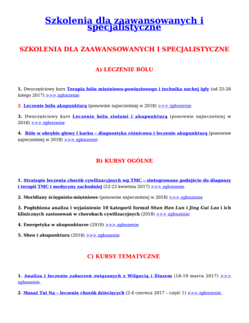 Szkolenia dla zaawansowanych i specjalistyczne SZKOLENIA DLA ZAAWANSOWANYCH I SPECJALISTYCZNE A) LECZENIE BÓLU 1. Dwuczęściowy kurs Terapia bólu mięśniowo-powięziowego i technika suchej igły (od 25-26 lutego 2017) >>> zgłoszenie 2. Leczenie bólu akupunkturą (ponownie najwcześniej w 2018) >>> zgłoszenie 3. Dwuczęściowy kurs Leczenie bólu ziołami i akupunkturą (ponownie najwcześniej w 2018) >>> zgłoszenie 4. Bóle w obrębie głowy i karku – diagnostyka różnicowa i leczenie akupunkturą (ponownie najwcześniej w 2018) >>> zgłoszenie B) KURSY OGÓLNE 1. Strategie leczenia chorób cywilizacyjnych wg TMC – zintegrowane podejście do diagnozy i terapii TMC i medycyny zachodniej (22-23 kwietnia 2017) >>> zgłoszenie 2. Meridiany ścięgnisto-mięśniowe (ponownie najwcześniej w 2018) >>> zgłoszenie 3. Pogłębiona analiza i wyjaśnienie 10 kategorii formuł Shan Han Lun i Jing Gui Lao i ich klinicznych zastosowań w chorobach cywilizacyjnych (2018) >>> zgłoszenie 4. Energetyka w akupunkturze (2018) >>> zgłoszenie 5. Shen i akupunktura (2018) >>> zgłoszenie C) KURSY TEMATYCZNE 1. Analiza i leczenie zaburzeń związanych z Wilgocią i Śluzem (18-19 marca 2017) >>> zgłoszenie 2. Masaż Tui Na – leczenie chorób dziecięcych (2-4 czerwca 2017 – część 1) >>> zgłoszenie 3. Problemy związane ze starzeniem się (17-18 czerwca 2017) >>> zgłoszenie 4. Dolegliwości i chorób głowy i karku (24-25 czerwca 2017) >>> zgłoszenie 5. Choroby związane z nerkami (16-17 września 2017) >>> zgłoszenie 6. Tradycyjna medycyna chińska a nowotwory (30 września – 1 października 2017) >>> zgłoszenie 7. Choroby psychosomatyczne i psychiatryczne – leczenie akupunkturą i kroplami Bacha (58 października 2017) >>> zgłoszenie 8. Akupunktura brzucha (21-22 października 2017) >>> zgłoszenie 9. Akupunktura kosmetyczna 2017) >>> zgłoszenie i inne techniki kosmetologii chińskiej (10-12 listopada 10. Choroby i problemy związane z Wątrobą (18-19 listopada 2017) >>> zgłoszenie 11. Zmęczenie – przyczyny i terapia (23-26 listopada 2017) >>> zgłoszenie 12. Klucze do skutecznego leczenia akupunkturą – starożytne techniki nakłuwania i uzupełniające manipulacje (9-10 grudnia 2017) >>> zgłoszenie 13. Wybrane choroby zakaźne: borelioza, mononukleoza, grypa i inne (24-25 marca 2018) >>> zgłoszenie 14. Gotowe receptury ziołowe (22-23 października 2018 – część 1) >>> zgłoszenie 15. Masaż Tui Na – kurs dla zaawansowanych (2018) część 1: Reumatologia i problemy narządów ruchu (2018) część 2: Układ pokarmowy i układ oddechowy ( 2018) część 3: Układ nerwowy i krwionośny (2018) część 4: Dermatologia i choroby autoimmunologiczne (2019) część 5: Ginekologia (2019) część 6: Xiao Tui Na – Leczenie chorób dziecięcych (2019) Więcej informacji: Marek Kalmus, kom. 502-090-301 Bożena Miczulska-Kalmus, kom. 503-150-462 email: [email protected]