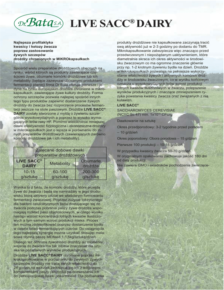 LIVE SACC® DAIRY Najlepsza profilaktyka kwasicy i ketozy Ŝwacza poprzez zastosowanie Ŝywych szczepów droŜdŜy chronionych w MIKROkapsułkach Spośród wielu preparatów droŜdŜowych obecnych na rynku, wśród których są produkty zawierające częściowo Ŝywe, obumarłe komórki droŜdŜowe lub ich metabolity (będące zazwyczaj ubocznymi produktami fermentacji piwnej) firma Dr Bata oferuje pierwsze i jedyne na rynku europejskim droŜdŜe chronione w mikrokapsułkach, zawierające Ŝywe kultury droŜdŜy. Forma ochrony szczepów pozwala najlepiej spośród innych tego typu produktów zapewnić dostarczenie Ŝywych droŜdŜy do Ŝwacza bez rozpoczęcia procesów fermentacji jeszcze na stole paszowym. DroŜdŜe LIVE SACC® DAIRY zostały stworzone z myślą o Ŝywieniu szczególnie wysokowydajnych a poprzez to wysoko wymagających krów rasy HF. Pomimo wielokrotnie mniejszej dawki efektywność fizjologiczna i ekonomiczna droŜdŜy w mikrokapsułkach jest o lepsza w porównaniu do innych preparatów droŜdŜowych (zawierających zarówno komórki droŜdŜowe jak i ich metabolity). produkty droŜdŜowe nie kapsułkowane zaczynają tracić swą aktywność juŜ w 2-3 godziny po dodaniu do TMR. Mikrokapsułkowanie zabezpiecza więc znacząco przed przedwczesnym i niepoŜądanym uaktywnieniem, które diametralnie skraca ich okres aktywności w środowisku Ŝwaczowym co ma ogromne znaczenie głównie przy np. 1-2 krotnym Ŝywieniu bydła na dzień. DroŜdŜe w mikrokapsułkach pozwalają na pełniejsze wykorzystanie właściwości Ŝywych i aktywnych komórek droŜdŜy w środowisku Ŝwaczowym, co w wyniku końcowym oznacza u wysokowydajnych krów wzrost produkcji lotnych kwasów tłuszczowych w Ŝwaczu, polepszenie wyników produkcyjnych i znaczące zmniejszeniem ryzyka powstania kwasicy Ŝwacza oraz związanych z nią kulawizn. LIVE SACC® SACCHAROMYCES CEREVISIAE (NCYC Sc 47) min. 1x1010 CFU/g Dawkowanie na sztukę Okres przedporodowy: 3-2 tygodnie przed porodem – 10 g/dzień Okres poporodowy: Obora porodowa – 15 g/dzień Pierwsze 100 produkcji – 10-15 g/dzień Zalecane dobowe dawki preparatów droŜdŜowych Obumarłe LIVE SACC® Metabolity droŜdŜe DAIRY 10-15 60-100 200-300 g/sztukę g/sztukę g/sztukę Wynika to z faktu, Ŝe komórki droŜdŜy, które przejdą Ŝywe do Ŝwacza i będą się namnaŜały w jego środowisku biorą aktywny udział we właściwym formowaniu fermentacji Ŝwaczowej. Poprzez zuŜycie toksycznego dla bakterii celulolitycznych tlenu dostającego się do Ŝwacza podczas pobrania paszy Ŝywe droŜdŜe wspomagają rozkład pasz objętościowych, w czego wyniku nastąpi wzrost koncentracji lotnych kwasów tłuszczowych a tym samym wzrost produkcji mleka. Proces ten moŜna zintesyfikować poprzez dostarczenie bydłu w dawce łatwo fermentujących cukrów. Do osiągnięcia tego najlepszą synergię moŜna uzyskać stosując melasową płynną paszę MElfeed 1-1,5kg/sztukę/dzień. Dlatego teŜ ochrona Ŝywotności droŜdŜy do momentu wejścia do Ŝwacza ma tak istotne znaczenie dla uzyskania poŜądanych wyników produkcyjnych. DroŜdŜe LIVE SACC® DAIRY chronione poprzez mikrokapsułkowanie w porównaniu do zwykłych Ŝywych szczepów droŜdŜy nie tracą swych właściwości do 24 godzin na wskutek zetknięcia się ich z wilgotnymi komponentami paszy (kiszonki) po domieszaniu ich do pełnoporcjowej dawki pokarmowej. Dla porównania W przypadku kwasicy Ŝwacza 50-70 g/dzień. W oryginalnym opakowaniu zachowuje jakość 180 dni od daty produkcji. Nie zawiera GMO i składników pochodzenia zwierzęcego. Wyniki stosowania LIVE SACC® DAIRY w Ŝywieniu wysokowydajnych HF krów będących w początkowym okresie laktacji (Grupa kontrolna 98 sztuk; Grupa doświadczalna 98 sztuk) Dystrybutor: Zainteresowanych zapraszamy do współpracy: Wyłączny importer: Ekopasz Tel: +48 691 888 973 Fax: +48 email: [email protected] Producent: Dr Bata Ltd 2364 Ócsa Pesti úti major, Węgry.