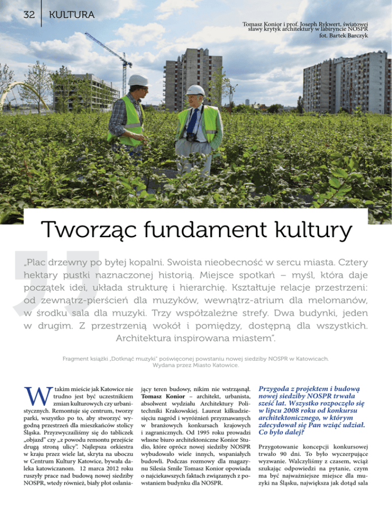 32 KULTURA Tomasz Konior i prof. Joseph Rykwert, światowej sławy krytyk architektury w labiryncie NOSPR fot. Bartek Barczyk Tworząc fundament kultury „Plac drzewny po byłej kopalni. Swoista nieobecność w sercu miasta. Cztery hektary pustki naznaczonej historią. Miejsce spotkań – myśl, która daje początek idei, układa strukturę i hierarchię. Kształtuje relacje przestrzeni: od zewnątrz-pierścień dla muzyków, wewnątrz-atrium dla melomanów, w środku sala dla muzyki. Trzy współzależne strefy. Dwa budynki, jeden w drugim. Z przestrzenią wokół i pomiędzy, dostępną dla wszystkich. Architektura inspirowana miastem”. Fragment książki „Dotknąć muzyki” poświęconej powstaniu nowej siedziby NOSPR w Katowicach. Wydana przez Miasto Katowice. W takim mieście jak Katowice nie trudno jest być uczestnikiem zmian kulturowych czy urbanistycznych. Remontuje się centrum, tworzy parki, wszystko po to, aby stworzyć wygodną przestrzeń dla mieszkańców stolicy Śląska. Przyzwyczailiśmy się do tabliczek „objazd” czy „z powodu remontu przejście drugą stroną ulicy”. Najlepsza orkiestra w kraju przez wiele lat, skryta na uboczu w Centrum Kultury Katowice, bywała daleka katowiczanom. 12 marca 2012 roku ruszyły prace nad budową nowej siedziby NOSPR, wtedy również, biały płot osłania- jący teren budowy, nikim nie wstrząsnął. Tomasz Konior – architekt, urbanista, absolwent wydziału Architektury Politechniki Krakowskiej. Laureat kilkudziesięciu nagród i wyróżnień przyznawanych w branżowych konkursach krajowych i zagranicznych. Od 1995 roku prowadzi własne biuro architektoniczne Konior Studio, które oprócz nowej siedziby NOSPR wybudowało wiele innych, wspaniałych budowli. Podczas rozmowy dla magazynu Silesia Smile Tomasz Konior opowiada o najciekawszych faktach związanych z powstaniem budynku dla NOSPR. Przygoda z projektem i budową nowej siedziby NOSPR trwała sześć lat. Wszystko rozpoczęło się w lipcu 2008 roku od konkursu architektonicznego, w którym zdecydował się Pan wziąć udział. Co było dalej? Przygotowanie koncepcji konkursowej trwało 90 dni. To było wyczerpujące wyzwanie. Walczyliśmy z czasem, wciąż szukając odpowiedzi na pytanie, czym ma być najważniejsze miejsce dla muzyki na Śląsku, największa jak dotąd sala KULTURA koncertowa w kraju. Po wygraniu konkursu radość była ogromna. Jednak wraz z całym zespołem stanęliśmy przed największym i skrajnie odpowiedzialnym zadaniem. Przez dwa lata kilkudziesięciu inżynierów i ekspertów od wszelkich, zastosowanych technologii koncentrowało energię na wyjątkowym, pionierskim projekcie. Choć gdy zaczęliśmy budowę, projekt musiał być gotowy, to przez cały okres realizacji wprowadzano ponad 1500 zmian. I tak nie wszystko się udało, jednak efekt cieszy ogromnie. Po okresie projektowania i budowania teraz mamy trzeci etap tworzenia tego budynku. On wciąż trwa i mam nadzieję, że będzie trwał jak najdłużej. Każde wydarzenie i to spektakularne i zwyczajne spotkanie buduje historię miejsca, które jeszcze niedawno było zupełnie martwe. Szukając pomysłów na jego ożywienie, wiedziałem, że ludzie będą tu przychodzić wtedy, gdy zrozumieją tę przestrzeń, poczują w niej dobrą atmosferę. Zarówno w budynku jak i wokół niego. Teraz często tu wracam, obserwuję jak to miejsce działa, jak zmienia się o każdej porze dnia czy nocy. Ludzie przychodzą tu, bo czują się tu dobrze. Zarówno muzycy, melomani i mieszkańcy, którzy spędzają wolny czas w siedzibie NOSPR i w jej ogrodach. To nowoczesne budowlane przedsięwzięcie interesowało niemal- że wszystkich. Władze miasta, muzyków, melomanów. Posiadał Pan swoją własną koncepcję na stworzenie budynku, lecz skoro budynek miał służyć ludziom kochającym muzykę, musiał Pan wsłuchiwać się w słowa tych, którzy ją tworzą. Kto przyczynił się do powstania obecnej sali koncertowej? Celem nie była nowoczesność budynku, sama dla siebie. Zależało mi raczej, aby ten ważny gmach wytrzymał próbę czasu. Aby nie był kaprysem architekta. Żeby oprócz muzyki, nieustannie tętniło w nim życie. Budynek ma bowiem służyć ludziom, a nie ideom. Bez wątpienia ważną osobą dla powstania wielkiej sali koncertowej był Krystian Zimerman. Poznaliśmy się po jego koncercie w Akademii Muzycznej. Niedługo potem dzięki Krystianowi mogłem zwiedzać najważniejsze sale koncertowe w USA, rozmawiać z wybitnymi, amerykańskimi akustykami, poszukiwać inspiracji dla nowej sali koncertowej. Przede wszystkim jednak nieocenione znaczenie miały dla mnie niekończące się rozmowy z mistrzem o muzyce, akustyce, o instrumentach, ich brzmieniu w dobrych i złych wnętrzach. Nie zapomnę jak pierwszy raz odwiedził nasze biuro i w rozmowie z całym zespołem wykonał osobliwy eksperyment. Z całej siły uderzył dłonią w ścianę, 33 a potem w kolumnę, dzięki czemu wykazał różnicę związaną ze skalą i materiałem, jak zasadnicze znaczenie dla akustyki ma każdy szczegół. Kolejnym etapem poznawania tajników projektowania sal koncertowych była podróż studialna do Japonii. W Tokio doszło do spotkania z Yasuhisa Toyota z Nagata Acouustics. Toyota jest jednym z najbardziej uznanych inżynierów akustyki na świecie. W efekcie tej rozmowy doszło do współpracy, która zaowocowała piątym (!) projektem sali koncertowej NOSPR, który ostatecznie został zrealizowany. Współpraca z Toyotą była czymś wyjątkowym. Na początku zapytałem go - „Jak ma wyglądać sala koncertowa z doskonałą akustyką?” – odpowiedział: -„To ty jesteś architektem. Zaprojektuj salę, a ja wymyślę dla niej akustykę”. Pod koniec prac projektowych powstał specjalny model w skali 1:10, który odwzorowywał wnętrze sali koncertowej. W 1800 fotelach zasiadły miniaturowe laleczki. W trzykrotnym badaniu akustyki potwierdziliśmy zgodność zamierzeń projektowych z r