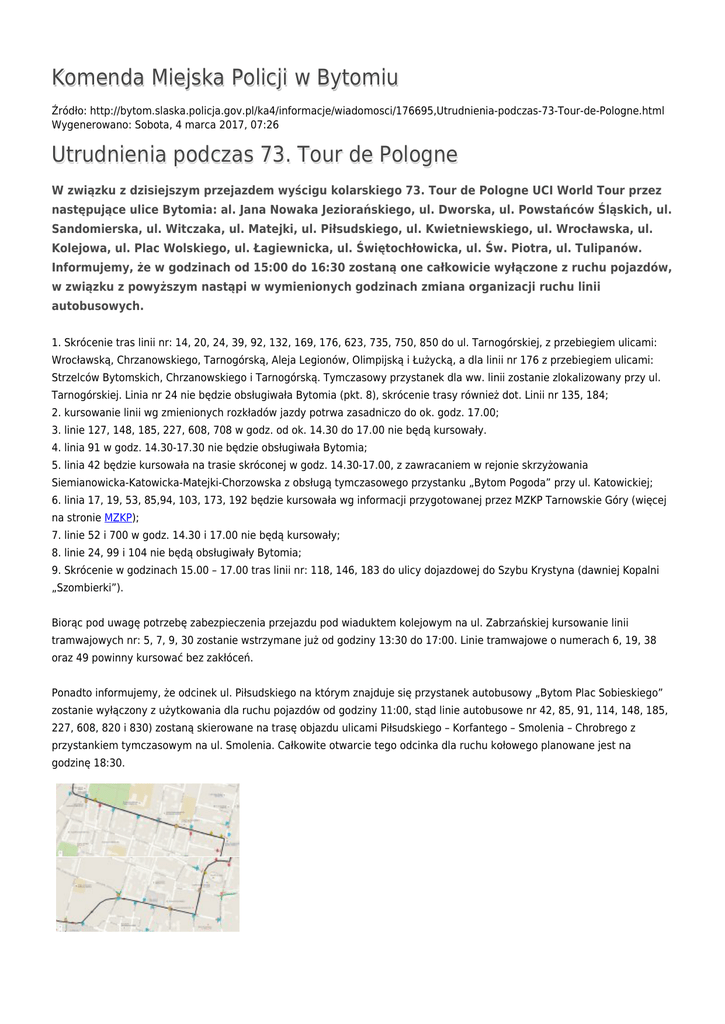 Komenda Miejska Policji w Bytomiu Źródło: http://bytom.slaska.policja.gov.pl/ka4/informacje/wiadomosci/176695,Utrudnienia-podczas-73-Tour-de-Pologne.html Wygenerowano: Sobota, 4 marca 2017, 07:26 Utrudnienia podczas 73. Tour de Pologne W związku z dzisiejszym przejazdem wyścigu kolarskiego 73. Tour de Pologne UCI World Tour przez następujące ulice Bytomia: al. Jana Nowaka Jeziorańskiego, ul. Dworska, ul. Powstańców Śląskich, ul. Sandomierska, ul. Witczaka, ul. Matejki, ul. Piłsudskiego, ul. Kwietniewskiego, ul. Wrocławska, ul. Kolejowa, ul. Plac Wolskiego, ul. Łagiewnicka, ul. Świętochłowicka, ul. Św. Piotra, ul. Tulipanów. Informujemy, że w godzinach od 15:00 do 16:30 zostaną one całkowicie wyłączone z ruchu pojazdów, w związku z powyższym nastąpi w wymienionych godzinach zmiana organizacji ruchu linii autobusowych. 1. Skrócenie tras linii nr: 14, 20, 24, 39, 92, 132, 169, 176, 623, 735, 750, 850 do ul. Tarnogórskiej, z przebiegiem ulicami: Wrocławską, Chrzanowskiego, Tarnogórską, Aleja Legionów, Olimpijską i Łużycką, a dla linii nr 176 z przebiegiem ulicami: Strzelców Bytomskich, Chrzanowskiego i Tarnogórską. Tymczasowy przystanek dla ww. linii zostanie zlokalizowany przy ul. Tarnogórskiej. Linia nr 24 nie będzie obsługiwała Bytomia (pkt. 8), skrócenie trasy również dot. Linii nr 135, 184; 2. kursowanie linii wg zmienionych rozkładów jazdy potrwa zasadniczo do ok. godz. 17.00; 3. linie 127, 148, 185, 227, 608, 708 w godz. od ok. 14.30 do 17.00 nie będą kursowały. 4. linia 91 w godz. 14.30-17.30 nie będzie obsługiwała Bytomia; 5. linia 42 będzie kursowała na trasie skróconej w godz. 14.30-17.00, z zawracaniem w rejonie skrzyżowania Siemianowicka-Katowicka-Matejki-Chorzowska z obsługą tymczasowego przystanku „Bytom Pogoda” przy ul. Katowickiej; 6. linia 17, 19, 53, 85,94, 103, 173, 192 będzie kursowała wg informacji przygotowanej przez MZKP Tarnowskie Góry (więcej na stronie MZKP); 7. linie 52 i 700 w godz. 14.30 i 17.00 nie będą kursowały; 8. linie 24, 99 i 104 nie będą obsługiwały Bytomia; 9. Skrócenie w godzinach 15.00 – 17.00 tras linii nr: 118, 146, 183 do ulicy dojazdowej do Szybu Krystyna (dawniej Kopalni „Szombierki”). Biorąc pod uwagę potrzebę zabezpieczenia przejazdu pod wiaduktem kolejowym na ul. Zabrzańskiej kursowanie linii tramwajowych nr: 5, 7, 9, 30 zostanie wstrzymane już od godziny 13:30 do 17:00. Linie tramwajowe o numerach 6, 19, 38 oraz 49 powinny kursować bez zakłóceń. Ponadto informujemy, że odcinek ul. Piłsudskiego na którym znajduje się przystanek autobusowy „Bytom Plac Sobieskiego” zostanie wyłączony z użytkowania dla ruchu pojazdów od godziny 11:00, stąd linie autobusowe nr 42, 85, 91, 114, 148, 185, 227, 608, 820 i 830) zostaną skierowane na trasę objazdu ulicami Piłsudskiego – Korfantego – Smolenia – Chrobrego z przystankiem tymczasowym na ul. Smolenia. Całkowite otwarcie tego odcinka dla ruchu kołowego planowane jest na godzinę 18:30. ZAŁĄCZNIKI DO STRONY Trasa wyścigu w Bytomiu 1.67 MB Ocena: 0/5 (0) Tweetnij