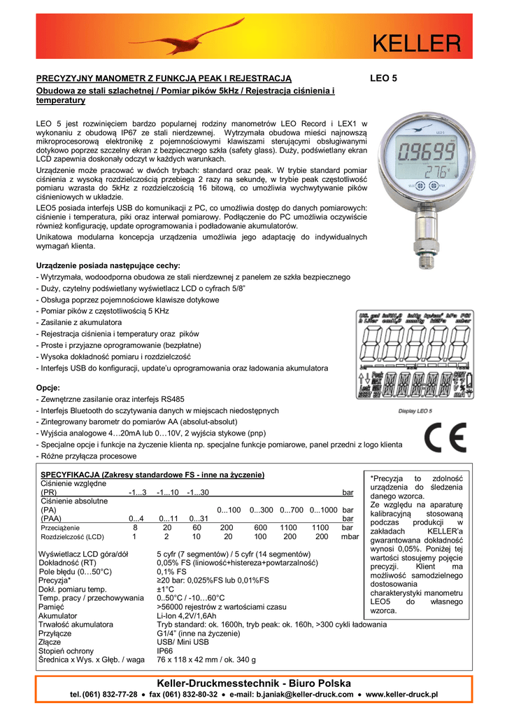 PRECYZYJNY MANOMETR Z FUNKCJĄ PEAK I REJESTRACJĄ Obudowa ze stali szlachetnej / Pomiar pików 5kHz / Rejestracja ciśnienia i temperatury LEO 5 LEO 5 jest rozwinięciem bardzo popularnej rodziny manometrów LEO Record i LEX1 w wykonaniu z obudową IP67 ze stali nierdzewnej. Wytrzymała obudowa mieści najnowszą mikroprocesorową elektronikę z pojemnościowymi klawiszami sterującymi obsługiwanymi dotykowo poprzez szczelny ekran z bezpiecznego szkła (safety glass). Duży, podświetlany ekran LCD zapewnia doskonały odczyt w każdych warunkach. Urządzenie może pracować w dwóch trybach: standard oraz peak. W trybie standard pomiar ciśnienia z wysoką rozdzielczością przebiega 2 razy na sekundę, w trybie peak częstotliwość pomiaru wzrasta do 5kHz z rozdzielczością 16 bitową, co umożliwia wychwytywanie pików ciśnieniowych w układzie. LEO5 posiada interfejs USB do komunikacji z PC, co umożliwia dostęp do danych pomiarowych: ciśnienie i temperatura, piki oraz interwał pomiarowy. Podłączenie do PC umożliwia oczywiście również konfigurację, update oprogramowania i podładowanie akumulatorów. Unikatowa modularna koncepcja urządzenia umożliwia jego adaptację do indywidualnych wymagań klienta. Urządzenie posiada następujące cechy: - Wytrzymała, wodoodporna obudowa ze stali nierdzewnej z panelem ze szkła bezpiecznego - Duży, czytelny podświetlany wyświetlacz LCD o cyfrach 5/8” - Obsługa poprzez pojemnościowe klawisze dotykowe - Pomiar pików z częstotliwością 5 KHz - Zasilanie z akumulatora - Rejestracja ciśnienia i temperatury oraz pików - Proste i przyjazne oprogramowanie (bezpłatne) - Wysoka dokładność pomiaru i rozdzielczość - Interfejs USB do konfiguracji, update’u oprogramowania oraz ładowania akumulatora Opcje: - Zewnętrzne zasilanie oraz interfejs RS485 - Interfejs Bluetooth do sczytywania danych w miejscach niedostępnych - Zintegrowany barometr do pomiarów AA (absolut-absolut) - Wyjścia analogowe 4…20mA lub 0…10V, 2 wyjścia stykowe (pnp) - Specjalne opcje i funkcje na życzenie klienta np. specjalne funkcje pomiarowe, panel przedni z logo klienta - Różne przyłącza procesowe SPECYFIKACJA (Zakresy standardowe FS - inne na życzenie) Ciśnienie względne (PR) -1...3 -1...10 -1...30 bar Ciśnienie absolutne (PA) 0...100 0...300 0...700 0...1000 bar (PAA) 0...4 0...11 0...31 bar Przeciążenie 8 20 60 200 600 1100 1100 bar Rozdzielczość (LCD) 1 2 10 20 100 200 200 mbar Wyświetlacz LCD góra/dół Dokładność (RT) Pole błędu (0…50°C) Precyzja* Dokł. pomiaru temp. Temp. pracy / przechowywania Pamięć Akumulator Trwałość akumulatora Przyłącze Złącze Stopień ochrony Średnica x Wys. x Głęb. / waga *Precyzja to zdolność urządzenia do śledzenia danego wzorca. Ze względu na aparaturę kalibracyjną stosowaną podczas produkcji w zakładach KELLER’a gwarantowana dokładność wynosi 0,05%. Poniżej tej wartości stosujemy pojęcie precyzji. Klient ma możliwość samodzielnego dostosowania charakterystyki manometru LEO5 do własnego wzorca. 5 cyfr (7 segmentów) / 5 cyfr (14 segmentów) 0,05% FS (liniowość+histereza+powtarzalność) 0,1% FS ≥20 bar: 0,025%FS lub 0,01%FS ±1°C 0..50°C / -10…60°C >56000 rejestrów z wartościami czasu Li-Ion 4,2V/1,6Ah Tryb standard: ok. 1600h, tryb peak: ok. 160h, >300 cykli ładowania G1/4” (inne na życzenie) USB/ Mini USB IP66 76 x 118 x 42 mm / ok. 340 g Keller-Druckmesstechnik - Biuro Polska tel. (061) 832-77-28 fax (061) 832-80-32 e-mail: [email protected] www.keller-druck.pl