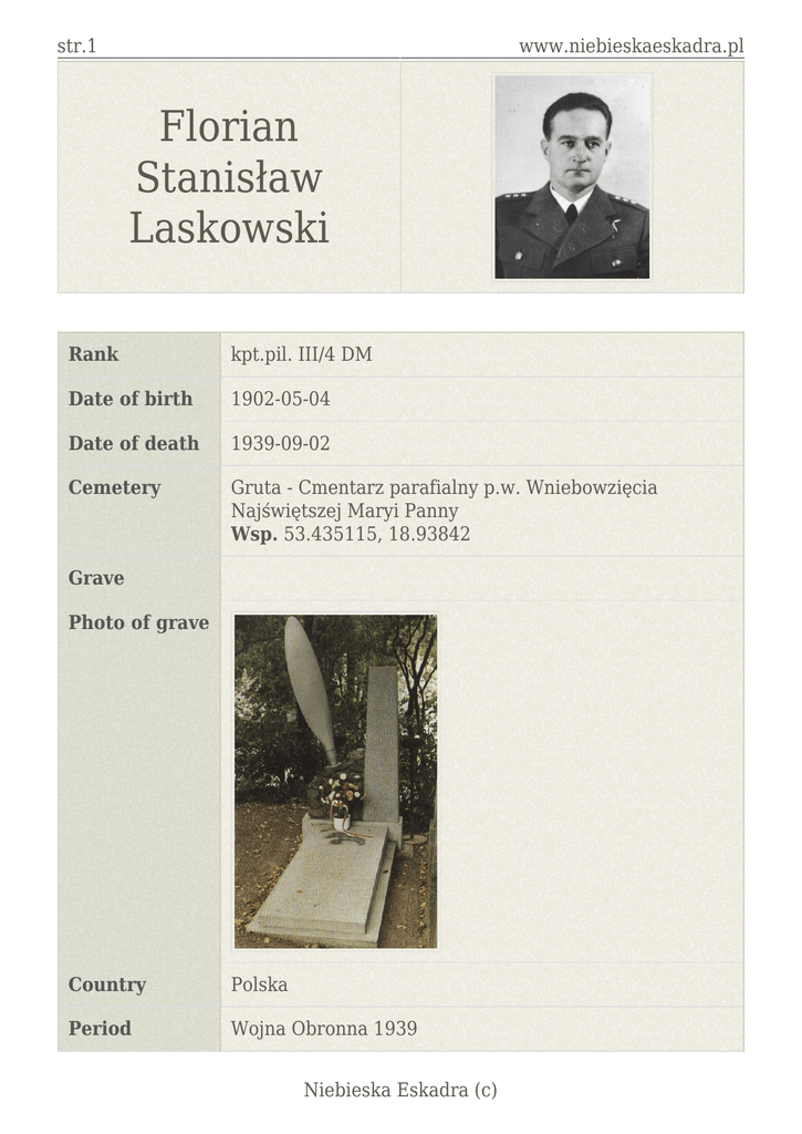 str.1 www.niebieskaeskadra.pl Florian Stanisław Laskowski Rank kpt.pil. III/4 DM Date of birth 1902-05-04 Date of death 1939-09-02 Cemetery Gruta - Cmentarz parafialny p.w. Wniebowzięcia Najświętszej Maryi Panny Wsp. 53.435115, 18.93842 Grave Photo of grave Country Polska Period Wojna Obronna 1939 Niebieska Eskadra (c) str.2 www.niebieskaeskadra.pl Source "Księga lotników polskich..." O. Cumft, H.K. Kujawa "Polskie Eskadry..." J. Pawlak "Ku czci..." Zbiorowa Urodził się czwartego maja 1902 roku w Sieradzu (w rodzinie Lucjana Andrzeja i Stefanii Laskowskich - W. Grudniak). W 1921 roku ukończył ośmioklasową Wyższą Szkołę Realną w Łodzi egzaminem dojrzałości. Edukacje przerwał na pewien czas 1918 roku ochotniczo zaciągając się do wojska. Został przydzielony do 4 Pułku Piechoty Legionów. W grudniu 1918 roku wraz z jednostką udał się na front. Brał udział w wojnie w roku 1920 w składzie 1 Pułku Ułanów Krechowieckich , za co został odznaczony. W grudniu 1920 roku został zdemobilizowany. Skończył Szkołę i rozpoczął naukę w na Wydziale Rolnym Uniwersytetu Poznańskiego. W marcu 1925 roku ukończył Cywilną Szkołę Pilotów w Poznaniu. 19 lipca 1926 rozpoczął naukę w Szkole Podchorążych Rezerwy Lotnictwa w Poznaniu. Ukończył ją 29 kwietnia 1927 roku. 17 maja 1927 roku skierowano go do Szkoły Pilotów w Bydgoszczy, na miesięczny kurs. 15 lipca tegoż roku został pilotem 2 Pułku Lotniczego, przydzielonym do eskadry treningowej.16 sierpnia przesunięto go do 21 Eskadry. 17 września zmienił pułk przenosząc się do 3 Pułku Lotniczego w Poznaniu. Dziesięć dni później trafił do 33 Eskadry. Pierwszego października rozpoczął naukę w Szkole Podchorążych Lotnictwa w Dęblinie. Po jej ukończeniu 16 sierpnia 1929 udał się na lotnisko Skniłów do 61 Eskadry 6 Pułku Lotniczego. 23 grudnia został przeniesiony do 2 Pułku Lotniczego. 18 stycznia został pilotem 122 Eskadry Myśliwskiej. 21 kwietnia 1931 roku zawarł związek małżeński z Ireną Godlewską. Pomiędzy siódmym kwietnia a 30 września przebywał w Lotniczej Szkole Strzelania i Bombardowania w Grudziądzu. Na początku września 1934 roku oddelegowany do 5 Pułku Lotniczego w charakterze instruktora ślepego pilotażu. Siódmego stycznia 1935 powrócił do 122 Eskadry Myśliwskiej obejmując jednocześnie stanowisko oficera taktycznego dywizjonu. Szóstego października 1936 roku został dowódcą 121 Eskadry Myśliwskiej. Pierwszego kwietnia 1937 roku awansował do stopnia kapitana. 24 września 1938 roku ukończył Wyższą Szkołę Lotniczą, po 10 miesięcznym kursie. Czwartego listopada objął dowództwo dywizjonu myśliwskiego w 4 Pułku Lotniczym w Toruniu. Jako dowódca dyonu III/4 wziął udział w Kampanii Wrześniowej. Drugiego września 1939 roku wystartował na czele dziewięciu samolotów P11c 141 eskadry myśliwskiej w celu zaatakowania niemieckiej kolumny pancernej w rejonie Gruta-Łasin. Podczas ataku został zestrzelony przez niemiecką artylerią przeciwlotniczą. Zginął rozbijając się w swoim samolocie P11c "55" w miejscowości Gruta. Rozkazem Naczelnego Wodza ZSP na Zachodzie pośmiertnie odznaczony został Krzyżem Walecznych (Dz.U.R.P. nr 5/47) Zdjęcia: Maciej Kurkiewicz, Piotr Matwiej Niebieska Eskadra (c)