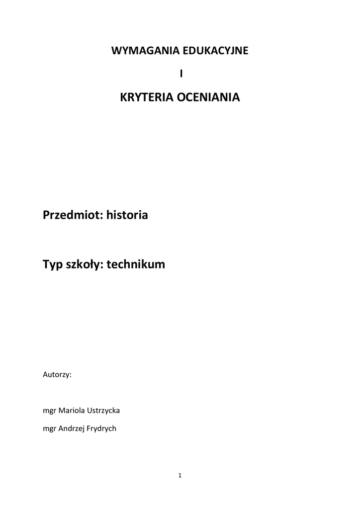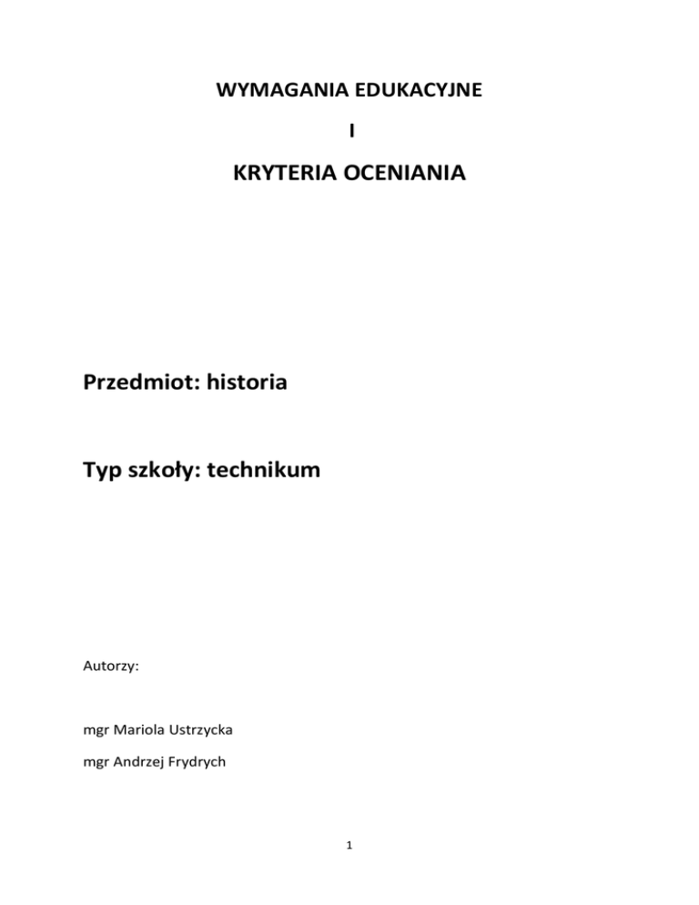 WYMAGANIA EDUKACYJNE I KRYTERIA OCENIANIA Przedmiot: historia Typ szkoły: technikum Autorzy: mgr Mariola Ustrzycka mgr Andrzej Frydrych 1 Wiadomości i umiejętności uczniów na poziomie podstawowym i ponadpodstawowym Lp. Wykaz czynności opanowanych przez uczniów 1. 2. 3. 4. 5. 6. 7. 8. 9. 10. 11. 12. 13. 14. 15. 16. 17. potrafi prawidłowo dobrać materiał faktograficzny potrafi umieszczać wydarzenia i zjawiska historyczne w czasie i przestrzeni potrafi dostrzec związki przyczynowo – skutkowe wydarzeń historycznych potrafi dokonywać analizy tekstu źródłowego potrafi odróżniać fakty historyczne od opinii i komentarzy potrafi sprawnie posługiwać się mapą historyczną potrafi samodzielnie pracować z podręcznikiem potrafi korzystać ze słowników historycznych potrafi udzielać krótkich wypowiedzi na temat czytanego tekstu potrafi płynnie i swobodnie wypowiadać się potrafi przedstawić na forum klasy efekty swojej samodzielnej pracy w formie ustnej lub referatu potrafi uczestniczyć w dyskusji i stara się prezentować własne zdanie samodzielnie wzbogaca swoją wiedzę poprzez czytanie książek i artykułów o tematyce historycznej potrafi dokonywać analizy i syntezy wydarzeń historycznych potrafi wysuwać samodzielne wnioski i dokonywać oceny zjawisk, faktów i postaci uczestniczy w konkursach historycznych potrafi posługiwać się następującymi terminami i pojęciami historycznymi: „czarny czwartek”, interwencjonizm państwowy, Nowy Ład, kubizm, Czeka, Gułag, Republika Weimarska, bojówki, „czarne koszule”, SS, obozy koncentracyjne, czystki, gestapo, III Rzesza, układ monachijski, Legiony Polskie, Komitet Narodowy Polski, Rada Regencyjna, „mała konstytucja”, powstanie wielkopolskie, plebiscyt, powstania śląskie, Zaolzie, bitwa warszawska, sanacja, „nowela sierpniowa”, tajny protokół, Blitzkrieg, rząd emigracyjny. Pearl Harbor, bitwa pod Stalingradem, kolaboracja, ruch oporu, partyzantka, powstanie warszawskie, 2 PW P P P P PP P P P P P P PP PP PP PP PP P 18. 19. 20. 21. 22. 23. 24. 25. 26. 27. zbrodnie wojenne, holocaust, obozy zagłady, getta, powstanie w getcie warszawskim, bomba atomowa, Ziemie Zachodnie, Deklaracja praw człowieka, wojna koreańska, kryzys berliński, kryzys kubański, OWP, rewolucja kulturalna, żelazna kurtyna, Układ Warszawski, RWPG, praska wiosna, plan Marshalla, traktaty rzymskie, traktat z Maastricht, , aksamitna rewolucja, deportacje, eksterminacja, NKWD, zbrodnia katyńska, wysiedlenia, pacyfikacje, Armia Krajowa, sabotaż, dywersja, Dywizjon 303, Polska Partia Robotnicza, kolektywizacja, nacjonalizacja, akcja „Wisła”, bezpieka, PZPR, poznański czerwiec, październik 1956, marzec 1968, grudzień 1970, KOR, drugi obieg, sierpień 1980, stan wojenny, okrągły stół, Sobór Watykański II. zna następujące postacie historyczne i rozumie ich rolę w dziejach Polski, Europy i świata: Franklin Delano Roosevelt, Pablo Picasso, Charlie Chaplin, Albert Einstein, Feliks Dzierżyński, David Lloyd George, Georges Clemenceau, Benito Mussolini, Józef Stalin, Adolf Hitler, Ignacy Jan Paderewski, Gabriel Narutowicz, Wincenty Witos, Ignacy Mościki, Edward Rydz – Śmigły, Józef Beck, Stefan Starzyński, Władysław Sikorki. Winston Churchill, Charles de Gaulle, John F. Kennedy, Nikita Chruszczow, Fidel Castro, Leonid Breżniew, Michaił Gorbaczow, Konrad Adenauer, Vaclav Havel, Stanisław Mikołajczyk, Bolesław Bierut, Władysław Gomułka, Edward Gierek, Wojciech Jaruzelski, Stefan Wyszyński, Jan XXIII, Jan Paweł II, Jerzy Popiełuszko, Lech Wałęsa, Tadeusz Mazowiecki, Jerzy Giedroyć. opisuje następstwa wojny, dzieli je na polityczne, gospodarcze, społeczne i kulturowe wyjaśnia cele powołania i charakter Ligi Narodów tłumaczy politykę mocarstw wobec Niemiec po zakończeniu I wojny światowej opisuje odrodzenie państwa polskiego, jego granice i sąsiadów przedstawia i ocenia postanowienia traktatu wersalskiego dotyczące Polski porównuje cele i skutki powstania wielkopolskiego oraz trzech powstań śląskich, wyjaśnia przyczyny i opisuje następstwa wojny polsko-bolszewickiej charakteryzuje ustrój polityczny II Rzeczypospolitej na podstawie konstytucji marcowej wskazuje czynniki utrudniające proces integracji odrodzonego państwa polskiego wyjaśnia cele i skutki reformy W. Grabskiego 3 P PP P P P P PP P P P 28. ocenia wkład J. Piłsudskiego i R. Dmowskiego w odbudowę państwa polskiego. 29. przedstawia okoliczności oraz następstwa dojścia do władzy B. Mussoliniego i A. Hitlera 30. porównuje faszyzm z nazizmem, uwzględniając kwestie organizacji państwa, ideologii oraz polityki wobec społeczeństwa 31. omawia i ocenia politykę państw europejskich wobec Hitlera, wskazuje jej uwarunkowania 32. opisuje okoliczności dojścia do władzy J. Stalina 33. opisuje zmiany polityczne, społeczne i gospodarcze w ZSRR po dojściu do władzy Stalina, z uwzględnieniem uprzemysłowienia kraju, kolektywizacji rolnictwa wraz z jej następstwami (wielki głód) i wielkiej czystki 34. porównuje totalitarne systemy hitlerowskich Niemiec i stalinowskiego Związku Radzieckiego 35. dokonuje oceny ideologii totalitarnych i działań państw totalitarnych i wskazać zagrożenia, jakie stanowiły one w przeszłości i obecnie 36. wyjaśnia przyczyny i skutki przewrotu majowego 37. porównuje główne postanowienia konstytucji marcowej z 1921 r. i konstytucji kwietniowej z 1935 r. 38. wymienia charakterystyczne cechy rządów sanacji, wskazuje różnice między demokracją parlamentarną a rządami autorytarnymi PP 39. potrafi wyjaśnić proces ewolucji ustroju II Rzeczypospolitej i scharakteryzować funkcjonowanie polskiego parlamentaryzmu 40. przedstawia strukturę społeczną, narodowościową i wyznaniową odrodzonego państwa polskiego, dostrzega przyczyny konfliktów społecznych i narodowościowych 41. porównuje przejawy kryzysu gospodarczego na świecie i w Polsce, wskazuje jego specyfi