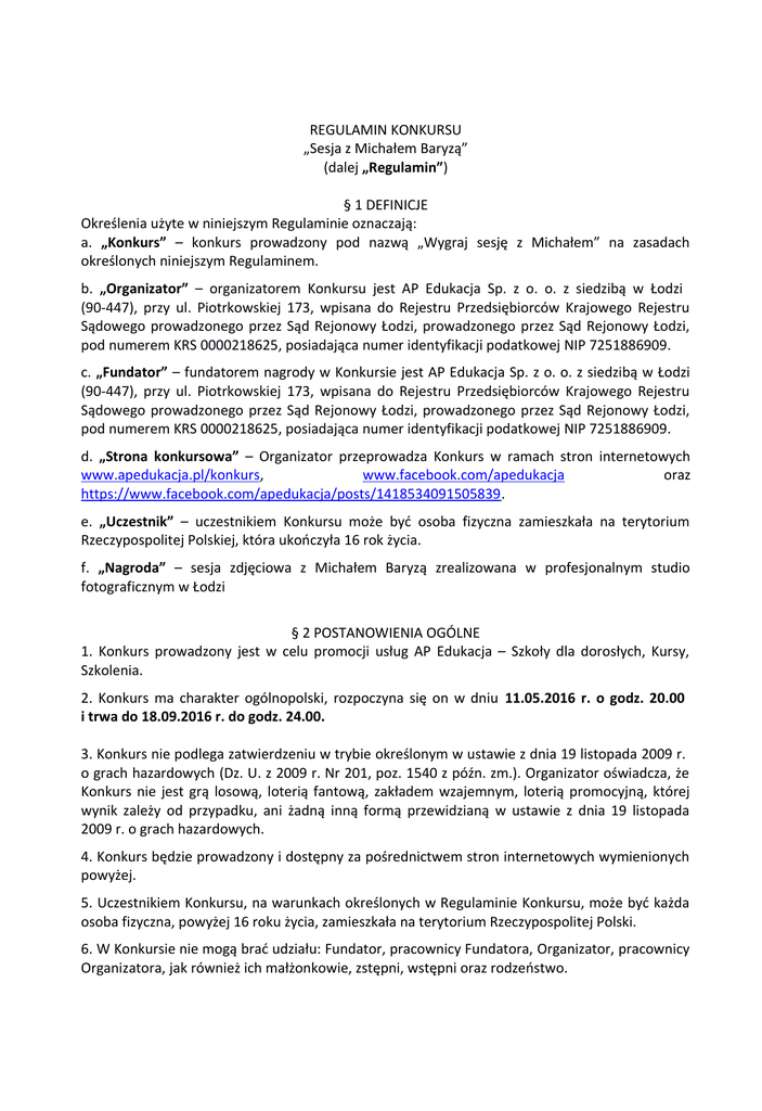 REGULAMIN KONKURSU „Sesja z Michałem Baryzą” (dalej „Regulamin”) § 1 DEFINICJE Określenia użyte w niniejszym Regulaminie oznaczają: a. „Konkurs” – konkurs prowadzony pod nazwą „Wygraj sesję z Michałem” na zasadach określonych niniejszym Regulaminem. b. „Organizator” – organizatorem Konkursu jest AP Edukacja Sp. z o. o. z siedzibą w Łodzi (90-447), przy ul. Piotrkowskiej 173, wpisana do Rejestru Przedsiębiorców Krajowego Rejestru Sądowego prowadzonego przez Sąd Rejonowy Łodzi, prowadzonego przez Sąd Rejonowy Łodzi, pod numerem KRS 0000218625, posiadająca numer identyfikacji podatkowej NIP 7251886909. c. „Fundator” – fundatorem nagrody w Konkursie jest AP Edukacja Sp. z o. o. z siedzibą w Łodzi (90-447), przy ul. Piotrkowskiej 173, wpisana do Rejestru Przedsiębiorców Krajowego Rejestru Sądowego prowadzonego przez Sąd Rejonowy Łodzi, prowadzonego przez Sąd Rejonowy Łodzi, pod numerem KRS 0000218625, posiadająca numer identyfikacji podatkowej NIP 7251886909. d. „Strona konkursowa” – Organizator przeprowadza Konkurs w ramach stron internetowych www.apedukacja.pl/konkurs, www.facebook.com/apedukacja oraz https://www.facebook.com/apedukacja/posts/1418534091505839. e. „Uczestnik” – uczestnikiem Konkursu może być osoba fizyczna zamieszkała na terytorium Rzeczypospolitej Polskiej, która ukończyła 16 rok życia. f. „Nagroda” – sesja zdjęciowa z Michałem Baryzą zrealizowana w profesjonalnym studio fotograficznym w Łodzi § 2 POSTANOWIENIA OGÓLNE 1. Konkurs prowadzony jest w celu promocji usług AP Edukacja – Szkoły dla dorosłych, Kursy, Szkolenia. 2. Konkurs ma charakter ogólnopolski, rozpoczyna się on w dniu 11.05.2016 r. o godz. 20.00 i trwa do 18.09.2016 r. do godz. 24.00. 3. Konkurs nie podlega zatwierdzeniu w trybie określonym w ustawie z dnia 19 listopada 2009 r. o grach hazardowych (Dz. U. z 2009 r. Nr 201, poz. 1540 z późn. zm.). Organizator oświadcza, że Konkurs nie jest grą losową, loterią fantową, zakładem wzajemnym, loterią promocyjną, której wynik zależy od przypadku, ani żadną inną formą przewidzianą w ustawie z dnia 19 listopada 2009 r. o grach hazardowych. 4. Konkurs będzie prowadzony i dostępny za pośrednictwem stron internetowych wymienionych powyżej. 5. Uczestnikiem Konkursu, na warunkach określonych w Regulaminie Konkursu, może być każda osoba fizyczna, powyżej 16 roku życia, zamieszkała na terytorium Rzeczypospolitej Polski. 6. W Konkursie nie mogą brać udziału: Fundator, pracownicy Fundatora, Organizator, pracownicy Organizatora, jak również ich małżonkowie, zstępni, wstępni oraz rodzeństwo. 7. W trakcie trwania Konkursu Organizator może przesyłać Uczestnikom, za pomocą środków komunikacji elektronicznej, wiadomości związane z przebiegiem Konkursu. 8. Uczestnictwo w Konkursie jest dobrowolne. 9. Uczestnik może wziąć udział w Konkursie jeden raz. § 3 ZASADY PROWADZENIA KONKURSU 1. Aby wziąć udział w Konkursie należy spełnić łącznie następujące warunki: a. Zapoznać się z treścią Regulaminu Konkursu zamieszczonego w www.apedukacja.pl/konkurs, wyrazić zgodę na postanowienia Regulaminu w formie kliknięcia pola „Zapoznałem się i akceptuję regulamin Konkursu”, „Wyrażam zgodę na przetwarzanie przesłanych przeze mnie danych osobowych przez AP Edukacja na potrzeby realizacji Konkursu, zgodnie z ustawą z dnia 29 sierpnia 1997 r. ochronie danych osobowych.” oraz „Wyrażam zgodę na otrzymywanie informacji handlowych od AP Edukacja za pomocą środków komunikacji elektronicznej, zgodnie z ustawą z dnia 18 lipca 2002 r. o świadczeniu usług drogą elektroniczną (Dz. U. z 2002 r. Nr 144, poz. 1204 z późn. zm.)” b. Oznaczyć się w poście promocyjnym umieszczonym na oficjalnej stronie AP Edukacja na portalu Facebook. c. Wypełnić i formularz zgłoszeniowy na stronie www.apedukacja.pl/konkurs. 2. Spełnienie warunków określonych w ustępie 1 pkt a-c niniejszego paragrafu stanowi zgłoszenie (zwane dalej „Zgłoszeniem Konkursowym”). 3. Wszystkie zgłoszenia Uczestników Konkursu będą zapisywane w bazie danych Organizatora. 4. Zgłoszenia Konkursowe niespełniające wymogów określonych w § 3 ust. 1 lub § 3 ust. 5 nie będą przyjmowane. 5. Organizator wraz z Modelem wybiorą zwycięzcę konkursu. Termin ogłoszenia wyniku to 25.09.2016r. 6. Uczestnicy Konkursu są zobowiązani do przestrzegania niniejszego Regulaminu. Nieprzestrzeganie Regulaminu może skutkować wykluczeniem Uczestnika z udziału w Konkursie. 7. Uczestnik wysyłając zgłoszenie konkursowe jednocześnie udziela niewyłącznej, nieodpłatnej licencji na przetwarzanie lub wykorzystanie zdjęć będących wynikiem sesji fotograficznej przez AP Edukacja Sp. z o. o. z siedzibą w Łodzi (90-447), przy ul. Piotrkowskiej 173, w szczególności dodanie logo Fundatora, publikację w Internecie, wykorzystanie w działaniach promocyjnych dotyczących Konkursu, jak również w celu przeprowadzenia i rozstrzygnięcia Konkursu. § 4 PRAWA AUTORSKIE Uczestnik zwolni Organizatora i Fundatora od wszelkich roszczeń osób trzecich wynikających z faktu, że autorskie prawa majątkowe i osobiste do nagrodzonego Portretu przenoszone, na Organizatora i Fundatora na podstawie postanowień Regulaminu, nie przysługiwały Uczestnikowi w dacie wydania nagrody. § 5 NAGRODY W KONKURSIE I SPOSÓB ICH PRZYZNANIA 1. W ramach Konkursu przewidziana jest następująca nagroda: Powołana przez Organizatora Komisja Konkursowa składająca się z przedstawiciela Organizatora/ Fundatora oraz Michała Baryzy (zwana dalej „Komisją Konkursową”), spośród Uczestników wybierze 1 osobę, która jest słuchaczem AP Edukacja (zwaną dalej „Zwycięzcą”). Zwycięzca otrzyma Nagrodę w postaci uczestnictwa w profesjonalnej sesji fotograficznej z udziałem Michała Baryzy. 2. Do zadań Komisji Konkursowej należy wybór Zwycięzcy Konkursu, jak również stwierdz