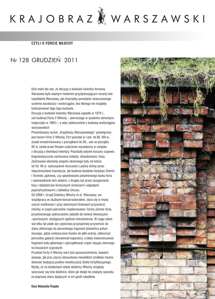 CZYLI O FORCIE WŁOCHY Nr 128 GRUDZIE¡ 2011 Dziś mało kto wie, że decyzja o budowie twierdzy fortowej Warszawa była ważnym motorem przyśpieszającym rozwój metropolitalnej Warszawy, jak chociażby powstanie nowoczesnego systemu kanalizacji i wodociągów, bez którego nie mogłaby funkcjonować tego typu budowla. Decyzja o budowie twierdzy Warszawa zapadła w 1879 r., zaś budowę Fortu V Włochy – pierwszego w systemie obronnym, rozpoczęto w 1883 r., a więc jednocześnie z budową wodociągów warszawskich. Prezentowany numer „Krajobrazu Warszawskiego” poświęcony jest losom Fortu V Włochy. Fort powstał w I poł. lat 80. XIX w., został zmodernizowany z początkiem lat 90., zaś na początku XX w. został przez Rosjan częściowo wysadzony w związku z decyzją o likwidacji twierdzy. Pozostały jedynie koszary szyjowe, fragmentarycznie zachowany tradytor, obwałowania i fosa. Zachowane elementy zespołu obronnego były od końca lat 50. XX w. sukcesywnie niszczone z jednej strony przez nieprzemyślane inwestycje, jak budowa baraków Instytutu Chemii i Techniki Jądrowej, czy splantowanie południowego barku fortu i wprowadzenie tam stolarni; z drugiej zaś przez zasypywanie fosy i dziedzińców fortecznych śmieciami i odpadami poprzemysłowymi z zakładów Ursusa. Od 2008 r. Urząd Dzielnicy Włochy m.st. Warszawy, we współpracy ze służbami konserwatorskimi, stara się w miarę swych możliwości i przy skromnych finansach przywrócić choćby w części pierwotne rozplanowanie i formy ziemne fortu, przystosowując jednocześnie zabytek do funkcji rekreacyjno-sportowych, dostępnych ogółowi mieszkańców. W ciągu zaledwie kilku lat udało się częściowo przynajmniej przywrócić do stanu zbliżonego do pierwotnego fragment dziedzińca południowego, gdzie umieszczono boisko do piłki nożnej, odtworzyć pierwotny gabaryt obwałowań kaponiery, a także zrekonstruować fragment wału głównego i uporządkować część nasypu ziemnego na koszarach szyjowych. Przykład Fortu V Włochy wart jest upowszechnienia, bowiem ukazuje, jak przy użyciu stosunkowo niewielkich środków można dokonać budzącej podziw rewaloryzacji dzieła fortyfikacyjnego. Myślę, że na działaniach władz dzielnicy Włochy mogłyby wzorować się inne dzielnice, które jak dotąd nie znalazły sposobu na poprawę stanu będących w ich gestii zabytków. Ewa Nekanda-Trepka FORT V WŁOCHY 2 FORT V WŁOCHY Fort Włochy, inaczej Fort V, zbudowano w ramach pierwszego etapu budowy systemu umocnień pierścieniowych rosyjskiej dziewiętnastowiecznej Twierdzy Warszawa. Był to, trzymając się rosyjskiej nomenklatury, fort główny, ogniowy w zewnętrznym pierścieniu umocnień stałych, jeden z pierwszych umocnień stałych. Był podstawowym elementem obronnym płaskiego, pozbawionego naturalnych przeszkód zachodniego odcinka fortyfikacji, odcinka, z którego spodziewano się głównego uderzenia nieprzyjaciela. Został zbudowany według projektu wzorcowego, opracowanego w rosyjskim Głównym Zarządzie Inżynierii Sztabu Generalnego w 1879 roku Pierwotnie był dwuwałowy z zewnętrznym wałem przeznaczonym dla piechoty, ponad głowami której z drugiego, wyższego, wału miała prowadzić ogień artyleria forteczna. Oba wały wyposażono w krótkie przedpiersia. Na wale artyleryjskim rozmieszczono trawersy w celu zmniejszania skutków ewentualnych wybuchów podczas bombardowania. Fosa była broniona przez kaponiery: czołową, barkowe i szyjową. Dzieła te były zbudowane z cegły. W szyi fortu umieszczono, podobnie jak i w innych tego rodzaju umocnieniach, ceglane koszary szyjowe. Prace przy budowie fortu (kopanie fos i sypanie wałów) rozpoczęto wiosną 1883 roku., a główne prace murowe ukończono w 1888. Cztery lata później okazało się, że fort nie odpowiada warunkom ówczesnego pola walki. Jest już przestarzały, bowiem na uzbrojenie weszła bardziej skuteczna artyleria, jak na przykład wielkokalibrowe armaty z zakładów Kruppa. [1] W ramach modernizacji, realizowanej od 1892 roku, pozostawiono pierwotny narys dzieła, jednak obniżono sylwetę fortu, 1. Fort V Włochy, widok aksonometryczny ostatniej fazy przekształceń, po 1892 r., rekonstrukcja Cezarego Głuszka, wg ilustracji zamieszczonej w karcie ewidencyjnej autorstwa Piotra Kordka, 2006 r. przebudowano system obronny – w miejsce dwu wałów usypano jeden wspólny dla artylerii i piechoty, z długim przedpiersiem, dającym większe pole ostrzału. Sklepienia ceglane umocnień murowanych – kaponier, schronów podwalni, pogotowia, potern – po zdjęciu nasypów ziemnych wzmocniono warstwą nowoczesnego w tamtych czasach materiału – betonu, po czym ponownie zasypano ziemią. Od strony zapola wzniesiono rawelin z betonowym tradytorem. Zapewne w tym samym czasie została zbudowana lodownia – magazyn do przechowywania szybko psujących się produktów żywnościowych na potrzeby załogi w czasie oblężenia.[2] 2. Ostatnia historyczna faza fortu, karta ewidencyjna, opr. P. Kordek, 2006 r., wg dr. C. Głuszka 3. Wnęki minerskie w czołowej ścianie koszar, fot. A. Oleksicki, marzec 2008 r. 4. Analogiczne wnęki na osi poprzecznej fortu od strony dziedzińca głównego, widok w trakcie prac ziemnych w rejonie zniszczonej poterny środkowej, fot. A. Oleksicki, czerwiec 2009 r. Po klęsce Rosji w wojnie z Japonią, wobec ogólnego kryzysu i coraz większych trudności w utrzymywaniu stałej załogi fortecznej (w samej Warszawie na przełomie XIX i XX w. stacjonowało ok. 100 000 żołnierzy), w 1909 roku dowództwo rosyjskie podjęło decyzję o likwidacji twierdzy i wysadzeniu znacznej części umocnień. W Forcie V wysadzono kaponierę główną na osi założenia obronnego, kaponiery czołową i boczne oraz szyjową. Zachowano zostały jedynie koszary szyjowe oraz tradytor i część umocnień ziemnych. Również koszary przygotowano do wysadzenia, o czym świadczą zachowane w ich ścianach do dziś nisze m