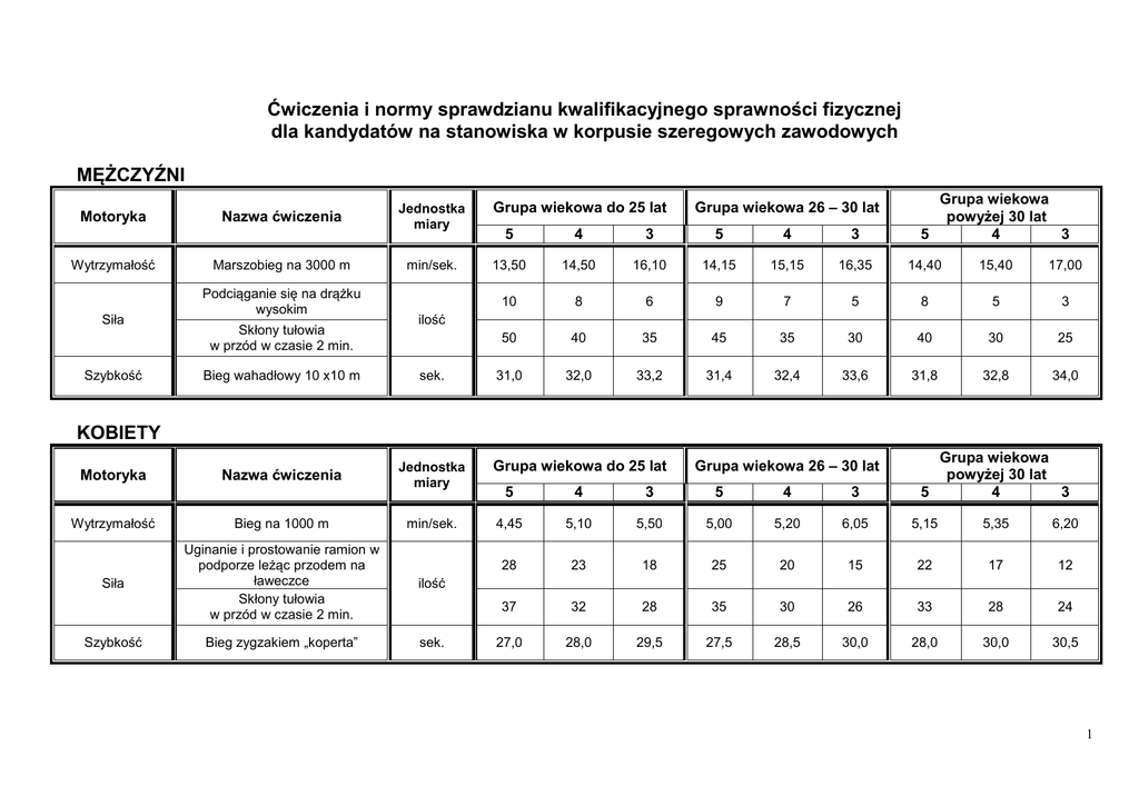 Ćwiczenia i normy sprawdzianu kwalifikacyjnego sprawności fizycznej dla kandydatów na stanowiska w korpusie szeregowych zawodowych MĘŻCZYŹNI Motoryka Wytrzymałość Siła Szybkość Nazwa ćwiczenia Marszobieg na 3000 m Podciąganie się na drążku wysokim Skłony tułowia w przód w czasie 2 min. Jednostka miary min/sek. Grupa wiekowa do 25 lat Grupa wiekowa 26 – 30 lat Grupa wiekowa powyżej 30 lat 5 4 3 5 4 3 5 4 3 13,50 14,50 16,10 14,15 15,15 16,35 14,40 15,40 17,00 10 8 6 9 7 5 8 5 3 50 40 35 45 35 30 40 30 25 31,0 32,0 33,2 31,4 32,4 33,6 31,8 32,8 34,0 ilość Bieg wahadłowy 10 x10 m sek. Nazwa ćwiczenia Jednostka miary KOBIETY Motoryka Wytrzymałość Bieg na 1000 m min/sek. Siła Uginanie i prostowanie ramion w podporze leżąc przodem na ławeczce Skłony tułowia w przód w czasie 2 min. ilość Bieg zygzakiem „koperta” sek. Szybkość Grupa wiekowa do 25 lat Grupa wiekowa 26 – 30 lat Grupa wiekowa powyżej 30 lat 5 4 3 5 4 3 5 4 3 4,45 5,10 5,50 5,00 5,20 6,05 5,15 5,35 6,20 28 23 18 25 20 15 22 17 12 37 32 28 35 30 26 33 28 24 27,0 28,0 29,5 27,5 28,5 30,0 28,0 30,0 30,5 1 2 Ćwiczenia i normy sprawdzianu kwalifikacyjnego sprawności fizycznej dla kandydatów na stanowiska w korpusie szeregowych zawodowych do jednostek desantowo – szturmowych, desantowych, rozpoznawczych i specjalnych - pododdziały bojowe MĘŻCZYŹNI Motoryka Wytrzymałość Siła Szybkość Nazwa ćwiczenia Marszobieg na 3000 m Podciąganie się na drążku wysokim Skłony tułowia w przód w czasie 2 min. Jednostka miary min/sek. Grupa wiekowa do 25 lat Grupa wiekowa 26 – 30 lat Grupa wiekowa powyżej 30 lat 5 4 3 5 4 3 5 4 3 12,15 13,15 14,30 12,30 13,30 14,45 13,00 14,00 15,10 14 12 10 12 10 8 11 9 7 70 65 60 65 60 55 60 55 50 29,2 30,2 31,2 29,5 30,5 31,5 29,8 30,8 31,8 ilość Bieg wahadłowy 10 x10 m sek. Nazwa ćwiczenia Jednostka miary KOBIETY Motoryka Wytrzymałość Bieg na 1000 m min/sek. Siła Uginanie i prostowanie ramion w podporze leżąc przodem na ławeczce Skłony tułowia w przód w czasie 2 min. ilość Bieg zygzakiem „koperta” sek. Szybkość Grupa wiekowa do 25 lat Grupa wiekowa 26 – 30 lat Grupa wiekowa powyżej 30 lat 5 4 3 5 4 3 5 4 3 4,15 4,45 5,30 4,30 5,00 5,45 4,45 5,15 6,00 33 28 23 30 25 20 27 22 17 42 37 32 40 35 30 38 33 28 26,0 27,0 28,5 26,5 27,5 30,0 27,0 28,0 29,5 2 Ćwiczenia i normy sprawdzianu kwalifikacyjnego sprawności fizycznej dla kandydatów na stanowiska w korpusie szeregowych zawodowych do jednostek desantowo – szturmowych, desantowych, rozpoznawczych i specjalnych - pododdziały zabezpieczenia MĘŻCZYŹNI Motoryka Wytrzymałość Siła Szybkość Nazwa ćwiczenia Marszobieg na 3000 m Podciąganie się na drążku wysokim Skłony tułowia w przód w czasie 2 min. Jednostka miary min/sek. Grupa wiekowa do 25 lat Grupa wiekowa 26 – 30 lat Grupa wiekowa powyżej 30 lat 5 4 3 5 4 3 5 4 3 12,30 13,30 14,40 12,45 13,45 14,55 13,00 14,00 15,10 13 11 9 11 9 7 10 8 6 65 60 55 60 55 50 55 50 45 29,8 30,8 31,8 30,1 31,1 32,1 30,4 31,4 32,4 ilość Bieg wahadłowy 10 x10 m sek. Nazwa ćwiczenia Jednostka miary KOBIETY Motoryka Wytrzymałość Bieg na 1000 m min/sek. Siła Uginanie i prostowanie ramion w podporze leżąc przodem na ławeczce Skłony tułowia w przód w czasie 2 min. ilość Bieg zygzakiem „koperta” sek. Szybkość Grupa wiekowa do 25 lat Grupa wiekowa 26 – 30 lat Grupa wiekowa powyżej 30 lat 5 4 3 5 4 3 5 4 3 4,15 4,45 5,30 4,30 5,00 5,45 4,45 5,15 6,00 33 28 23 30 25 20 27 22 17 42 37 32 40 35 30 38 33 28 26,0 27,0 28,5 26,5 27,5 30,0 27,0 28,0 29,5 3 Opis ćwiczeń: Mężczyźni: Marszobieg na 3000 m - odbywa się w stroju sportowym na bieżni lekkoatletycznej, drodze lub terenie o równej i twardej nawierzchni (o równej sumie spadków i wzniesień terenowych). Sposób prowadzenia: seriami (grupami) na czas, grupa powinna liczyć do 30 kandydatów. Na komendę „Start” lub sygnał grupa kandydatów rozpoczyna bieg. Czas mierzy się z dokładnością do 1 sekundy od sygnału startu do momentu przekroczenia linii mety. Podciąganie się na drążku wysokim - odbywa się w stroju sportowym. Minimalna wysokość drążka wysokiego do wykonania ćwiczenia – 220 cm. Na komendę „Gotów” kandydat wykonuje zwis nachwytem o ramionach wyprostowanych w stawach łokciowych - pozycja wyjściowa. Na komendę „Ćwicz!” podciąga się tak, aby broda znalazła się powyżej prężnika drążka wysokiego i wraca do pozycji wyjściowej, następnie ponawia ćwiczenie. Oceniający (kontrolujący) głośno podaje ilość wykonanych prawidłowo podciągnięć. Jeżeli kontrolowany nie wykona ćwiczenia zgodnie z opisem, np.: „nie podciągnie się do wymaganej pozycji lub nie wróci do zwisu o ramionach wyprostowanych w stawach łokciowych” oceniający (kontrolujący) powtarza ostatnią liczbę wykonanych prawidłowo podciągnięć. Skłony tułowia w przód w czasie 2 minut - odbywa się w stroju sportowym. Na komendę „Gotów” kandydat przyjmuje pozycję: leżąc tyłem z palcami rąk splecionymi i ułożonymi z tyłu na głowie, ramiona dotykają materaca, nogi ugięte w stawach kolanowych (maksymalnie do kąta prostego), stopy rozstawione na szerokość bioder, które mogą być przytrzymywane przez współćwiczącego lub zaczepione o dolny szczebel drabinki. Na komendę „Ćwicz!” wykonuje skłon tułowia w przód z jednoczesnym dotknięciem łokciami kolan i natychmiast powraca do leżenia, tak aby splecione place na głowie dotknęły podłoża (pierwsze powtórzenie). Oceniający (kontrolujący) głośno wymienia kolejno ilość prawidłowo wykonanych powtórzeń. Jeżeli kontrolowany nie wykona ćwiczenia zgodnie z opisem, np.: „nie dotknie łokciami kolan lub w pozycji wyjściowej do ponowienia ćwiczenia nie dotknie powierzchni materaca obiema łopatkami oraz splecionymi i ułożonymi z tyłu na głowie palcami rąk”, oceniający (kontrolujący) powtarza ostatnią liczbę wykonanych prawidłowo 