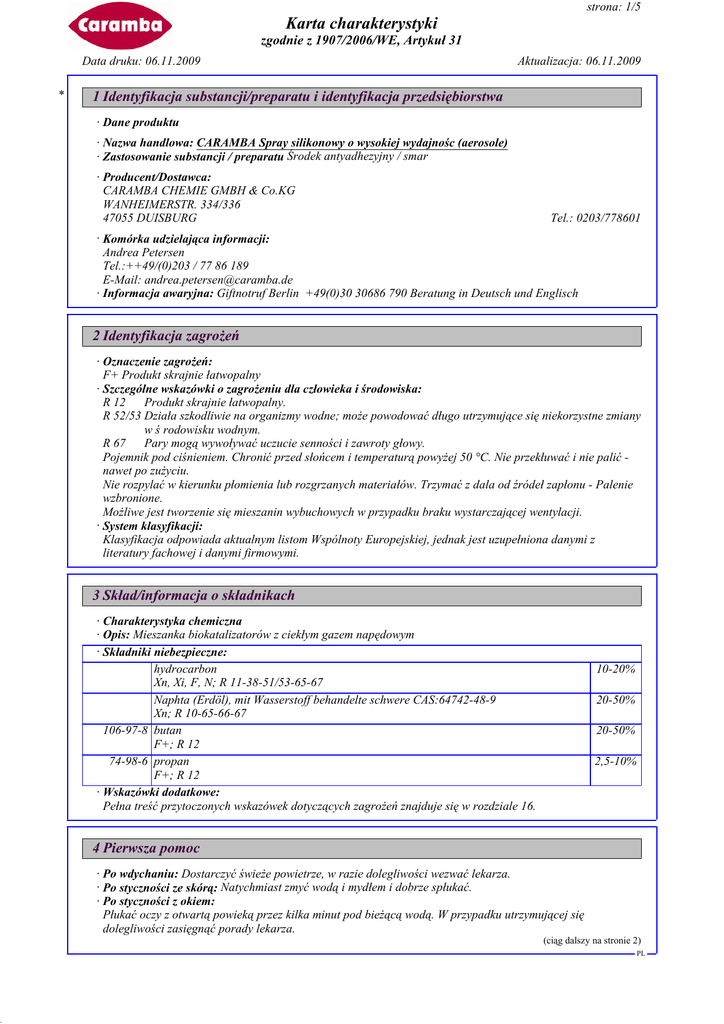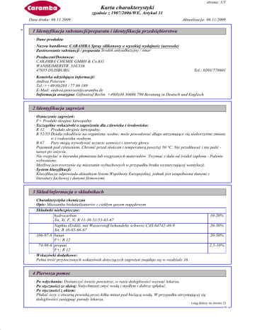 DR strona: 1/5 Karta charakterystyki zgodnie z 1907/2006/WE, Artykuł 31 Data druku: 06.11.2009 * Aktualizacja: 06.11.2009 1 Identyfikacja substancji/preparatu i identyfikacja przedsiębiorstwa · Dane produktu · Nazwa handlowa: CARAMBA Spray silikonowy o wysokiej wydajnośc (aerosole) · Zastosowanie substancji / preparatu Środek antyadhezyjny / smar · Producent/Dostawca: CARAMBA CHEMIE GMBH & Co.KG WANHEIMERSTR. 334/336 47055 DUISBURG Tel.: 0203/778601 · Komórka udzielająca informacji: Andrea Petersen Tel.:++49/(0)203 / 77 86 189 E-Mail: [email protected] · Informacja awaryjna: Giftnotruf Berlin +49(0)30 30686 790 Beratung in Deutsch und Englisch 2 Identyfikacja zagrożeń · Oznaczenie zagrożeń: F+ Produkt skrajnie łatwopalny · Szczególne wskazówki o zagrożeniu dla człowieka i środowiska: R 12 Produkt skrajnie łatwopalny. R 52/53 Działa szkodliwie na organizmy wodne; może powodować długo utrzymujące się niekorzystne zmiany w ś rodowisku wodnym. R 67 Pary mogą wywoływać uczucie senności i zawroty głowy. Pojemnik pod ciśnieniem. Chronić przed słońcem i temperaturą powyżej 50 °C. Nie przekłuwać i nie palić nawet po zużyciu. Nie rozpylać w kierunku płomienia lub rozgrzanych materiałów. Trzymać z dala od źródeł zapłonu - Palenie wzbronione. Możliwe jest tworzenie się mieszanin wybuchowych w przypadku braku wystarczającej wentylacji. · System klasyfikacji: Klasyfikacja odpowiada aktualnym listom Wspólnoty Europejskiej, jednak jest uzupełniona danymi z literatury fachowej i danymi firmowymi. 3 Skład/informacja o składnikach · Charakterystyka chemiczna · Opis: Mieszanka biokatalizatorów z ciekłym gazem napędowym · Składniki niebezpieczne: hydrocarbon Xn, Xi, F, N; R 11-38-51/53-65-67 Naphta (Erdöl), mit Wasserstoff behandelte schwere CAS:64742-48-9 Xn; R 10-65-66-67 106-97-8 butan F+; R 12 74-98-6 propan F+; R 12 · Wskazówki dodatkowe: Pełna treść przytoczonych wskazówek dotyczących zagrożeń znajduje się w rozdziale 16. 10-20% 20-50% 20-50% 2,5-10% 4 Pierwsza pomoc · Po wdychaniu: Dostarczyć świeże powietrze, w razie dolegliwości wezwać lekarza. · Po styczności ze skórą: Natychmiast zmyć wodą i mydłem i dobrze spłukać. · Po styczności z okiem: Płukać oczy z otwartą powieką przez kilka minut pod bieżącą wodą. W przypadku utrzymującej się dolegliwości zasięgnąć porady lekarza. (ciąg dalszy na stronie 2) PL DR strona: 2/5 Karta charakterystyki zgodnie z 1907/2006/WE, Artykuł 31 Data druku: 06.11.2009 Aktualizacja: 06.11.2009 Nazwa handlowa: CARAMBA Spray silikonowy o wysokiej wydajnośc (aerosole) (ciąg dalszy od strony 1) · Po przełknięciu: Nie powodować wymiotów i sprowadzić lekarza. 5 Postępowanie w przypadku pożaru · Przydatne środki gaśnicze: CO2, proszek gaśniczy lub strumień wody. Większy pożar zwalczać strumieniem wody lub pianą odporną na działanie alkoholu. · Środki gaśnicze nieprzydatne ze względów bezpieczeństwa: Woda pełnym strumieniem · Specjalne wyposażenie ochronne: Środki specjalne nie są konieczne. 6 Postępowanie w przypadku niezamierzonego uwolnienia do środowiska · Środki ostrożności dostosowane do danej osoby: Nosić ubranie ochronne. Osoby nie zabezpieczone przenieść w bezpieczne miejsce. · Środki ochrony środowiska: Zapobiec przeniknięcie do kanalizacji, rowów i piwnic. · Metoda oczyszczania/ wchłaniania: Zebrać za pomocą materiału wiążącego ciecze (piasek, ziemia okrzemkowa, materiał wiążący kwasy, materiał wiążący uniwersalny, trociny). Zadbać o wystarczające przewietrzenie. 7 Postępowanie z substancją/preparatem i jej/jego magazynowanie · Sposób obchodzenia się: · Wskazówki dla bezpiecznego użytkowania: Zbiorniki zamknąć szczelnie. Składować w dobrze zamkniętych beczkach chłodnych i suchych. · Wskazówki dla ochrony przeciwpożarowej i przeciwwybuchowej: Mieć w pogotowiu przyrządy do ochrony dróg oddechowych. · Składowanie: · Wymagania w stosunku do pomieszczeń składowych i zbiorników: Przechowywać tylko w ogrzewanych zbiornikach. · Wskazówki odnośnie wspólnego składowania: Nie konieczne. · Dalsze wskazówki odnośnie warunków składowania: Zbiornik trzymać szczelnie zamknięty. Składować w dobrze zamkniętych beczkach w chłodnym i suchym miejscu. 8 Kontrola narażenia i środki ochrony indywidualnej · Dodatkowe wskazówki dla wykonania urządzeń technicznych: Brak dalszych danych, patrz punkt 7. · Składniki wraz z kontrolowanymi wartościami granicznymi zależnymi od miejsca pracy: 106-97-8 butan NDS (PL) NDSCh: 3000 mg/m3 NDS: 1900 mg/m3 74-98-6 propan NDS (PL) 1800 mg/m3 · Wskazówki dodatkowe: Podstawą były aktualnie obowiązujące wykazy. · Osobiste wyposażenie ochronne: · Ogólne środki ochrony i higieny: Należy przestrzegać zwyczajne środki ostrożności przy obchodzeniu się z chemikaliami. · Ochrona dróg oddechowych: Tylko podczas pryskania bez wystarczającego odsysania. · Ochrona rąk: Rękawice / odporne na rozpuszczalniki · Materiał, z którego wykonane są rękawice Kauczuk nitrylowy (ciąg dalszy na stronie 3) PL DR strona: 3/5 Karta charakterystyki zgodnie z 1907/2006/WE, Artykuł 31 Data druku: 06.11.2009 Aktualizacja: 06.11.2009 Nazwa handlowa: CARAMBA Spray silikonowy o wysokiej wydajnośc (aerosole) (ciąg dalszy od strony 2) · Czas penetracji dla materiału, z którego wykonane są rękawice Wartość przenikania: poziom ≥ 480 · Ochrona oczu: Okulary ochronne zalecane podczas napełniania * 9 Właściwości fizyczne i chemiczne · Ogólne dane Forma: Kolor: Zapach: Aerozol Przeźroczysty Charakterystyczny · Zmiana stanu Punkt topnienia/ Zakres topnienia: Nie jest określony. 82°C Punkt wrzenia/ Zakres wrzenia: · Punkt zapłonu: Nie nadający się do zastosowania ze względu na aerozol. · Temperatura palenia się: 270°C · Samozapłon: Produkt nie jest samozapalny. · Niebezpieczeństwo wybuchu: Produkt nie jest grozi wy