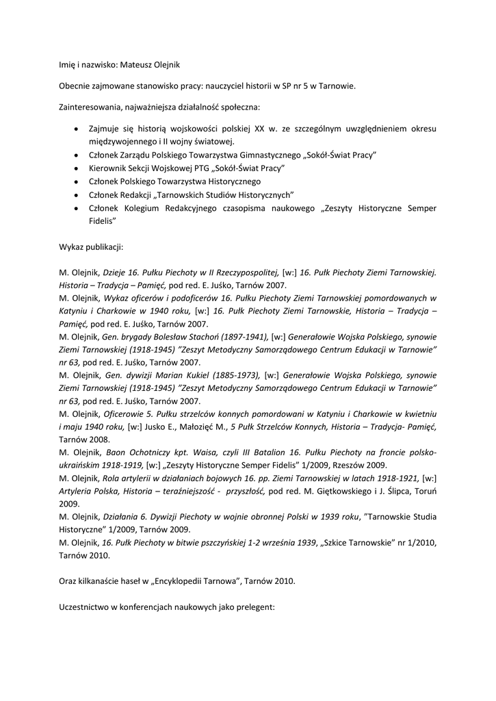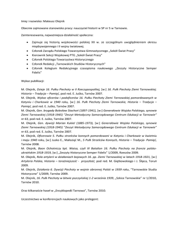 Imię i nazwisko: Mateusz Olejnik Obecnie zajmowane stanowisko pracy: nauczyciel historii w SP nr 5 w Tarnowie. Zainteresowania, najważniejsza działalność społeczna: Zajmuje się historią wojskowości polskiej XX w. ze szczególnym uwzględnieniem okresu międzywojennego i II wojny światowej. Członek Zarządu Polskiego Towarzystwa Gimnastycznego „Sokół-Świat Pracy” Kierownik Sekcji Wojskowej PTG „Sokół-Świat Pracy” Członek Polskiego Towarzystwa Historycznego Członek Redakcji „Tarnowskich Studiów Historycznych” Członek Kolegium Redakcyjnego czasopisma naukowego „Zeszyty Historyczne Semper Fidelis” Wykaz publikacji: M. Olejnik, Dzieje 16. Pułku Piechoty w II Rzeczypospolitej, [w:] 16. Pułk Piechoty Ziemi Tarnowskiej. Historia – Tradycja – Pamięd, pod red. E. Juśko, Tarnów 2007. M. Olejnik, Wykaz oficerów i podoficerów 16. Pułku Piechoty Ziemi Tarnowskiej pomordowanych w Katyniu i Charkowie w 1940 roku, [w:] 16. Pułk Piechoty Ziemi Tarnowskie, Historia – Tradycja – Pamięd, pod red. E. Juśko, Tarnów 2007. M. Olejnik, Gen. brygady Bolesław Stachoo (1897-1941), [w:] Generałowie Wojska Polskiego, synowie Ziemi Tarnowskiej (1918-1945) ”Zeszyt Metodyczny Samorządowego Centrum Edukacji w Tarnowie” nr 63, pod red. E. Juśko, Tarnów 2007. M. Olejnik, Gen. dywizji Marian Kukiel (1885-1973), [w:] Generałowie Wojska Polskiego, synowie Ziemi Tarnowskiej (1918-1945) ”Zeszyt Metodyczny Samorządowego Centrum Edukacji w Tarnowie” nr 63, pod red. E. Juśko, Tarnów 2007. M. Olejnik, Oficerowie 5. Pułku strzelców konnych pomordowani w Katyniu i Charkowie w kwietniu i maju 1940 roku, [w:] Jusko E., Małozięć M., 5 Pułk Strzelców Konnych, Historia – Tradycja- Pamięd, Tarnów 2008. M. Olejnik, Baon Ochotniczy kpt. Waisa, czyli III Batalion 16. Pułku Piechoty na froncie polskoukraioskim 1918-1919, [w:] „Zeszyty Historyczne Semper Fidelis” 1/2009, Rzeszów 2009. M. Olejnik, Rola artylerii w działaniach bojowych 16. pp. Ziemi Tarnowskiej w latach 1918-1921, [w:] Artyleria Polska, Historia – teraźniejszośd - przyszłośd, pod red. M. Giętkowskiego i J. Ślipca, Toruo 2009. M. Olejnik, Działania 6. Dywizji Piechoty w wojnie obronnej Polski w 1939 roku, ”Tarnowskie Studia Historyczne” 1/2009, Tarnów 2009. M. Olejnik, 16. Pułk Piechoty w bitwie pszczyoskiej 1-2 września 1939, „Szkice Tarnowskie” nr 1/2010, Tarnów 2010. Oraz kilkanaście haseł w „Encyklopedii Tarnowa”, Tarnów 2010. Uczestnictwo w konferencjach naukowych jako prelegent: XVII Ogólnopolski Zjazd Historyków Studentów (Olsztyn 14-18 IV 2009) − wygłoszony referat: Działania bojowe 16. Pułku Piechoty w latach 1918-1920. Artyleria Polska, Historia – teraźniejszość – przyszłość (myśl wojskowa, szkolnictwo artyleryjskie, technika i uzbrojenie), III konferencja naukowa, Toruń 11 V 2009 – wygłoszony referat: Rola artylerii w działaniach bojowych 16. pp. Ziemi Tarnowskiej w latach 1918-1921. Konferencja: „W drodze do prawdy o Katyniu” Kraków 27 V 2010 – wygłoszony referat: Kręte drogi do Katynia, biogramy katyńskie.