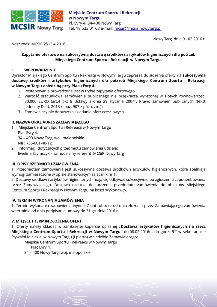 Miejskie Centrum Sportu i Rekreacji w Nowym Targu Pl. Evry 4, 34-400 Nowy Targ Tel. 18 533 01 63 e-mail: [email protected] Nowy Targ, dnia 01.02.2016 r. Nasz znak: MCSiR.2512.4.2016 Zapytanie ofertowe na sukcesywną dostawę środków i artykułów higienicznych dla potrzeb Miejskiego Centrum Sportu i Rekreacji w Nowym Targu. I. WPROWADZENIE Dyrektor Miejskiego Centrum Sportu i Rekreacji w Nowym Targu zaprasza do złożenia oferty na sukcesywną dostawę środków i artykułów higienicznych dla potrzeb Miejskiego Centrum Sportu i Rekreacji w Nowym Targu z siedzibą przy Placu Evry 4. 1. Postępowanie prowadzone jest w trybie zapytania ofertowego. 2. Wartość szacunkowa zamówienia publicznego nie przekracza wyrażonej w złotych równowartości 30.000 EURO (art.4 pkt 8 Ustawy z dnia 29 stycznia 2004r. Prawo zamówień publicznych (tekst jednolity Dz.U. 2013 r. poz. 907 z późn. zm.)) 3. Zamawiający nie dopuszcza składania ofert częściowych. II. NAZWA ORAZ ADRES ZAMAWIA JĄCEGO 1. Miejskie Centrum Sportu i Rekreacji w Nowym Targu Plac Evry 4, 34 – 400 Nowy Targ, woj. małopolskie NIP: 735-001-40-12 2. Informacji dotyczących przedmiotu zamówienia udziela: Ewelina Szymczyk – samodzielny referent MCSiR Nowy Targ III. OPIS PRZEDMIOTU ZAMÓWIENIA 1. Przedmiotem zamówienia jest sukcesywna dostawa środków i artykułów higienicznych, które spełniają wymogi zamieszczone w opisie stanowiącym załącznik nr 1. 2. Dostawy środków i artykułów higienicznych mają się odbywać sukcesywnie po zgłoszeniu zapotrzebowania przez Zamawiającego. Dostawa oznacza dostarczenie przedmiotu zamówienia do obiektów Miejskiego Centrum Sportu i Rekreacji w Nowym Targu na koszt Wykonawcy. IV. TERMIN WYKONANIA ZAMÓWIENIA 1. Termin wykonania zamówienia wynosi 7 dni robocze od dnia złożenia przez Zamawiającego zamówienia w terminie od dnia podpisania umowy do 31 grudnia 2016 r. V. MIEJSCE I TERMIN ZŁOŻENIA OFERT 1. Oferty należy składać w zamkniętej kopercie opisanej „Dostawa artykułów higienicznych na rzecz Miejskiego Centrum Sportu i Rekreacji w Nowym Targu” do 08.02.2016r., do godz. 930 w sekretariacie Pływalni Miejskiej w Nowym Targu (I piętro) w siedzibie Zamawiającego: Miejskie Centrum Sportu i Rekreacji w Nowym Targu Plac Evry 4, 34 – 400 Nowy Targ, woj. małopolskie Miejskie Centrum Sportu i Rekreacji w Nowym Targu Pl. Evry 4, 34-400 Nowy Targ Tel. 18 533 01 63 e-mail: [email protected] VI. OPIS SPOSOBU PRZYGOTOWANIA OFERTY 1. Ofertę należy sporządzić wg formularza ofertowego stanowiącego załącznik nr 2. 2. Oferta winna być sporządzona w języku polskim, czytelnie w jednym egzemplarzu. 3. Oferta winna być podpisana przez osobę upoważnioną do reprezentowania Wykonawcy. 4. Oferta winna zawierać wszystkie koszty i składniki, niezbędne do wykonania przedmiotu zamówienia. 5. Zamawiający zastrzega sobie prawo unieważnienia przetargu bez podania przyczyn. 6. Do oferty należy dołączyć karty charakterystyki oraz próbniki asortymentu oznaczonego symbolem *. 7. Cena musi obejmować w kalkulacji wszystkie koszty i składniki, niezbędne do wykonania przedmiotu zamówienia. Przy wyliczaniu wartości cen poszczególnych elementów należy ograniczyć się do dwóch miejsc po przecinku na każdym etapie wyliczenia ceny. Załącznik nr 2 FORMULARZ OFERTOWY Dane Wykonawcy .............................................................................................................................................................................................. ................................................................................................................ …………………………………………………………………………………………... ………………………………………………………………………………………………… ( pełna nazwa, adres firmy oraz imię i nazwisko właściciela) Strona internetowa: …………………………………….…………… Nr telefonu: …………………………………………………………. E-mail: ……….……………………………………………………… Numer REGON: ...…………………………………….…………….. Numer NIP: …..………………………………….………………….. Nawiązując do zaproszenia zawartego w zapytaniu ofertowym na sukcesywną dostawę środków i artykułów higienicznych dla potrzeb Miejskiego Centrum Sportu i Rekreacji w Nowym Targu: 1. SKŁADAM (Y ) OFERTĘ na wykonanie przedmiotu zamówienia zgodnie z zapytaniem ofertowym. 2. OŚWIADCZAMY(Y), że zapoznaliśmy się dokładnie z warunkami udziału w postępowaniu i uznajemy się za związanych określonymi w niej postanowieniami i zasadami postępowania. 3. OFERUJEMY(Y) wykonanie przedmiotu zamówienia za cenę: wg załącznika nr 1. 4. ZOBOWIĄZUJE(MY) SIĘ do realizacji zamówienia zgodnie z zapisami i w terminie podanym w zapytaniu ofertowym. 5. GWARANTUJE(MY) okres stałości cen na czas obowiązywania umowy tj. do 31.12.2016r. 6. UDZIELAM (Y) gwarancji, że towar jest dobrej jakości i wolny od wad oraz posiada wymagane atesty i certyfikaty. 8. OSOBĄ UPOWAŻNIONĄ do kontaktu z zamawiającym w przypadku udzielenia nam zamówienia jest : .............................................................., tel. .............................., e-mail: .............................. .................................... dnia ........................ podpis i pieczęć ……………………………………….