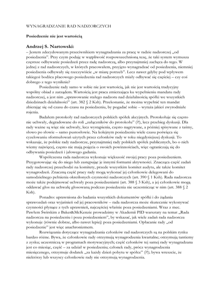 WYNAGRADZANIE RAD NADZORCZYCH Posiedzenie nie jest wartością Andrzej S. Nartowski: – Jestem zdecydowanym przeciwnikiem wynagradzania za pracę w radzie nadzorczej „od posiedzenia”. Przy czym podaję w wątpliwość rozpowszechnioną tezę, Ŝe taki system wymusza częstsze odbywanie posiedzeń przez radę nadzorczą, albo przynajmniej zachęca do tego. W jednej z rad nadzorczych, w których pracowałem, przyjęto wynagradzać od posiedzenia, niemniej posiedzenia odbywały się rzeczywiście „w miarę potrzeb”. Lecz nawet gdyby pod wpływem takiegoŜ bodźca płacowego posiedzenia rad nadzorczych miały odbywać się częściej – czy coś dobrego z tego wyniknie? Posiedzenie rady samo w sobie nie jest wartością, jak nie jest wartością tradycyjny wspólny obiad z zarządem. Wartością jest praca zmierzająca ku wypełnieniu mandatu rady nadzorczej, a jest nim „sprawowanie stałego nadzoru nad działalnością spółki we wszystkich dziedzinach działalności” (art. 382 § 2 Ksh). Przekonanie, Ŝe moŜna wypełnić ten mandat zbierając się od czasu do czasu na posiedzeniu, by pogadać sobie – wyraŜa jakieś zwyrodniałe rojenia. Badałem protokoły rad nadzorczych polskich spółek akcyjnych. Protokołuje się często nie uchwały, degradowane do roli „załączników do protokołu” (?!), lecz przebieg dyskusji. Dla rady waŜne są więc nie uchwały, lecz wystąpienia, często nagrywane, a później spisywane z taśmy, słowo po słowie – samo pustosłowie. Na kolejnym posiedzeniu wiele czasu poświęca się cyzelowaniu sformułowań uŜytych przez członków rady w toku niegdysiejszej dyskusji. To wskazuje, Ŝe polskie rady nadzorcze, przynajmniej rady polskich spółek publicznych, bo o nich wiemy najwięcej, często nie mają pojęcia o swoich powinnościach, więc ograniczają się do odbywania posiedzeń i jałowego gadania. Współczesna rada nadzorcza wykonuje większość swojej pracy poza posiedzeniem. Przygotowując się do niego lub zastępując je innymi formami aktywności. Znacząca część zadań rady nadzorczej przechodzi na komitety, przede wszystkim komitet audytu, ale takŜe komitet wynagrodzeń. Znaczną część pracy rady mogą wykonać jej członkowie delegowani do samodzielnego pełnienia określonych czynności nadzorczych (art. 390 § 1 Ksh). Rada nadzorcza moŜe takŜe podejmować uchwały poza posiedzeniami (art. 388 § 3 Ksh), a jej członkowie mogą oddawać głos na uchwałę głosowaną podczas posiedzenia nie uczestnicząc w nim (art. 388 § 2 Ksh). Ponadto: uprawniona do badania wszystkich dokumentów spółki i do Ŝądania sprawozdań oraz wyjaśnień od jej pracowników – rada nadzorcza moŜe skutecznie wykonywać czynności płynące z tych uprawnień, najczęściej właśnie poza posiedzeniami. Wraz z mec. Pawłem Świrskim z Baker&McKenzie prowadzimy w Akademii PID warsztaty na temat „Rada nadzorcza na posiedzeniu i poza posiedzeniem”, by wskazać, jak wiele zadań rada nadzorcza wykonuje (równie dobrze, albo nawet lepiej) poza posiedzeniami. Opłacanie rady „od posiedzenie” jest więc anachronizmem. Rozwiązania dotyczące wynagradzania członków rad nadzorczych są na polskim rynku bardzo róŜne. Bywa, Ŝe członkowie rady otrzymują wynagrodzenia kwartalne; otrzymują tantiemy z zysku; uczestniczą w programach motywacyjnych; część członków tej samej rady wynagradzana jest co miesiąc, część – za udział w posiedzeniu; członek rady, prócz wynagrodzenia miesięcznego, otrzymuje dodatek „za kaŜdy dzień pobytu w spółce” (?!); bywa wreszcie, Ŝe niektórzy lub wszyscy członkowie rady nie otrzymują wynagrodzenia. Z selektywnym pozbawianiem członków rady nadzorczej wynagrodzenia spotykamy się najczęściej w odniesieniu do członków rady reprezentujących inwestora strategicznego. Nie budzi to emocji. Zdarza się, Ŝe nieodpłatnie pełnią funkcje w radzie wszyscy jej członkowie pozbawieni przymiotu niezaleŜności. Niekiedy członkowie rady pozbawiani są wynagrodzenia za czynności podejmowane w trybie pisemnym lub przy wykorzystaniu środków bezpośredniego porozumiewania się na odległość, natomiast otrzymują wynagrodzenie za udział w posiedzeniu „naziemnym”. Wszyscy członkowie rady pozbawiani są wynagrodzenia w spółkach szczególnie ubogich. Czy są oni świadomi, Ŝe brak wynagrodzenia z tytułu członkostwa w radzie nie zwalnia ich od odpowiedzialności? Na polskim rynku nie utarła się jeszcze jednolita praktyka wynagradzania za udział w komitetach rady nadzorczej. Trwają prace nad dobrymi praktykami komitetów audytu w Polsce (patrz dział Dokumenty w bieŜącym numerze); dokument ten powinien upomnieć się pełnym głosem o rzetelne wynagradzania członków komitetu audytu, w tym przewodniczącego komitetu, od którego oczekuje się i kwalifikacji, i niezaleŜności. Udział w pracy innych komitetów takŜe mógłby być odrębnie wynagradzany, z tym wszakŜe zastrzeŜeniem, iŜ praca w komitecie audytu – jeŜeli nawet nie jest on uznawany za najwaŜniejszy komitet w radzie nadzorczej bądź nawet za jej esencję (słyszy się takie głosy) – z pewnością jest najbardziej czasochłonna. W rzeczy samej, w wielu radach komitet audytu samoistnie wysuwa się na plan pierwszy, spychając w cień „prezydium” rady, „komisję prezydialną” lub inne mutanty. Systemy wynagradzania rad nadzorczych to na polskim rynku bogactwo róŜnorodności. Nie warto walczyć o ujednolicenie zasad wynagradzania, na wzór ujednolicenia systemów wynagradzania członków zarządów i rad nadzorczych spółek poddanych osławionej „ustawie kominowej”. Tolerancja, nawet uznanie dla róŜnorodności, nie dotyczy wszakŜe kwestii obejmowania członków rad nadzorczych programami motywacyjnymi. Tu zajmuję stanowisko jednoznacznie przeciwne. Nie naleŜy korumpować rady nadzorczej pokusą zamykania oczu na usiłowania zarządu „picowania” wyniku finansowego, bąd