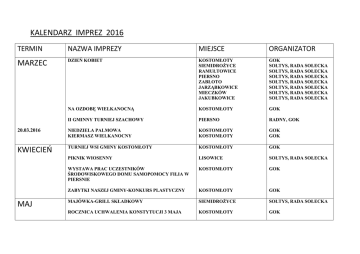 KALENDARZ IMPREZ 2016 TERMIN NAZWA IMPREZY MIEJSCE ORGANIZATOR MARZEC DZIEŃ KOBIET KOSTOMŁOTY SIEMIDROŻYCE RAMUŁTOWICE PIERSNO ZABŁOTO JARZĄBKOWICE MIECZKÓW JAKUBKOWICE GOK SOŁTYS, RADA SOŁECKA SOŁTYS, RADA SOŁECKA SOŁTYS, RADA SOŁECKA SOŁTYS, RADA SOŁECKA SOŁTYS, RADA SOŁECKA SOŁTYS, RADA SOŁECKA SOŁTYS, RADA SOŁECKA NA OZDOBĘ WIELKANOCNĄ KOSTOMŁOTY GOK II GMINNY TURNIEJ SZACHOWY PIERSNO RADNY, GOK 20.03.2016 NIEDZIELA PALMOWA KIERMASZ WIELKANOCNY KOSTOMŁOTY KOSTOMŁOTY GOK GOK KWIECIEŃ TURNIEJ WSI GMINY KOSTOMŁOTY KOSTOMŁOTY GOK PIKNIK WIOSENNY LISOWICE SOŁTYS, RADA SOŁECKA WYSTAWA PRAC UCZESTNIKÓW ŚRODOWISKOWEGO DOMU SAMOPOMOCY FILIA W PIERSNIE KOSTOMŁOTY GOK ZABYTKI NASZEJ GMINY-KONKURS PLASTYCZNY KOSTOMŁOTY GOK MAJÓWKA-GRILL SKŁADKOWY SIEMIDROŻYCE SOŁTYS, RADA SOŁECKA ROCZNICA UCHWALENIA KONSTYTUCJI 3 MAJA KOSTOMŁOTY GOK MAJ TURNIEJ WSI CZERWIEC GOK MAJÓWKA CHMIELÓW SOŁTYS, RADA SOŁECKA DZIEŃ MATKI I OJCA KOSTOMŁOTY JARZĄBKOWICE JAKUBKOWICE GOK SOŁTYS, RADA SOŁECKA DZIEŃ MATKI I DZIEŃ DZIECKA LISOWICE SOŁTYS, RADA SOŁECKA DZIEŃ DZIECKA KOSTOMŁOTY KARCZYCE PIERSNO ZABŁOTO SZYMANOWICE PIOTROWICE RAMUŁTOWICE PAŹDZIORNO WILKÓW ŚREDZKI WICHRÓW OSIEK JARZĄBKOWICE MIECZKÓW BUDZISZÓW JAKUBKOWICE GOK SOŁTYS, RADA SOŁECKA SOŁTYS, RADA SOŁECKA SOŁTYS, RADA SOŁECKA SOŁTYS, RADA SOŁECKA SOŁTYS, RADA SOŁECKA SOŁTYS, RADA SOŁECKA SOŁTYS, RADA SOŁECKA SOŁTYS, RADA SOŁECKA SOŁTYS, RADA SOŁECKA SOŁTYS, RADA SOŁECKA SOŁTYS, RADA SOŁECKA SOŁTYS, RADA SOŁECKA SOŁTYS, RADA SOŁECKA SOŁTYS, RADA SOŁECKA PIKNIK RODZINNY SZYMANOWICE PIOTROWICE CHMIELÓW SOŁTYS, RADA SOŁECKA SOŁTYS, RADA SOŁECKA SOŁTYS, RADA SOŁECKA POWITANIE LATA SIEMIDROŻYCE LISOWICE SOŁTYS, RADA SOŁECKA SOŁTYS, RADA SOŁECKA ZAKOŃCZENIE ROKU MUZYCZNEGO KOSTOMŁOTY GOK LIPIEC SIERPIEŃ LETNI FESTYN WICHRÓW JARZĄBKOWICE SOŁTYS, RADA SOŁECKA SOŁTYS, RADA SOŁECKA FESTYN WAKACYJNY KOSTOMŁOTY GOK ZABAWA WIEJSKA SIEMIDROŻYCE SOŁTYS, RADA SOŁECKA AKCJA LATO W GOK KOSTOMŁOTY GOK DOŻYNKI GMINNE KOSTOMŁOTY GOK FESTYN ODPUSTOWY SIEMIDROŻYCE SOŁTYS, RADA SOŁECKA ZAKOŃCZENIE LATA LISOWICE OSIEK SOŁTYS, RADA SOŁECKA SOŁTYS, RADA SOŁECKA WICHRÓW SOŁTYS, RADA SOŁECKA VIII EDYCJA KONKURSU MAM TALENT- CASING W KOSTOMŁOTACH KOSTOMŁOTY GOK DOŻYNKI WIEJSKIE CHMIELÓW PIOTROWICE MIECZKÓW SOŁTYS, RADA SOŁECKA SOŁTYS, RADA SOŁECKA SOŁTYS, RADA SOŁECKA WYSTAWA PRAC MACIEJA SZYNALA KOSTOMŁOTY GOK LETNI FESTYN WRZESIEŃ TURNIEJ WSI ŚWIĘTO PIECZONEGO ZIEMNIAKA GOK LISOWICE SOŁTYS, RADA SOŁECKA PAŹDZIERNIK LISTOPAD GRUDZIEŃ FINAŁ KONKURSU „MAM TALENT”. KOSTOMŁOTY GOK DZIEŃ SENIORA KOSTOMŁOTY WICHRÓW MIECZKÓW BUDZISZÓW SOŁTYS, RADA SOŁECKA SOŁTYS, RADA SOŁECKA SOŁTYS, RADA SOŁECKA SOŁTYS, RADA SOŁECKA TURNIEJU WSI KOSTOMŁOTY GOK ŚWIĘTO PIECZONEGO ZIEMNIAKA BOGDANÓW CHMIELÓW SOŁTYS, RADA SOŁECKA SOŁTYS, RADA SOŁECKA NARODOWE ŚWIĘTO NIEPODLEGŁOŚCI KOSTOMŁOTY JARZĄBKOWICE GOK SOŁTYS, RADA SOŁECKA ZABAWA ANDZEJKOWA KOSTOMŁOTY CHMIELÓW SIEMIDROŻYCE JAKUBKOWICE GOK SOŁTYS, RADA SOŁECKA SOŁTYS, RADA SOŁECKA SOŁTYS, RADA SOŁECKA ŚWIĘTO PLUSZOWEGO MISIA KOSTOMŁOTY GOK KONKURS NA SZOPKĘ BOŻONARODZENIOWĄ KOSTOMŁOTY GOK MIKOŁAJKI KOSTOMŁOTY RAMUŁTOWICE SIEMIDROŻYCE KARCZYCE ZABŁOTO CHMIELÓW WICHRÓW JARZĄBKOWICE GOK SOŁTYS, RADA SOŁECKA SOŁTYS, RADA SOŁECKA SOŁTYS, RADA SOŁECKA SOŁTYS, RADA SOŁECKA SOŁTYS, RADA SOŁECKA SOŁTYS, RADA SOŁECKA SOŁTYS, RADA SOŁECKA SPOTKANIE WIGILIJNE KOSTOMŁOTY GOK ZABAWA SYLWESTROWA KOSTOMŁOTY GOK KOSTOMŁOTY SIEMIDROŻYCE PIOTROWICE JAKUBKOWICE OSIEK SOŁTYS, RADA SOŁECKA SOŁTYS, RADA SOŁECKA SOŁTYS, RADA SOŁECKA SOŁTYS, RADA SOŁECKA SOŁTYS, RADA SOŁECKA