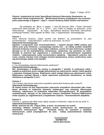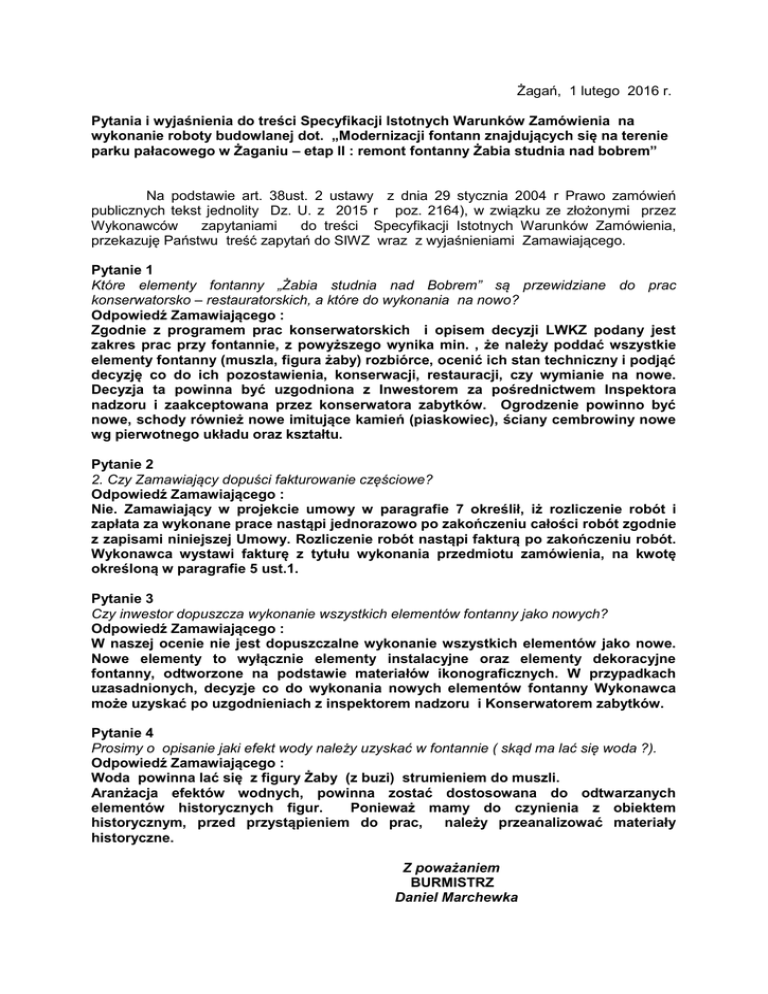 Żagań, 1 lutego 2016 r. Pytania i wyjaśnienia do treści Specyfikacji Istotnych Warunków Zamówienia na wykonanie roboty budowlanej dot. „Modernizacji fontann znajdujących się na terenie parku pałacowego w Żaganiu – etap II : remont fontanny Żabia studnia nad bobrem” Na podstawie art. 38ust. 2 ustawy z dnia 29 stycznia 2004 r Prawo zamówień publicznych tekst jednolity Dz. U. z 2015 r poz. 2164), w związku ze złożonymi przez Wykonawców zapytaniami do treści Specyfikacji Istotnych Warunków Zamówienia, przekazuję Państwu treść zapytań do SIWZ wraz z wyjaśnieniami Zamawiającego. Pytanie 1 Które elementy fontanny „Żabia studnia nad Bobrem” są przewidziane do prac konserwatorsko – restauratorskich, a które do wykonania na nowo? Odpowiedź Zamawiającego : Zgodnie z programem prac konserwatorskich i opisem decyzji LWKZ podany jest zakres prac przy fontannie, z powyższego wynika min. , że należy poddać wszystkie elementy fontanny (muszla, figura żaby) rozbiórce, ocenić ich stan techniczny i podjąć decyzję co do ich pozostawienia, konserwacji, restauracji, czy wymianie na nowe. Decyzja ta powinna być uzgodniona z Inwestorem za pośrednictwem Inspektora nadzoru i zaakceptowana przez konserwatora zabytków. Ogrodzenie powinno być nowe, schody również nowe imitujące kamień (piaskowiec), ściany cembrowiny nowe wg pierwotnego układu oraz kształtu. Pytanie 2 2. Czy Zamawiający dopuści fakturowanie częściowe? Odpowiedź Zamawiającego : Nie. Zamawiający w projekcie umowy w paragrafie 7 określił, iż rozliczenie robót i zapłata za wykonane prace nastąpi jednorazowo po zakończeniu całości robót zgodnie z zapisami niniejszej Umowy. Rozliczenie robót nastąpi fakturą po zakończeniu robót. Wykonawca wystawi fakturę z tytułu wykonania przedmiotu zamówienia, na kwotę określoną w paragrafie 5 ust.1. Pytanie 3 Czy inwestor dopuszcza wykonanie wszystkich elementów fontanny jako nowych? Odpowiedź Zamawiającego : W naszej ocenie nie jest dopuszczalne wykonanie wszystkich elementów jako nowe. Nowe elementy to wyłącznie elementy instalacyjne oraz elementy dekoracyjne fontanny, odtworzone na podstawie materiałów ikonograficznych. W przypadkach uzasadnionych, decyzje co do wykonania nowych elementów fontanny Wykonawca może uzyskać po uzgodnieniach z inspektorem nadzoru i Konserwatorem zabytków. Pytanie 4 Prosimy o opisanie jaki efekt wody należy uzyskać w fontannie ( skąd ma lać się woda ?). Odpowiedź Zamawiającego : Woda powinna lać się z figury Żaby (z buzi) strumieniem do muszli. Aranżacja efektów wodnych, powinna zostać dostosowana do odtwarzanych elementów historycznych figur. Ponieważ mamy do czynienia z obiektem historycznym, przed przystąpieniem do prac, należy przeanalizować materiały historyczne. Z poważaniem BURMISTRZ Daniel Marchewka