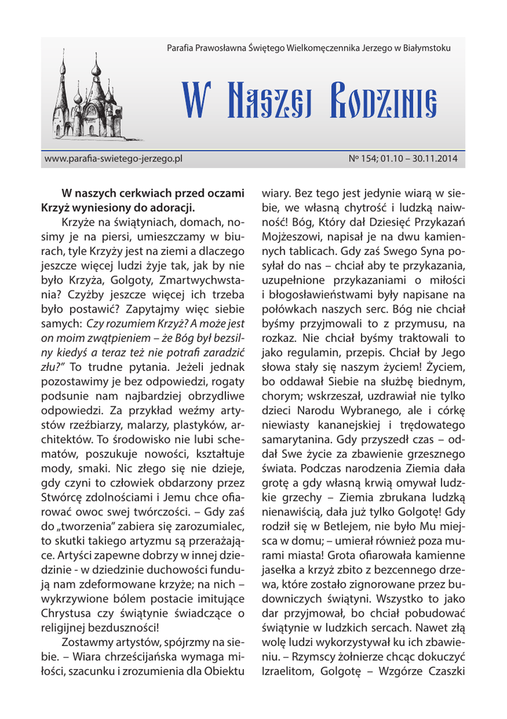 Parafia Prawosławna Świętego Wielkomęczennika Jerzego w Białymstoku www.parafia-swietego-jerzego.pl W naszych cerkwiach przed oczami Krzyż wyniesiony do adoracji. Krzyże na świątyniach, domach, nosimy je na piersi, umieszczamy w biurach, tyle Krzyży jest na ziemi a dlaczego jeszcze więcej ludzi żyje tak, jak by nie było Krzyża, Golgoty, Zmartwychwstania? Czyżby jeszcze więcej ich trzeba było postawić? Zapytajmy więc siebie samych: Czy rozumiem Krzyż? A może jest on moim zwątpieniem – że Bóg był bezsilny kiedyś a teraz też nie potrafi zaradzić złu?” To trudne pytania. Jeżeli jednak pozostawimy je bez odpowiedzi, rogaty podsunie nam najbardziej obrzydliwe odpowiedzi. Za przykład weźmy artystów rzeźbiarzy, malarzy, plastyków, architektów. To środowisko nie lubi schematów, poszukuje nowości, kształtuje mody, smaki. Nic złego się nie dzieje, gdy czyni to człowiek obdarzony przez Stwórcę zdolnościami i Jemu chce ofiarować owoc swej twórczości. – Gdy zaś do „tworzenia” zabiera się zarozumialec, to skutki takiego artyzmu są przerażające. Artyści zapewne dobrzy w innej dziedzinie - w dziedzinie duchowości fundują nam zdeformowane krzyże; na nich – wykrzywione bólem postacie imitujące Chrystusa czy świątynie świadczące o religijnej bezduszności! Zostawmy artystów, spójrzmy na siebie. – Wiara chrześcijańska wymaga miłości, szacunku i zrozumienia dla Obiektu Nº 154; 01.10 – 30.11.2014 wiary. Bez tego jest jedynie wiarą w siebie, we własną chytrość i ludzką naiwność! Bóg, Który dał Dziesięć Przykazań Mojżeszowi, napisał je na dwu kamiennych tablicach. Gdy zaś Swego Syna posyłał do nas – chciał aby te przykazania, uzupełnione przykazaniami o miłości i błogosławieństwami były napisane na połówkach naszych serc. Bóg nie chciał byśmy przyjmowali to z przymusu, na rozkaz. Nie chciał byśmy traktowali to jako regulamin, przepis. Chciał by Jego słowa stały się naszym życiem! Życiem, bo oddawał Siebie na służbę biednym, chorym; wskrzeszał, uzdrawiał nie tylko dzieci Narodu Wybranego, ale i córkę niewiasty kananejskiej i trędowatego samarytanina. Gdy przyszedł czas – oddał Swe życie za zbawienie grzesznego świata. Podczas narodzenia Ziemia dała grotę a gdy własną krwią omywał ludzkie grzechy – Ziemia zbrukana ludzką nienawiścią, dała już tylko Golgotę! Gdy rodził się w Betlejem, nie było Mu miejsca w domu; – umierał również poza murami miasta! Grota ofiarowała kamienne jasełka a krzyż zbito z bezcennego drzewa, które zostało zignorowane przez budowniczych świątyni. Wszystko to jako dar przyjmował, bo chciał pobudować świątynie w ludzkich sercach. Nawet złą wolę ludzi wykorzystywał ku ich zbawieniu. – Rzymscy żołnierze chcąc dokuczyć Izraelitom, Golgotę – Wzgórze Czaszki uczynili miejscem kaźni. Krzyż postawili tam, gdzie byli pochowani Adam i Ewa. A ukrzyżowany Zbawiciel własną krwią omywał kości Prarodziców stworzonych na obraz i podobieństwo Boże! Swymi cierpieniami nas uczył cierpliwości. Tym, którzy wbijali mu gwoździe nie powiedział: „Ja was zapamiętam” ale mówił: „Ojcze wybacz im..” Przyjął cierpienia z miłości do ludzi. To dlatego Jego twarz nawet na Krzyżu była pogodna. Oczywiście bolał nad tym, co Mu uczynili ludzie, ale większą była radość ze spełnienia woli Ojca! - Łotrowi drwiącemu z Boga: „jeżeli Nim jesteś to nas pozdejmuj z krzyży, to uwierzymy” – nic nie odpowiedział. Ale drugiemu, który w chwili konania zdobył się na współczucie – Siebie i Swoje królestwo ofiarował! To o tym przypomina podnóżek na krzyżach w cerkwi – wobec Boga nie można być letnim, obojętnym. Nie można być biernym obserwatorem Krzyża. Można być tylko „za” albo „przeciw”. Nie można też liczyć, że zbawi nas bliskość Boga. – ON zawsze jest przy nas. Z nami przebywa gdy przyjmujemy Priczastije. Ale od nas zależy to, jak Go przyjmiemy i co Mu ofiarujemy! Krzyż, poświęcony na Golgocie i Grobie Pańskim, wynoszony na środek naszej świątyni jest jak drogowskaz i przypomnienie. – Wierzymy w Zmartwychwstanie, które przyszło dzięki Krzyżowi. Idziemy pokłonić się Chrystusowi, Który umarł, by duszą jako człowiek a zarazem jako Bóg zejść aż do piekieł po Swoją własność – po dusze zmarłych dzieci, które chciały być bogami! Najpierw własną krwią omył ich kości, później własnymi rękoma z otchłani wyprowadził ich dusze! Krzyż jest tego znakiem. Jeżeli ktoś tego nie zrozumie, będzie go odwracać do góry nogami, ośmieszać, profanować. Będzie myśleć o sobie, że jest modny, wyzwolony a okaże się, że nieświadomie posłużył rogatemu – temu samemu, który kiedyś namówił ludzi, by Bogu krzyż postawili. Chroń nas Boże przed złymi pokusami. Pozwól nam, na znak że jesteśmy Twoimi dziećmi, godnie nosić krzyżyk na własnej piersi. o. Grzegorz W NASZEJ PARAFII ⁜ Wydarzyło się sporo. Osiągnięcia niewielkie ale istotnie wpływające na funkcjonowanie Parafii. – W górnej cerkwi wymieniono, a dokładniej na bazie istniejącego nagłośnienia stworzono ja kościowo nowe, które pozwala spokojnie uczestniczyć w nabożeństwach i zapewnia słyszalność w każdym miejscu w cerkwi. ⁜ Założono aluminiowe okna w dzwo nnicy i uzgodniono wykonanie żaluzji w na najwyższym piętrze wieży. – Tam niemożliwym było wstawienie zwykłych okien. Aby zapewnić słyszalność, trzeba by było je otwierać na czas dzwonienia. Przy znacznej wysokości (18 m) i silnych przeciągach nie było by to bezpieczne dla dzwonnika. ⁜ Dokonano naprawy uszkodzonych elementów fresku. Aby wykonać prace na wysokości 18 m, trzeba było z wielką ostrożnością na wykonaną już posadzkę ustawić (i rozebrać) specjalistyczne rusztowania. Było to możliwe dzięki ofiarności i życzliwości Państwa Majdan – kt