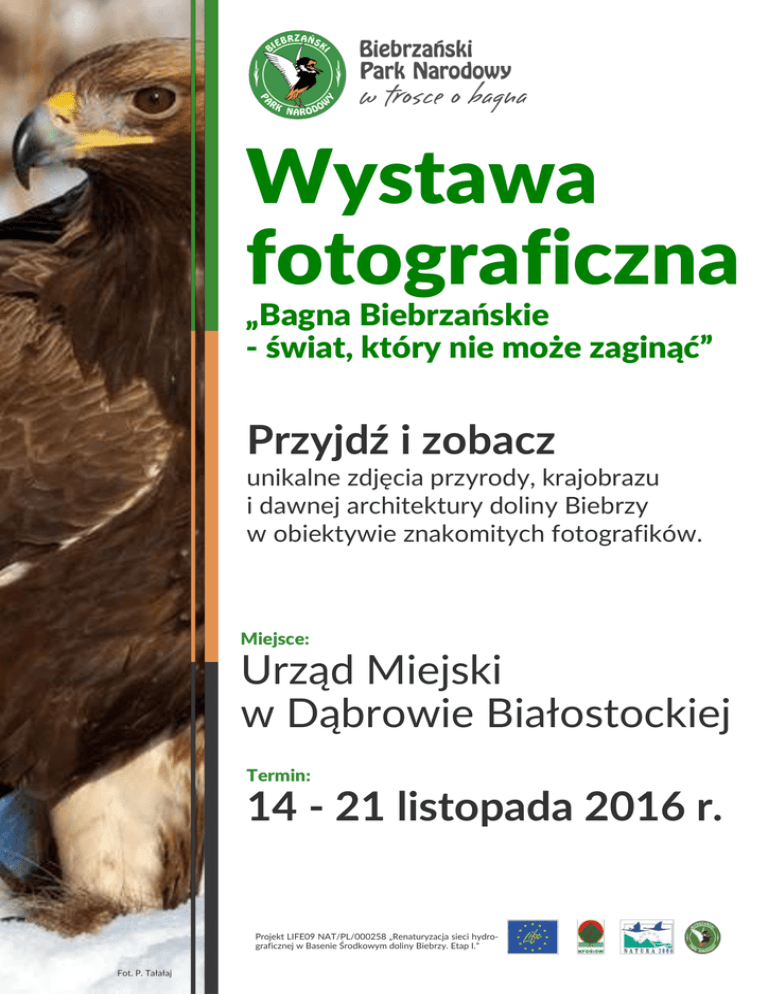 Wystawa fotograficzna „Bagna Biebrzańskie - świat, który nie może zaginąć” Przyjdź i zobacz unikalne zdjęcia przyrody, krajobrazu i dawnej architektury doliny Biebrzy w obiektywie znakomitych fotografików. Miejsce: Urząd Miejski w Dąbrowie Białostockiej Termin: 14 - 21 listopada 2016 r. Projekt LIFE09 NAT/PL/000258 „Renaturyzacja sieci hydrograficznej w Basenie Środkowym doliny Biebrzy. Etap I.” Fot. P. Tałałaj