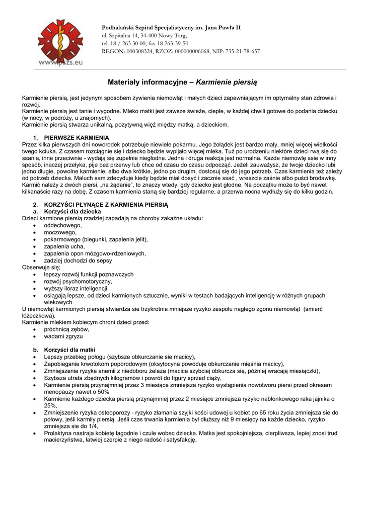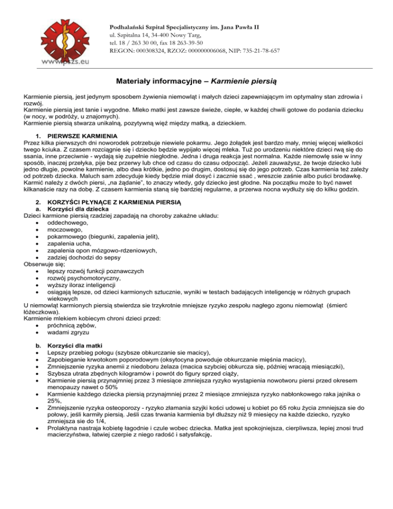 Podhalański Szpital Specjalistyczny im. Jana Pawła II ul. Szpitalna 14, 34-400 Nowy Targ, tel. 18 / 263 30 00, fax 18 263-39-50 REGON: 000308324, RZOZ: 000000006068, NIP: 735-21-78-657 Materiały informacyjne – Karmienie piersią Karmienie piersią, jest jedynym sposobem żywienia niemowląt i małych dzieci zapewniającym im optymalny stan zdrowia i rozwój. Karmienie piersią jest tanie i wygodne. Mleko matki jest zawsze świeże, ciepłe, w każdej chwili gotowe do podania dziecku (w nocy, w podróży, u znajomych). Karmienie piersią stwarza unikalną, pozytywną więź między matką, a dzieckiem. 1. PIERWSZE KARMIENIA Przez kilka pierwszych dni noworodek potrzebuje niewiele pokarmu. Jego żołądek jest bardzo mały, mniej więcej wielkości twego kciuka. Z czasem rozciągnie się i dziecko będzie wypijało więcej mleka. Tuż po urodzeniu niektóre dzieci rwą się do ssania, inne przeciwnie - wydają się zupełnie niegłodne. Jedna i druga reakcja jest normalna. Każde niemowlę ssie w inny sposób, inaczej przełyka, pije bez przerwy lub chce od czasu do czasu odpocząć. Jeżeli zauważysz, że twoje dziecko lubi jedno długie, powolne karmienie, albo dwa krótkie, jedno po drugim, dostosuj się do jego potrzeb. Czas karmienia też zależy od potrzeb dziecka. Maluch sam zdecyduje kiedy będzie miał dosyć i zacznie ssać , wreszcie zaśnie albo puści brodawkę. Karmić należy z dwóch piersi, „na żądanie”, to znaczy wtedy, gdy dziecko jest głodne. Na początku może to być nawet kilkanaście razy na dobę. Z czasem karmienia staną się bardziej regularne, a przerwa nocna wydłuży się do kilku godzin. 2. KORZYŚCI PŁYNĄCE Z KARMIENIA PIERSIĄ a. Korzyści dla dziecka Dzieci karmione piersią rzadziej zapadają na choroby zakaźne układu: oddechowego, moczowego, pokarmowego (biegunki, zapalenia jelit), zapalenia ucha, zapalenia opon mózgowo-rdzeniowych, zadziej dochodzi do sepsy Obserwuje się; lepszy rozwój funkcji poznawczych rozwój psychomotoryczny, wyższy iloraz inteligencji osiągają lepsze, od dzieci karmionych sztucznie, wyniki w testach badających inteligencję w różnych grupach wiekowych U niemowląt karmionych piersią stwierdza sie trzykrotnie mniejsze ryzyko zespołu nagłego zgonu niemowląt (śmierć łóżeczkowa). Karmienie mlekiem kobiecym chroni dzieci przed: próchnicą zębów, wadami zgryzu b. Korzyści dla matki Lepszy przebieg połogu (szybsze obkurczanie sie macicy), Zapobieganie krwotokom poporodowym (oksytocyna powoduje obkurczanie mięśnia macicy), Zmniejszenie ryzyka anemii z niedoboru żelaza (macica szybciej obkurcza się, później wracają miesiączki), Szybsza utrata zbędnych kilogramów i powrót do figury sprzed ciąży, Karmienie piersią przynajmniej przez 3 miesiące zmniejsza ryzyko wystąpienia nowotworu piersi przed okresem menopauzy nawet o 50% Karmienie każdego dziecka piersią przynajmniej przez 2 miesiące zmniejsza ryzyko nabłonkowego raka jajnika o 25%, Zmniejszenie ryzyka osteoporozy - ryzyko złamania szyjki kości udowej u kobiet po 65 roku życia zmniejsza sie do połowy, jeśli karmiły piersią. Jeśli czas trwania karmienia był dłuższy niż 9 miesięcy na każde dziecko, ryzyko zmniejsza sie do 1/4, Prolaktyna nastraja kobietę łagodnie i czule wobec dziecka. Matka jest spokojniejsza, cierpliwsza, lepiej znosi trud macierzyństwa, łatwiej czerpie z niego radość i satysfakcję.