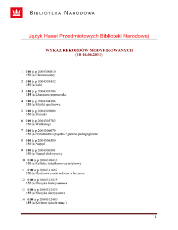Język Haseł Przedmiotowych Biblioteki Narodowej WYKAZ REKORDÓW MODYFIKOWANYCH (10-16.06.2011) 1 010 |a p 2004300810 150 |a Chromosomy 2 010 |a p 2004303432 150 |a Leki 3 010 |a p 2004303586 155 |a Literatura esperancka 4 010 |a p 2004304386 150 |a Silniki spalinowe 5 010 |a p 2004305088 150 |a Ślimaki 6 010 |a p 2004305783 150 |a Widłonogi 7 010 |a p 2004306079 150 |a Poradnictwo psychologiczno-pedagogiczne 8 010 |a p 2004306580 150 |a Napęd 9 010 |a p 2004306581 150 |a Napęd elektryczny 10 010 |a p 2004310433 150 |a Refluks żołądkowo-przełykowy 11 010 |a p 2004311687 150 |a Dychawica oskrzelowa |x leczenie 12 010 |a p 2004312435 155 |a Muzyka fortepianowa 13 010 |a p 2004312439 155 |a Muzyka skrzypcowa 14 010 |a p 2004312480 155 |a Kwintet (utwór muz.) 1 15 010 |a p 2004312481 155 |a Muzyka na fagot 16 010 |a p 2004312483 155 |a Muzyka na klarnet 17 010 |a p 2004312488 155 |a Muzyka wiolonczelowa 18 010 |a p 2004313143 150 |a Napęd elektrohydrauliczny 19 010 |a p 2004313597 155 |a Czasopisma rosyjskie 20 010 |a p 2004316970 155 |a Czasopisma turystyczne 21 010 |a p 2004319430 150 |a Samoloty myśliwskie 22 010 |a p 2004320468 150 |a DNA (chem.) 23 010 |a p 2004322756 150 |a Podwoda 24 010 |a p 2004322757 150 |a Transport wojskowy 25 010 |a p 2004323299 150 |a Pojazdy wojskowe 26 010 |a p 2004323317 150 |a Kompleksowa karta wyników 27 010 |a p 2004323732 150 |a Rezerwaty i parki narodowe |z Stany Zjednoczone 28 010 |a p 2004324538 155 |a Fotografia |x technika 29 010 |a p 2004324614 155 |a Suita (skrzypce i orkiestra) 30 010 |a p 2004324615 155 |a Wariacje (flet i orkiestra kameralna) 31 010 |a p 2004324616 155 |a Wariacje (orkiestra) 32 010 |a p 2004324785 155 |a Fotografia cyfrowa 33 010 |a p 2004324798 155 |a Literatura luksemburska 2 34 010 |a p 2004324905 155 |a Poezja katalońska 35 010 |a p 2004324941 155 |a Ilustracje dla dzieci 36 010 |a p 2004324956 155 |a Literatura międzytestamentalna 37 010 |a p 2004324957 155 |a Literatura apokaliptyczna 38 010 |a p 2004325124 155 |a Poezja nowozelandzka 39 010 |a p 2004325142 155 |a Fotografia reklamowa 40 010 |a p 2004325171 155 |a Fotonowele 41 010 |a p 2004325307 155 |a Winiety 42 010 |a p 2004325708 155 |a Purim szpil 43 010 |a p 2004325750 155 |a Blogi 44 010 |a p 2004325806 155 |a Czasopisma archiwistyczne 45 010 |a p 2004325807 155 |a Czasopisma archiwistyczne amerykańskie 46 010 |a p 2004325816 155 |a Czasopisma archiwistyczne niemieckie 47 010 |a p 2004326077 155 |a Czasopisma społeczno-kulturalne koreańskie 48 010 |a p 2004326078 155 |a Czasopisma bibliotekarskie macedońskie 49 010 |a p 2004326116 155 |a Kwartet na instrumenty dęte drewniane (saksofon (4)) 50 010 |a p 2004326117 155 |a Polonez (chór mieszany i orkiestra) 51 010 |a p 2004326133 155 |a Modlitewniki dla dzieci 52 010 |a p 2004326219 155 |a Czasopisma religioznawcze 3 53 010 |a p 2004326360 155 |a Koncert (instrumenty perkusyjne i orkiestra smyczkowa) 54 010 |a p 2004326365 155 |a Muzyka na klarnet i fagot 55 010 |a p 2004326366 155 |a Muzyka na klarnet i róg 56 010 |a p 2004326367 155 |a Suita (puzon (4)) 57 010 |a p 2004326369 155 |a Suita (altówka) 58 010 |a p 2004326370 155 |a Suita (altówka (2)) 59 010 |a p 2004326423 155 |a Mapy topograficzne 60 010 |a p 2004326509 155 |a Piosenka irlandzka 61 010 |a p 2004326554 155 |a Rysunek armeński 62 010 |a p 2004326631 155 |a Euchologion 63 010 |a p 2004326632 155 |a Trebnik 64 010 |a p 2004326734 155 |a Czasopisma hobbystyczne 65 010 |a p 2004326901 150 |a Weduta 66 010 |a p 2004327021 155 |a Film kanadyjski 67 010 |a p 2004327144 155 |a Czasopisma społeczno-kulturalne kolumbijskie 68 010 |a p 2004327632 155 |a Czasopisma akademickie chilijskie 69 010 |a p 2004327635 155 |a Poezja tadżycka 70 010 |a p 2004327694 155 |a Epos szorski 71 010 |a p 2004327780 155 |a Czasopisma filologiczne duńskie 4 72 010 |a p 2004327996 155 |a Plakat sportowy 73 010 |a p 2004328057 150 |a Jądro komórkowe 74 010 |a p 2004328078 155 |a Czasopisma bibliotekarskie skandynawskie 75 010 |a p 2004328368 155 |a Literatura dziecięca żydowska 76 010 |a p 2004328376 155 |a Pieśń ludowa łotewska 77 010 |a p 2004328708 155 |a Wodewil białoruski 78 010 |a p 2004328951 155 |a Czasopisma filologiczne słoweńskie 79 010 |a p 2004329200 150 |a Histony 80 010 |a p 2004329228 155 |a Czasopisma filologiczne szkockie 81 010 |a p 2004329388 155 |a Kwartet smyczkowy (wiolonczela (4)) 82 010 |a p 2004329389 155 |a Koncert (skrzypce i fortepian) 83 010 |a p 2004329392 155 |a Preludium (klarnet i fortepian) 84 010 |a p 2004329444 155 |a Czasopisma nielegalne litewskie 85 010 |a p 2004405496 151 |a Dębe Wielkie (woj. mazowieckie, pow. Mińsk Mazowiecki ; okręg) 86 010 |a p 2004408278 100 1. |a Kozicka, Maria Dunin |d (1877-1948) 87 010 |a p 2004409065 100 1. |a Wałach, Stanisław |d (1919-1999) 88 010 |a p 2004409650 100 1. |a Rurarz, Zdzisław |d (1930-2007) 89 010 |a p 2004410577 100 1. |a Pułaski, Kazimierz |d (1745-1779) 90 010 |a p 2004414072 100 0. |a Florian |c (św. ; |d ca 250-304) 5 91 010 |a p 2004420845 110 2. |a Polskie Towarzystwo Filologiczne 92 010 |a p 2004421625 110 2. |a Uniwersytet Artystyczny (Poznań) 93 010 |a p 2004424678 110 2. |a Warszawskie Towarzystwo Dobroczynności 94 010 |a p 2004425119 100 1. |a Ûdina, Marija Veniaminovna |d (1899-1970) 95 010 |a p 2004429399 150 |a Koło fortuny (teleturniej) 96 010 |a p 2004431005 110 2. |a Wyższa Szkoła Piechoty (Rembertów) 97 010 |a p 2004439527 150 |a Jeden z dziesięciu (teleturniej) 98 010 |a p 2004443243 100 1. |a Schnee, Heinrich |d (1871-1949) 99 010 |a p 2004508854 155 |a Bibliografia narodowa hiszpańska |x historia 100 010 |a p 2004508878 155 |a Bibliografia specjalna |x historia |z Rosja 101 010 |a p 2004529820 150 |a Elektrociepłownie |x prognozy |z Polska 102 010 |a p 2004534615 155 |a Film |x popularyzacja |z Polska 103 010 |a p 2004545330 150 |a Harcerstwo |x regulaminy 104 010 |a p 2004548447 150 |a Igrzyska olimpijskie |x regulaminy 105 