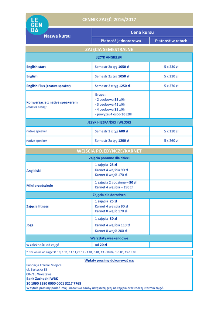 CENNIK ZAJĘĆ 2016/2017 Cena kursu Nazwa kursu Płatność jednorazowa Płatność w ratach ZAJĘCIA SEMESTRALNE JĘZYK ANGIELSKI English start Semestr 2x tyg 1050 zł 5 x 230 zł English Semestr 2x tyg 1050 zł 5 x 230 zł English Plus (+native speaker) Semestr 2 x tyg 1250 zł 5 x 270 zł Konwersacje z native speakerem (cena za osobę) Grupa: - 2 osobowa 55 zł/h - 3 osobowa 45 zł/h - 4 osobowa 35 zł/h - powyżej 4 osób 30 zł/h JĘZYK HISZPAŃSKI i WŁOSKI native speaker Semestr 1 x tyg 600 zł 5 x 130 zł native speaker Semestr 2x tyg 1200 zł 5 x 260 zł WEJŚCIA POJEDYNCZE/KARNET Zajęcia poranne dla dzieci Angielski 1 zajęcia 25 zł Karnet 4 wejścia 90 zł Karnet 8 wejść 170 zł Mini przedszkole 1 zajęcia 2 godzinne – 50 zł Karnet 4 wejścia – 190 zł Zajęcia dla dorosłych Zajęcia fitness 1 zajęcia 25 zł Karnet 4 wejścia 90 zł Karnet 8 wejść 170 zł 1 zajęcia 30 zł Joga Karnet 4 wejścia 110 zł Karnet 8 wejść 200 zł Warsztaty weekendowe w zależności od zajęć od 20 zł * Dni wolne od zajęć 31.10, 1.11, 11.11,23.12 - 1.01, 6.01, 13 - 18.04, 1-5.05, 15-16.06 Wpłaty prosimy dokonywać na: Fundacja Trzecie Miejsce ul. Bartycka 18 00-716 Warszawa Bank Zachodni WBK 30 1090 2590 0000 0001 3217 7768 W tytule prosimy podać imię i nazwisko osoby uczęszczającej na zajęcia oraz rodzaj i termin zajęć.