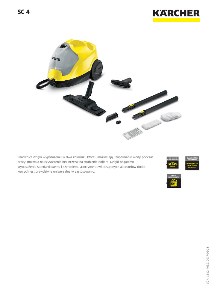SC 4 Parownica dzięki wyposażeniu w dwa zbiorniki, które umożliwiają uzupełnianie wody podczas * pracy, pozwala na czyszczenie bez przerw na studzenie bojlera. Dzięki bogatemu wyposażeniu standardowemu i szerokiemu asortymentowi dostępnych akcesoriów dodat* When thoroughly cleaning with the Kärcher Steam Cleaner 99.99 % of all common household bacteria will be killed on common household hard surfaces. SC 4, 1.512-405.0, 2017-02-28 kowych jest prawdziwie uniwersalna w zastosowaniu. SC 4 Dodatkowy zbiornik na wodę, który można łatwo zdemontować i napełnić umożliwia pracę bez przerw Osobne miejsce na przechowywanie przewodu zasilającego Dane techniczne 1.512-405.0 Numer katalogowy Wydajność powierzchniowa m² 100 Czas podgrzewania min. 4 Pojemność kotła / zbiornika wyrównawczego Maks. ciśnienie pary l 0,5 + 0,8 / Dodatkowy zbiornik bar 3,5 Moc grzałki W 2000 Przewód zasilający m 4 Ciężar bez wyposażenia kg 4,1 Wymiary (dł. x szer. x wys.) mm 380 × 251 × 273 Wyposażenie standardowe Bezpieczna blokada / Zawór bezpieczeństwa Regulacja ilości pary Wbudowany lejek do napełniania System dwóch zbiorników Zestaw do czyszczenia podłóg Comfort Plus + Rury ssące 2 x 0,5 m Na rękojeści Dysza ręczna, dysza do detali, okrągła szczotka Wyposażenie Ściereczka podłogowa z mikrofibry szt. 1 Ściereczka frotte do dyszy ręcznej szt. 1 Odkamieniacz w pałeczkach Wąż parowy z pistoletem Objęte dostawą. m 2 SC 4, 1.512-405.0, 2017-02-28 4054278040707 Akcesoria dla SC 4 1.512-405.0 1 2 3 4 5 6 7 9 11 12 13 14 15 16 Numer katalogowy Cena Opis Dysze Zestaw do czyszczenia podłóg "Comfort Plus" Dysza ręczna 1 2.863-019.0 2 2.884-280.0 Dysza podłogowa Comfort Mini 3 2.863-244.0 Dysza do czyszczenia okien 4 2.863-025.0 Dysza power 5 2.884-282.0 Dysza do pielęgnacji tekstyliów Dysza do pielęgnacji tekstyliów für SC Gumowa listwa do dyszy do okien 6 4.130-390.0 W zestawie dysza podłogowa Comfort Plus i ściereczka do dyszy podłogowej wykonana z mikrofibry. Dysza ręczna ze szczeciną do czyszczenia niewielkich powierzchni np. kabiny prysznicowe, płytki ścienne itp. Przeznaczona do pracy z lub bez powłoczki z mikrofibry. Dzięki swoim kompaktowym wymiarom dysza podłogowa "Comfort Mini" dociera do trudno dostępnych miejsc. Dysza do okien dokładnie czyści szkło, okna oraz lustra przy użyciu parownicy. Dysza Power z przedłużką znacznie zwiększa siłę czyszczenia dyszy do detali. Doskonała do łatwego, ekologicznego czyszczenia trudnodostępnych miejsc np. rogów. Dysza do pielęgnacji tekstyliów odświeża i usuwa zagięcia ubrań i tekstyliów, efektywnie usuwając nieprzyjemne zapachy. Posiada warstwę usuwającą meszek. 7 2.863-233.0 8 6.273-140.0 Gumowa listwa do dyszy do okien dla parownic. Miękkie powłoczki z mikrofibry na dużą szczotkę okrągłą 9 2.863-243.0 Ściereczki podłogowe z mikrofibry do dyszy podłogowej Comfort Plus 10 2.863-020.0 Zestaw powłoczek z mikrofibry 11 2.863-174.0 Zestaw składa się z: 2 miękkich powłoczek z mikrofibry na dużą szczotkę okrągłą. Do czyszczenia silnie zabrudzonych powierzchni w kuchni i w łazience. Zestaw składa się z 2 miękkich ściereczek podłogowych, o dużej chłonności, wykonanych z najwyższej jakości mikrofibry. Ściereczki pasują do nowej dyszy podłogowej Comfort Plus. Zestaw składa się z dwóch miękkich powłoczek z mikrofibry na dyszę ręczną przeznaczonych do czyszczenia silnie zabrudzonych powierzchni w kuchni i w łazience. Zestaw pięciu wysoce chłonnych powłoczek na dyszę ręczną z wysokiej jakości bawełny. Zestawy ściereczek Powłoczki frotte 5 sztuk 12 6.370-990.0 Zestawy szczotek 13 2.863-058.0 Zestaw szczotek z mosiężną szczeciną 14 2.863-061.0 Okrągła szczotka – duża 15 2.863-022.0 Szczotka okrągła ze skrobakiem 16 2.863-140.0 Parowa szczotka Turbo 17 2.863-159.0 Praktyczny zestaw okrągłych szczotek dostępny w dwóch kolorach Zestaw szczotek okrągłych z mosiężną szczeciną do usuwania uporczywych, zaschniętych zabrudzeń. Doskonałe do niewrażliwych powierzchni. Dzięki dużej, okrągłej szczotce wyczyścisz większą powierzchnię w krótszym czasie. Szczotka okrągła z dwoma rzędami odpornej na wysokie temperatury szczeciny oraz skrobakiem do łatwego usuwania uporczywych zabrudzeń. Nie nadaje się do czyszczenia powierzchni wrażliwych. Parowa szczotka Turbo ogranicza czas czyszczenia o połowę. Dzięki jej silnemu działaniu nie ma potrzeby szorowania. Umożliwia oszczędność czasu. Zdzieracz do tapet doskonale usuwa tapety oraz pozostałości kleju wykorzystując działanie pary. Zamienny zestaw O-ringów do wyposażenia parownic. Inne akcesoria Dysza do usuwania tapet 18 2.863-062.0 Zestaw O-ringów 19 2.884-312.0 Objęte dostawą. Dostępne akcesoria. SC 4, 1.512-405.0, 2017-02-28 Zestaw okrągłych szczotek