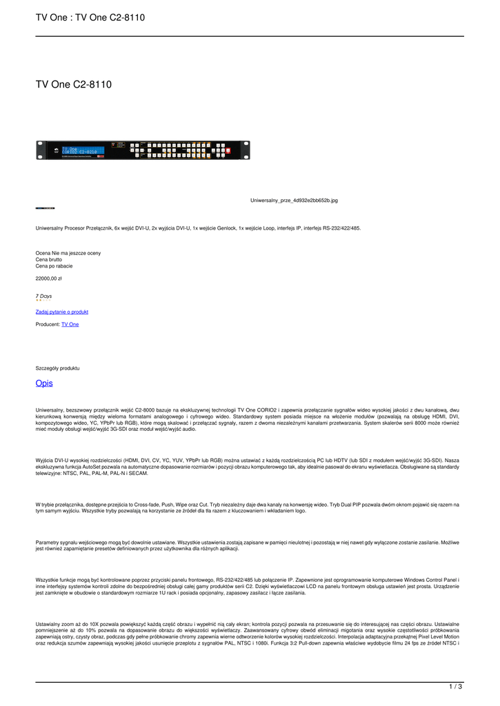 TV One : TV One C2-8110 TV One C2-8110 Uniwersalny_prze_4d932e2bb652b.jpg Uniwersalny Procesor Przełącznik, 6x wejść DVI-U, 2x wyjścia DVI-U, 1x wejście Genlock, 1x wejście Loop, interfejs IP, interfejs RS-232/422/485. Ocena Nie ma jeszcze oceny Cena brutto Cena po rabacie 22000,00 zł Zadaj pytanie o produkt Producent: TV One Szczegóły produktu Opis Uniwersalny, bezszwowy przełącznik wejść C2-8000 bazuje na ekskluzywnej technologii TV One CORIO2 i zapewnia przełączanie sygnałów wideo wysokiej jakości z dwu kanałową, dwu kierunkową konwersją między wieloma formatami analogowego i cyfrowego wideo. Standardowy system posiada miejsce na włożenie modułów (pozwalają na obsługę HDMI, DVI, kompozytowego wideo, YC, YPbPr lub RGB), które mogą skalować i przełączać sygnały, razem z dwoma niezależnymi kanałami przetwarzania. System skalerów serii 8000 może również mieć moduły obsługi wejść/wyjść 3G-SDI oraz moduł wejść/wyjść audio. Wyjścia DVI-U wysokiej rozdzielczości (HDMI, DVI, CV, YC, YUV, YPbPr lub RGB) można ustawiać z każdą rozdzielczością PC lub HDTV (lub SDI z modułem wejść/wyjść 3G-SDI). Nasza ekskluzywna funkcja AutoSet pozwala na automatyczne dopasowanie rozmiarów i pozycji obrazu komputerowego tak, aby idealnie pasował do ekranu wyświetlacza. Obsługiwane są standardy telewizyjne: NTSC, PAL, PAL-M, PAL-N i SECAM. W trybie przełącznika, dostępne przejścia to Cross-fade, Push, Wipe oraz Cut. Tryb niezależny daje dwa kanały na konwersję wideo. Tryb Dual PIP pozwala dwóm oknom pojawić się razem na tym samym wyjściu. Wszystkie tryby pozwalają na korzystanie ze źródeł dla tła razem z kluczowaniem i wkładaniem logo. Parametry sygnału wejściowego mogą być dowolnie ustawiane. Wszystkie ustawienia zostają zapisane w pamięci nieulotnej i pozostają w niej nawet gdy wyłączone zostanie zasilanie. Możliwe jest również zapamiętanie presetów definiowanych przez użytkownika dla różnych aplikacji. Wszystkie funkcje mogą być kontrolowane poprzez przyciski panelu frontowego, RS-232/422/485 lub połączenie IP. Zapewnione jest oprogramowanie komputerowe Windows Control Panel i inne interfejsy systemów kontroli zdolne do bezpośredniej obsługi całej gamy produktów serii C2. Dzięki wyświetlaczowi LCD na panelu frontowym obsługa ustawień jest prosta. Urządzenie jest zamknięte w obudowie o standardowym rozmiarze 1U rack i posiada opcjonalny, zapasowy zasilacz i łącze zasilania. Ustawialny zoom aż do 10X pozwala powiększyć każdą część obrazu i wypełnić nią cały ekran; kontrola pozycji pozwala na przesuwanie się do interesującej nas części obrazu. Ustawialne pomniejszenie aż do 10% pozwala na dopasowanie obrazu do większości wyświetlaczy. Zaawansowany cyfrowy obwód eliminacji migotania oraz wysokie częstotliwości próbkowania zapewniają ostry, czysty obraz, podczas gdy pełne próbkowanie chromy zapewnia wierne odtworzenie kolorów wysokiej rozdzielczości. Interpolacja adaptacyjna przekątnej Pixel Level Motion oraz redukcja szumów zapewniają wysokiej jakości usunięcie przeplotu z sygnałów PAL, NTSC i 1080i. Funkcja 3:2 Pull-down zapewnia właściwe wydobycie filmu 24 fps ze źródeł NTSC i 1/3 TV One : TV One C2-8110 1080i. Zaawansowane cechy trybu kluczowania pozwalają jednemu wejściu być kluczowanym ponad innym wejściem. Kluczowany obraz może być gładko włączany i wyłączany. Dzięki formatowi próbkowania RGB/DVI 4:4:4, można osiągnąć precyzyjne kluczowanie z dokładnością do jednego piksela. Tryb Mix pozwala na bezszwowe przejścia między źródłami wejściowymi podczas gdy wykorzystywany jest obraz tła. Referencyjne wejście Genlock jest kompatybilne z SD i HD i zapewnia precyzyjną synchronizację sygnałów wejściowych. Wewnętrzne przełączanie sygnałów audio jest zapewnione do przekazywania dźwięku z wejść DVI (kompatybilnych z HDMI) lub wejść SDI na wyjścia DVI lub SDI. Dostępny jest opcjonalny moduł do bsługi wejść/wyjść AES z możliwością dodania opóźnienia i połączenia z urządzeniami audio rodziny A2-7300. Kluczowe cechy C2-8110: * rozmiar 1RU, * wysokiej jakości, bezszwowe przełączanie, * konwersja w górę, w dół i krosowo, * wejścia DVI-U (HDMI/CV/YC/RGB/YPbPr): aż do 12, * wyjścia DVI-U: 2 (HDMI/CV/YC/EGB/YPbPr), * wejścia Genlock: 1x Tri/Bi z pętlą, * analogowe: PC aż do 2048x2048, HDTV aż do 1080p/60, * DVI: PC aż do 1920x1200, HDTV aż do 1080p/60, * współpracuje z NTSC, PAL, PAL-M, PAL-N, SECAM, * wejścia i wyjścia HDMI kompatybilne z HDCP, * kompensacja ruchu i 3:2 Pull-down, * interpolacja przekątnej, * redukcja szumów dla wejść PAL, NTSC i 1080i, * automatyczna detekcja rozdzielczości wejściowej, * AutoSet - automatyczne dopasowanie rozmiaru obrazu z wejścia PC, * pełne próbkowanie 4:4:4, * ustawialne powiększenie do 10X i pomniejszenie do 10%, * kluczowanie chromy i lumy, * przejścia Fade, Wipe, Push i Cut, * ustawienia parametrów sygnału wideo, * embedowanie/deembedowanie dźwięku dla SDI i DVI, * embedowanie/deembedowanie dla CV/SDI, * wewnętrzne przekazywanie audio, * możliwość zmiany Logo przez użytkownika, * zapis stałych obrazków, * ramki z ustawialnymi kolorami i rozmiarami, * interfejs IP, * interfejs RS-232/422/485, * opcjonalny moduł audio z wyjściem AES i ustawialnym opóźnieniem, * opcjonalny moduł Tally, * opcjonalne zapasowy zasilacz, * opcjonalny zestaw do montowania w Racku. Specyfikacja techniczna Wejścia wideo: Composite: 6x przez DVI-U S-Video: 6x przez DVI-U YUV/YPbPr: 6x przez DVI-U Wejścia komputerowe: Cyfrowe DVI: 6x przez DVI-U Analogowe: 6x przez DVI-U Rozdzielczości: Analog: PC do 2048x2048, HD do 1080p60, DVI: PC do 1920x1200, HD do 1080p60 Wyjścia wideo: Standardy telewizyjne: NTSC, PLA, PLA-M/N, SECAM Composite: 2x przez DVI-U S-Video: 2x przez DVI-U YUV/YPbPr: 2x przez DVI-U 2/3 TV One : TV One C2-8110 Wyjścia komputer