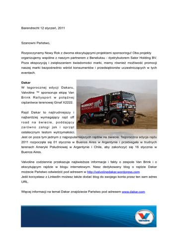 Barendrecht 12 styczeń, 2011 Szanowni Państwo, Rozpoczynamy Nowy Rok z dwoma ekscytującymi projektami sponsoringu! Oba projekty organizujemy wspólne z naszym partnerem z Beneluksu - dystrybutorem Sator Holding BV. Poza ekspozycją i zwiększaniem świadomości marki, mamy również możliwość promocji naszej marki bezpośrednio wśród konsumentów i przedsiębiorstw uczestniczących w tych eventach. Dakar W tegorocznej edycji Dakaru, Valvoline ™ sponsoruje ekipę Van Brink Rallysport w potężnej ciężarówce terenowej Ginaf X2222. Rajd Dakar to najtrudniejszy i najbardziej wymagający rajd off road na świecie, poddający zarówno załogi jak i sprzęt ostatecznym testom wytrzymałości. Jest on poza tym jednym z najpopularniejszych rajdów na świecie. Tegoroczna edycja rajdu 2011 rozpoczęła się 01 stycznia w Buenos Aires w Argentynie i przebiegała w trudnych terenach Ameryki Południowej w Argentynie i Chile, aby zakończyć się 16 stycznia w Buenos Aires. Valvoline codziennie przekazuje najświeższe informacje i fakty o zespole Van Brink i o ekscytującym rajdzie w blogu internetowym. Nasz dedykowany blog o rajdzie Dakar możecie Państwo odwiedzić pod adresem w http://valvolinedakar.wordpress.com Jeśli korzystasz z LinkedIn możesz także dodać blog do swojego konta przez ten sam adres URL. Więcej informacji na temat Dakar znajdziecie Państwo pod adresem www.dakar.com